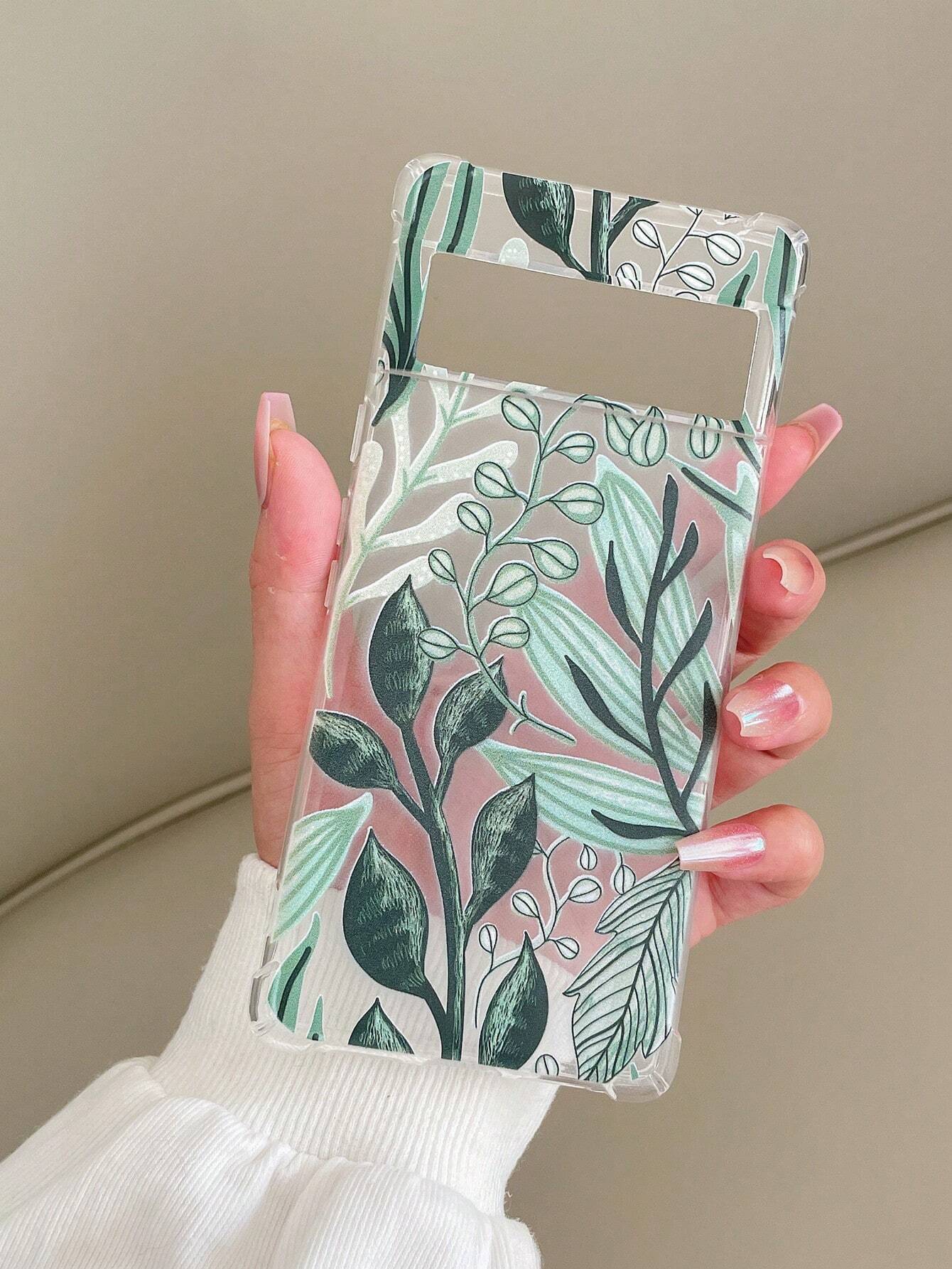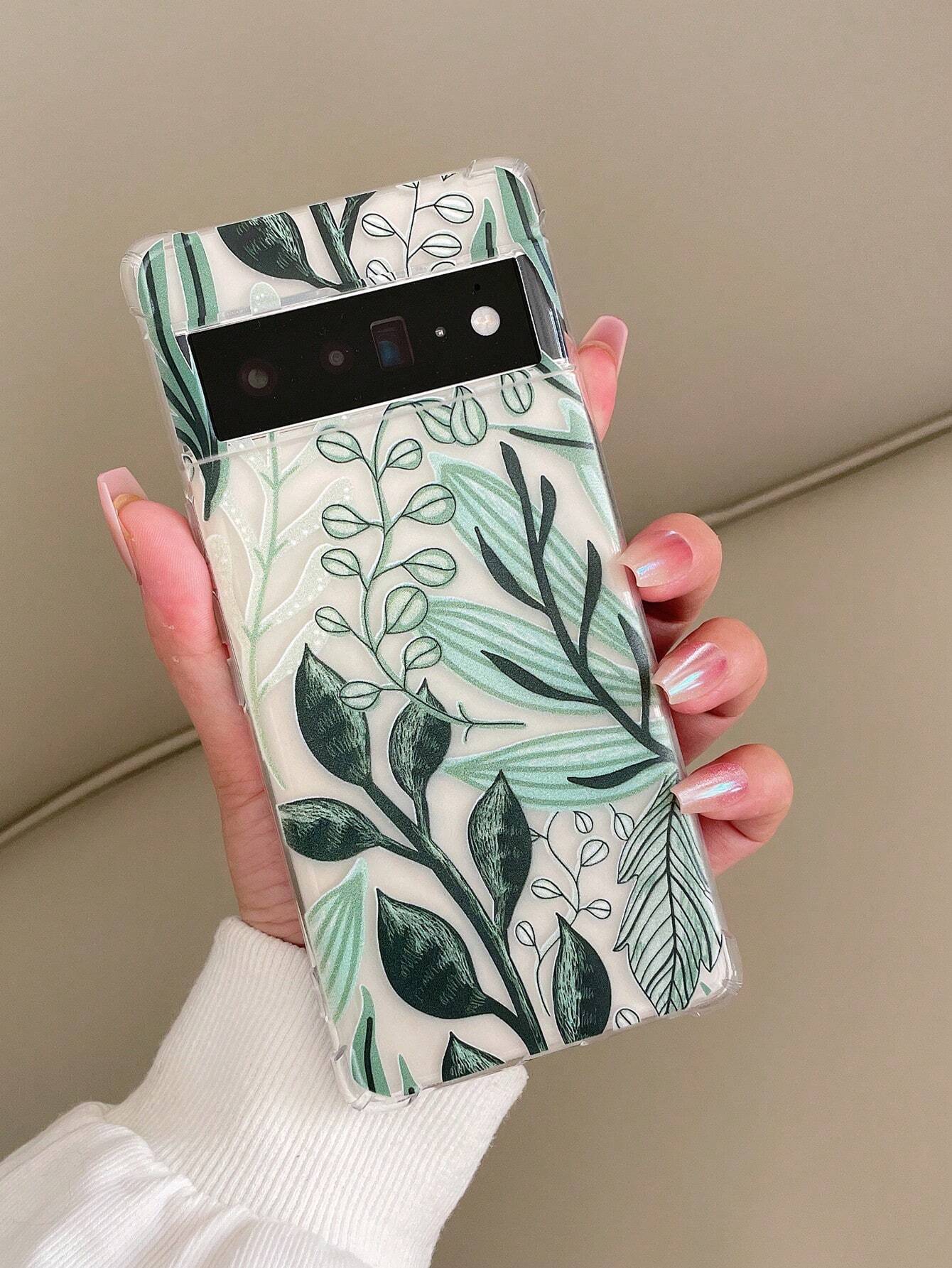 Summer 1pc Minimalist High-Transparency TPU Four-Corner Anti-Drop Soft Case Hollowed-Out Painted Green Leaves Printed Phone Protective Shell, Compatible With Pixel 7 Pro, IPhone 15 Pro And Models