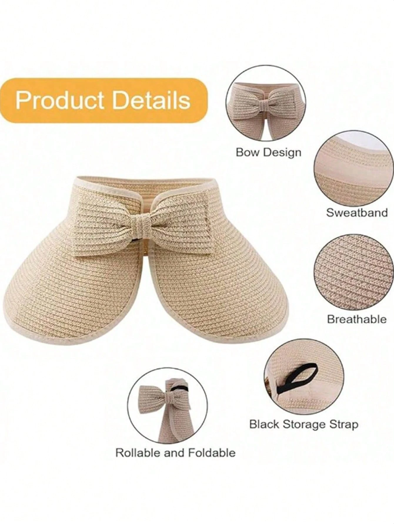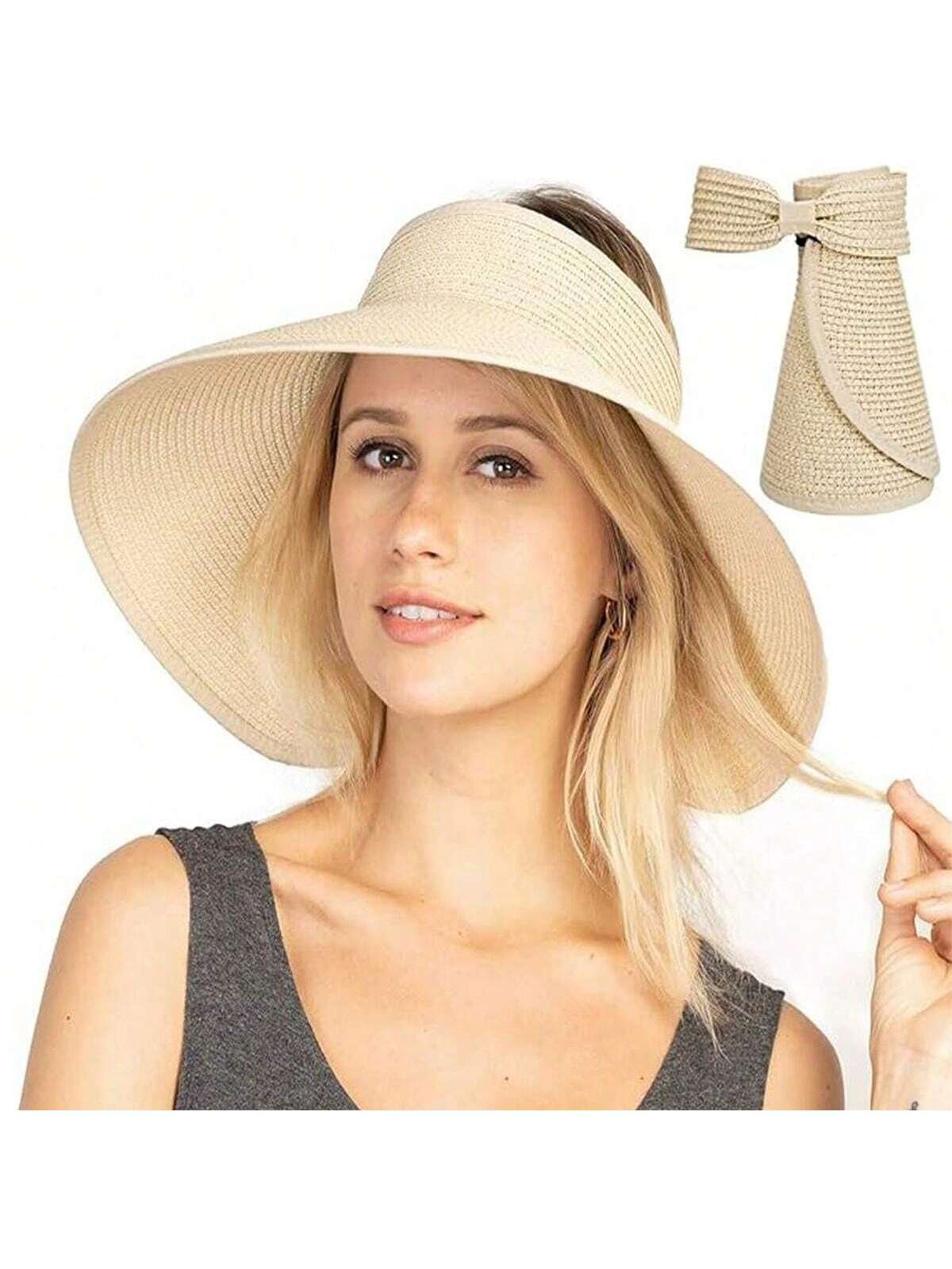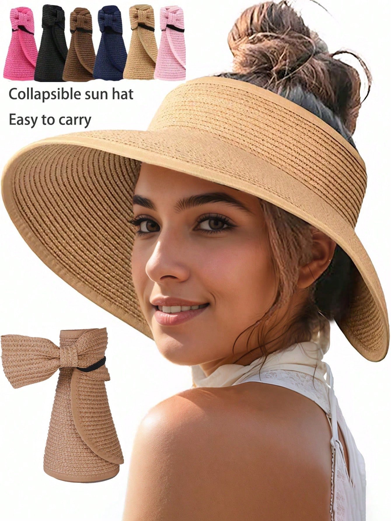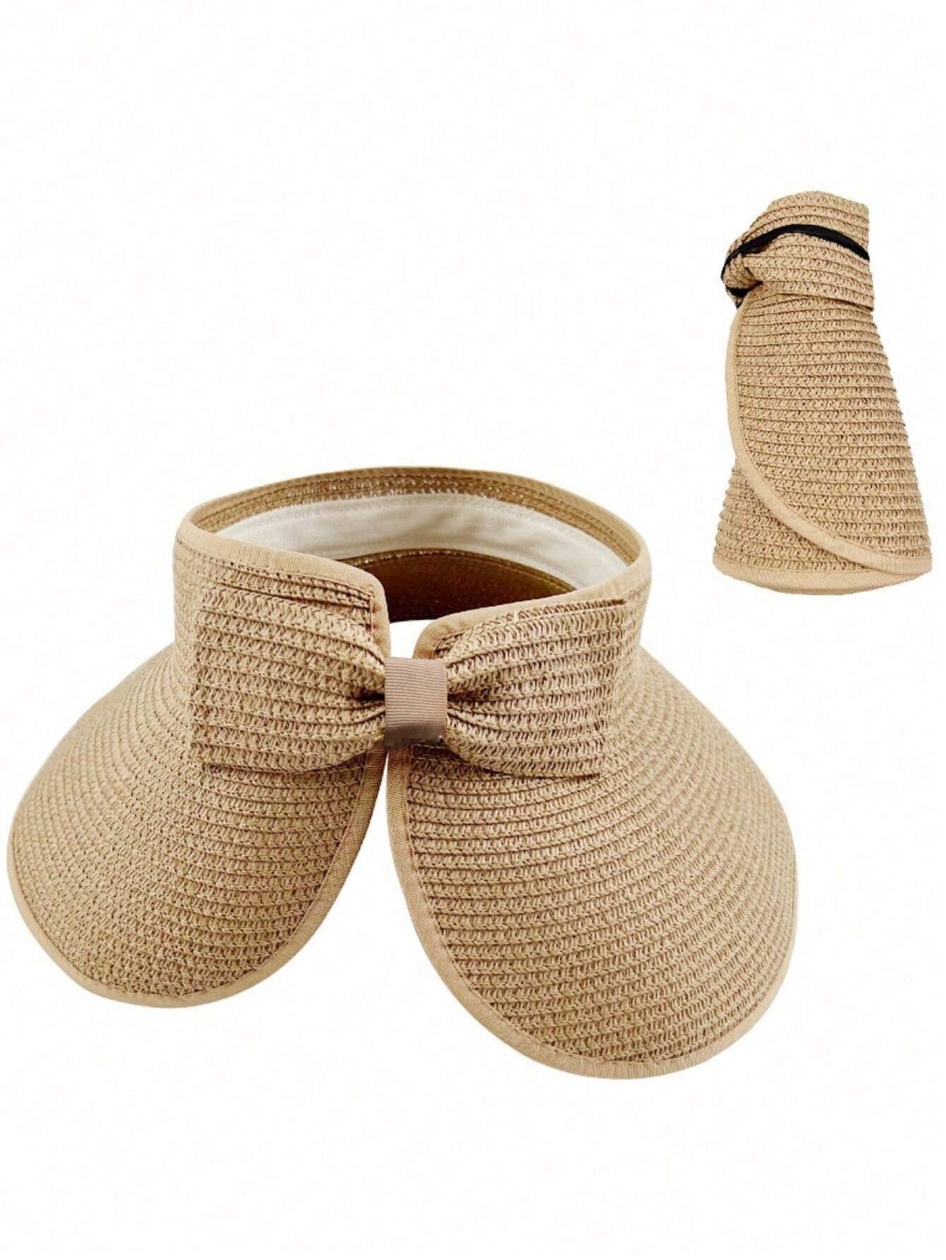 Sun Visor Hats For Women Wide Brim Straw Roll-Up Ponytail Summer Beach Hat UV UPF Packable Foldable Travel Boho Bow