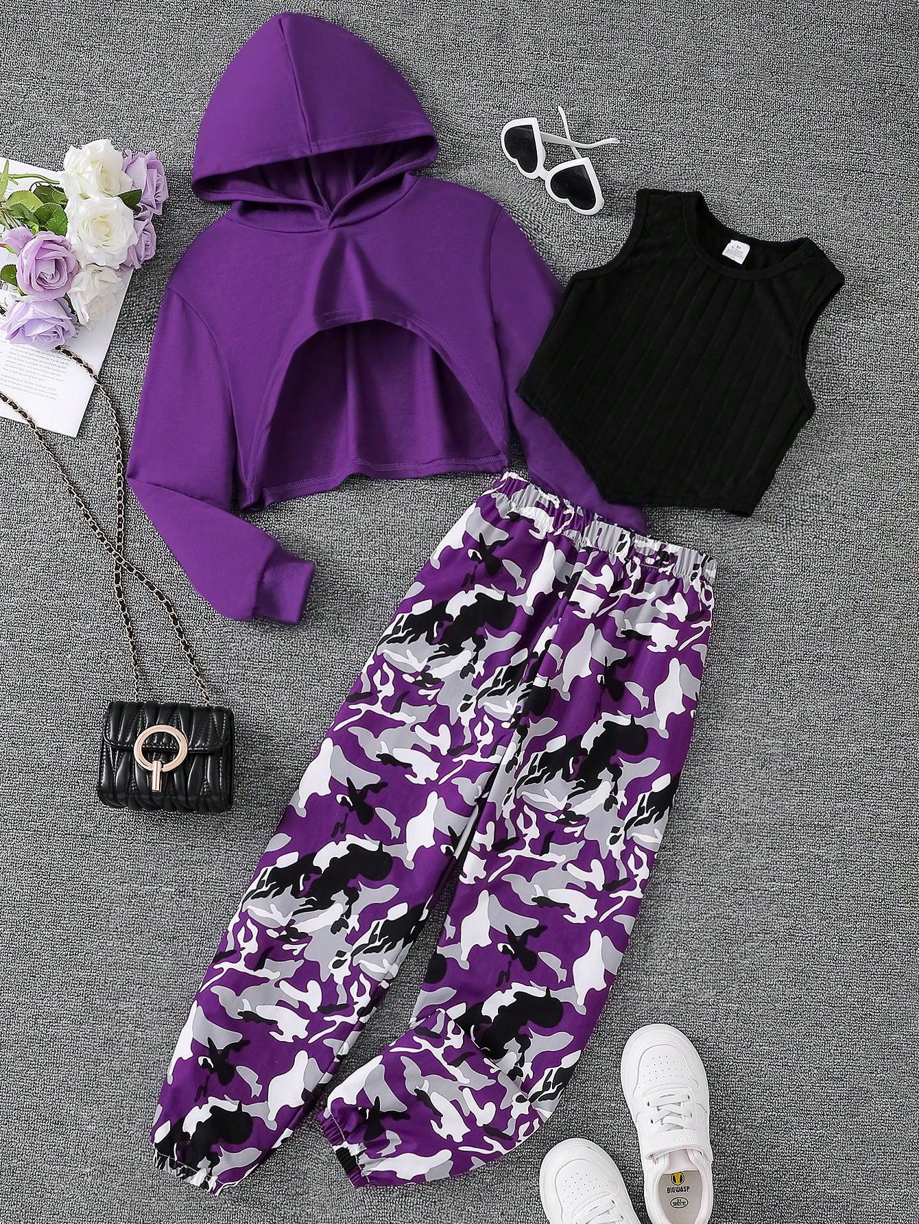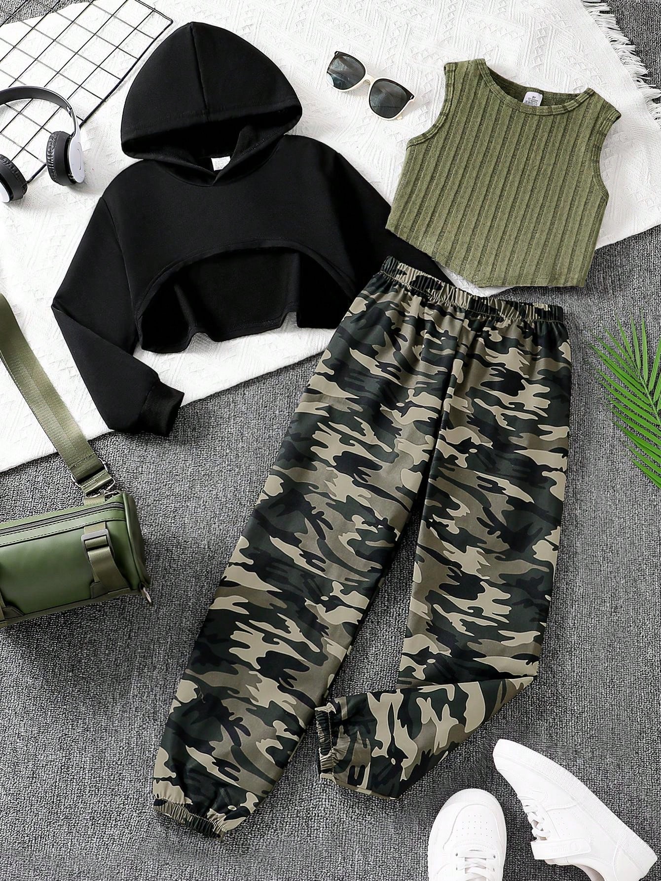 Tween Girl 3pcs/Set Outfit Set For Spring/Autumn: Solid Color Hooded Short Sweatshirt Crop Top & Ribbed Round Neck Short Camisole Undershirt & Elastic Waist Camo Cargo Long Pants, Comfortable & Soft Autumn Suit For Tween Girls