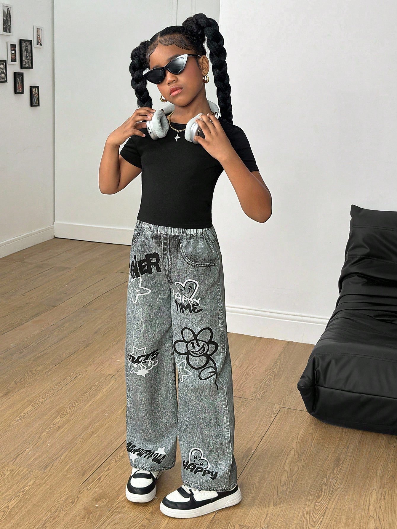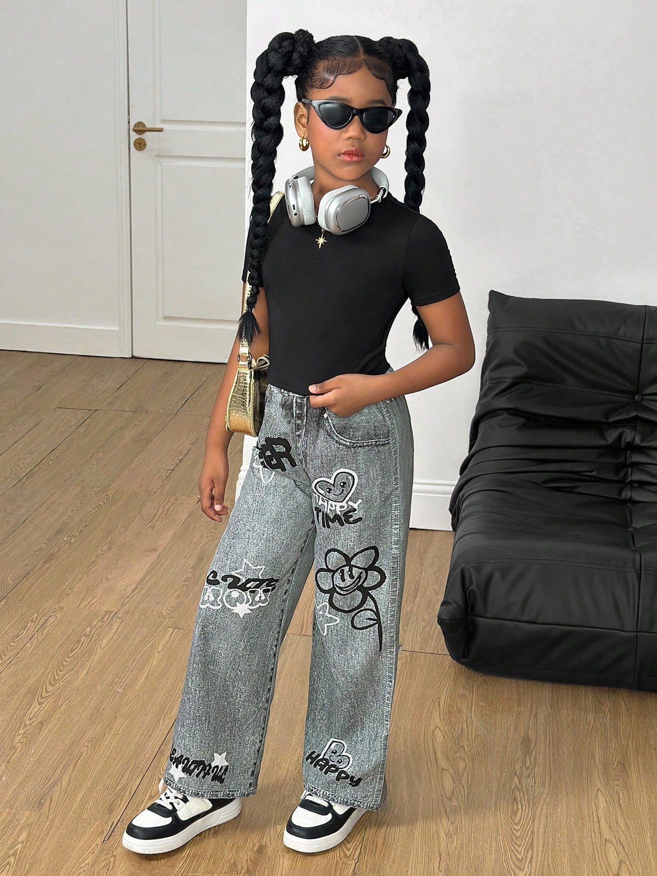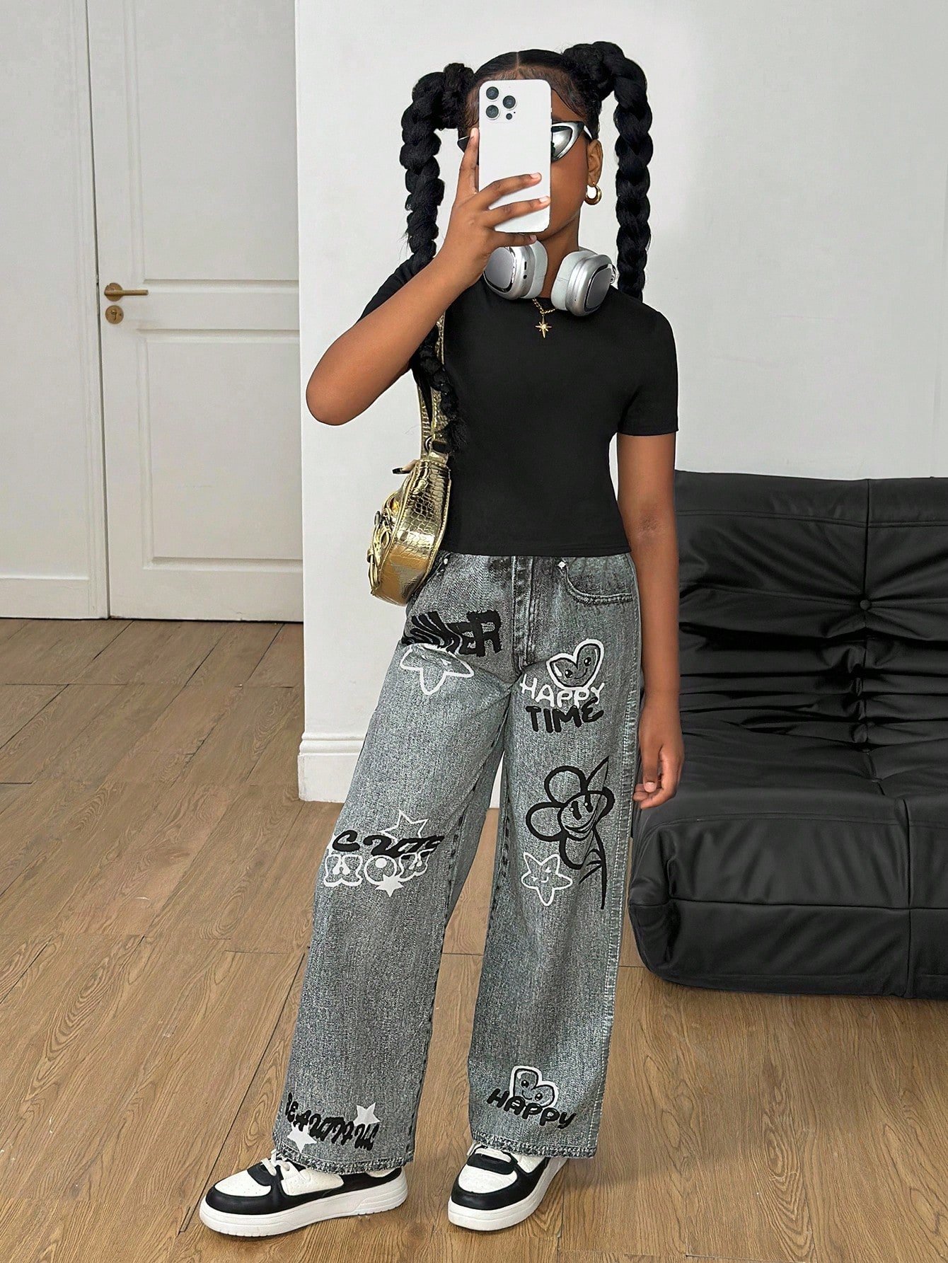 Tween Girl Black Short Sleeve T-Shirt With English Letter & Star Print, Black Pants 2 Pieces Set