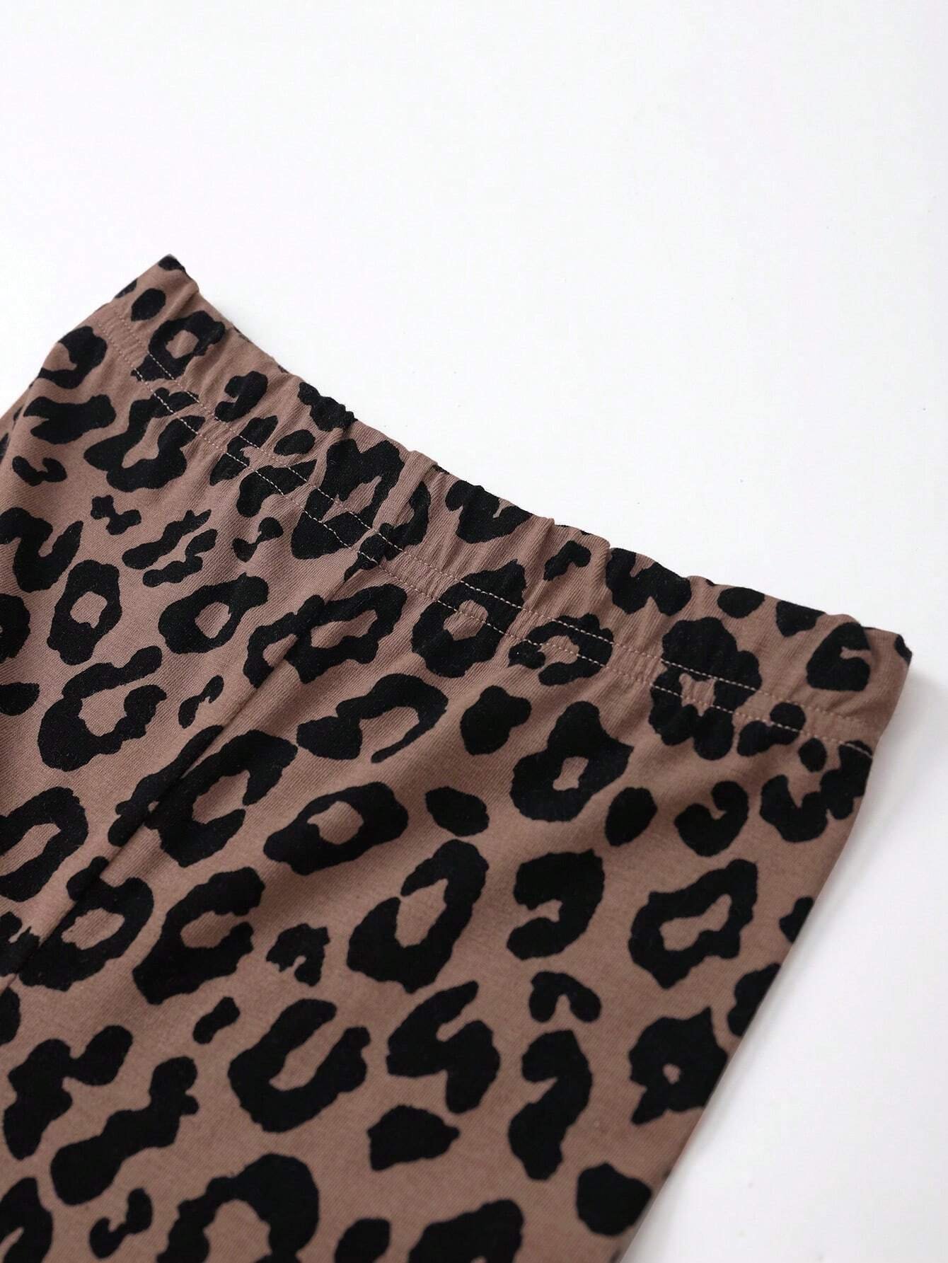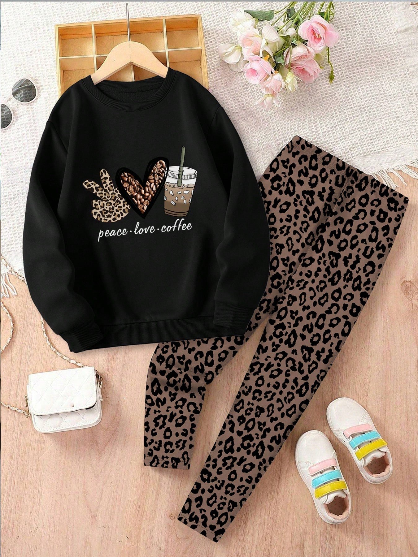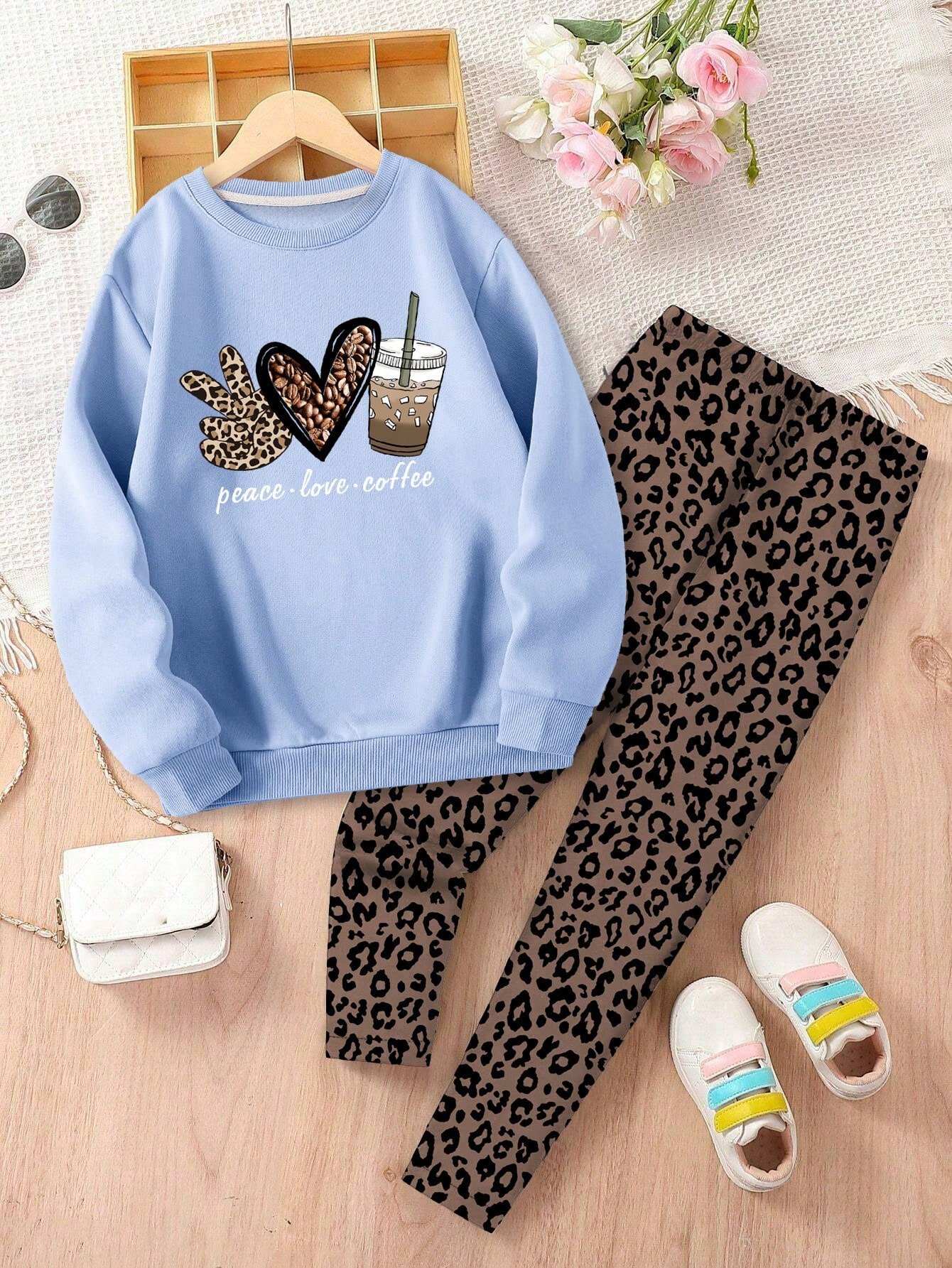 Tween Girls Leopard Print Heart & Letter Design Cozy Loose Sweatshirt And Leopard Pattern Comfortable Pants Set