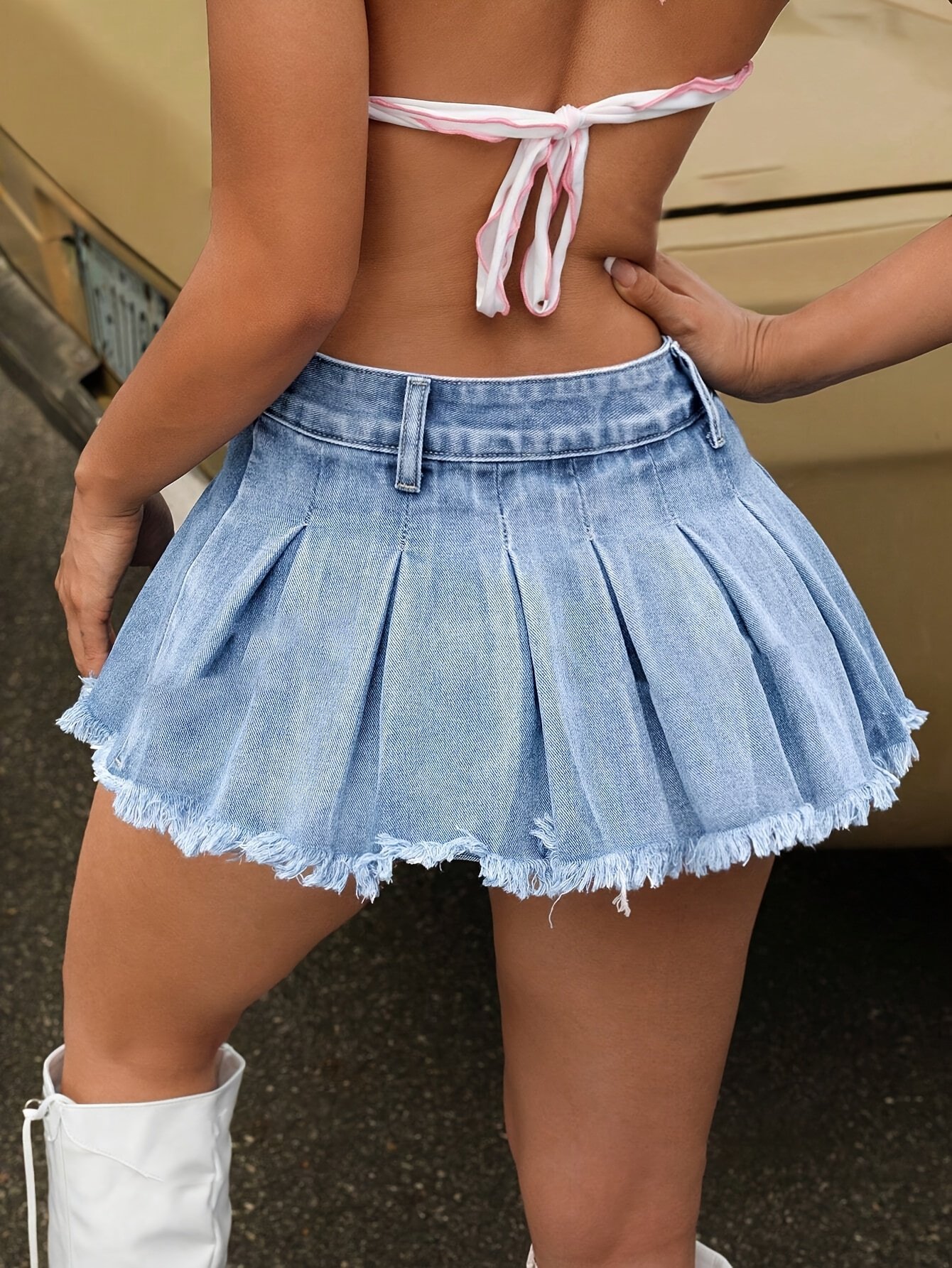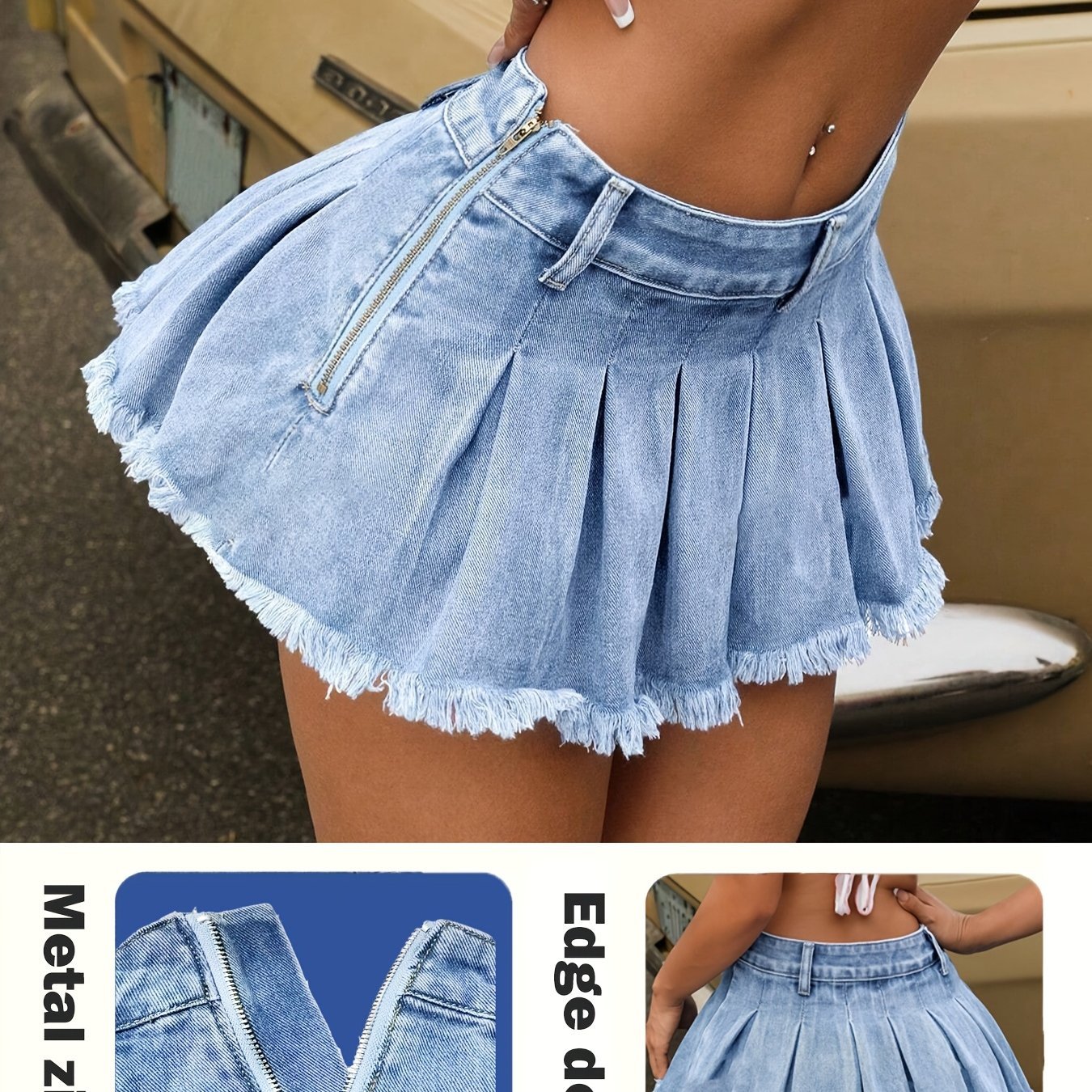 Vintage Fashion Raw Hem Zipper Women's Denim Pleated Mini Skirt