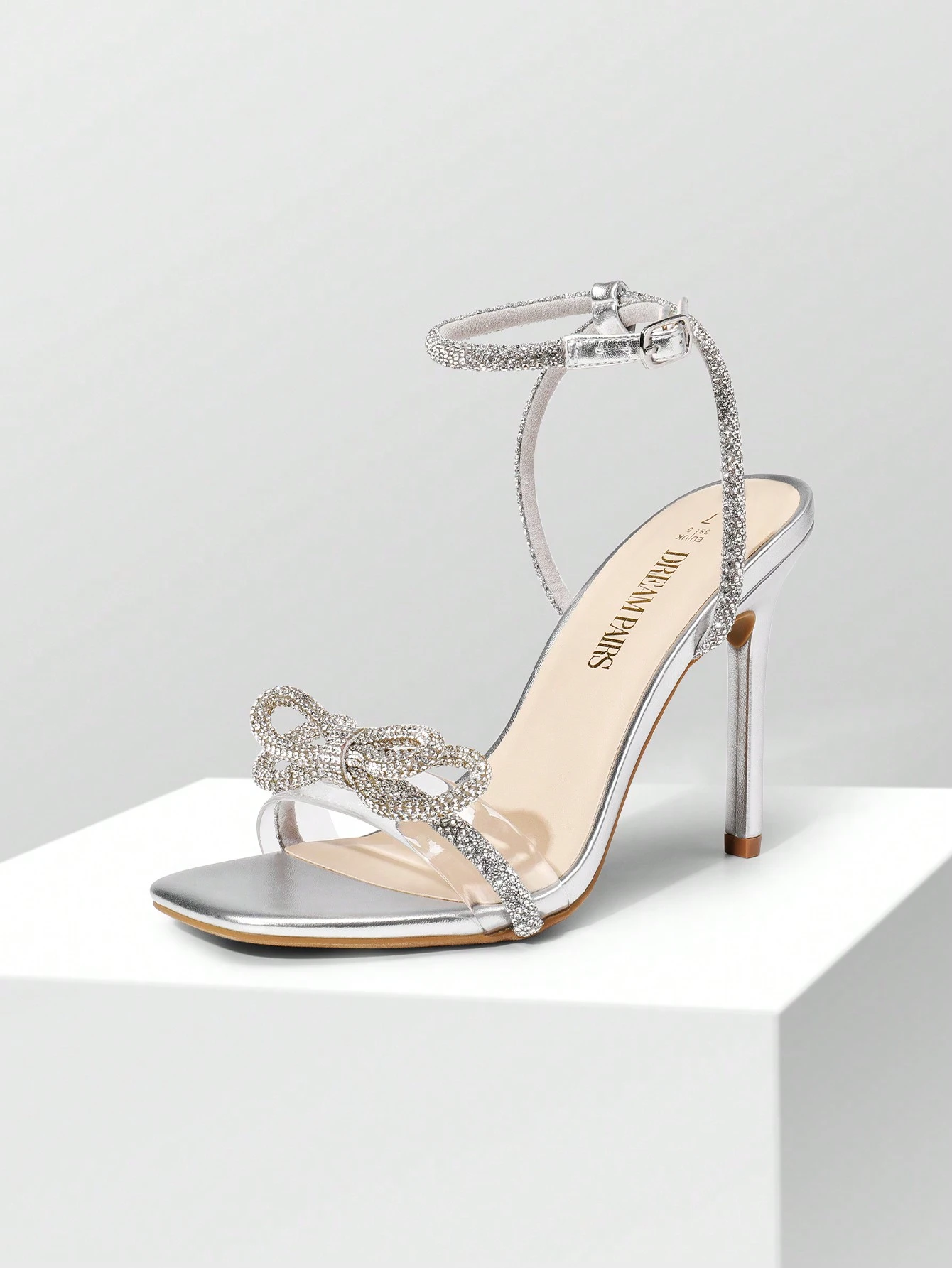 Women Bowknots Crystal Heeled Sandals Fashion Square Toe Rhinestone Decor Ankle Strap Heels For Sweet-Meets-Sassy Styles, For Party Wedding Prom