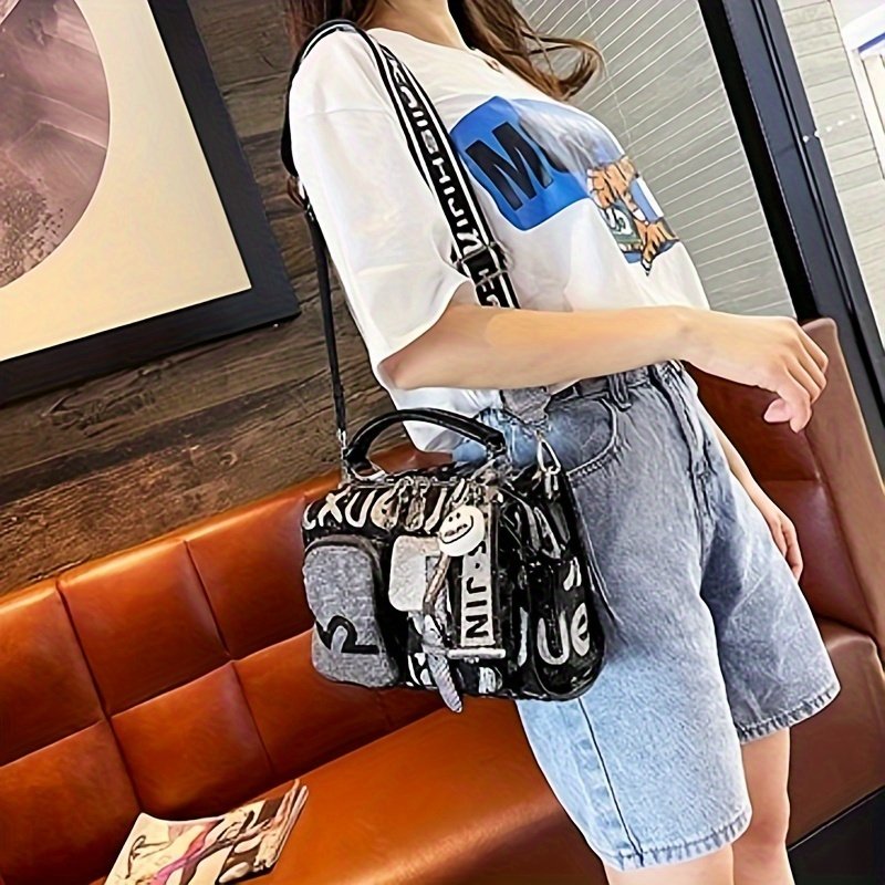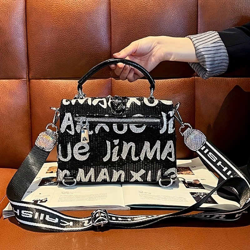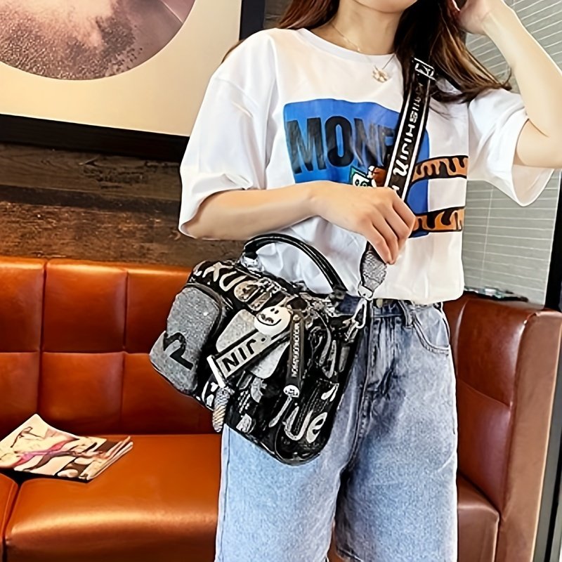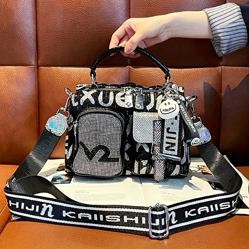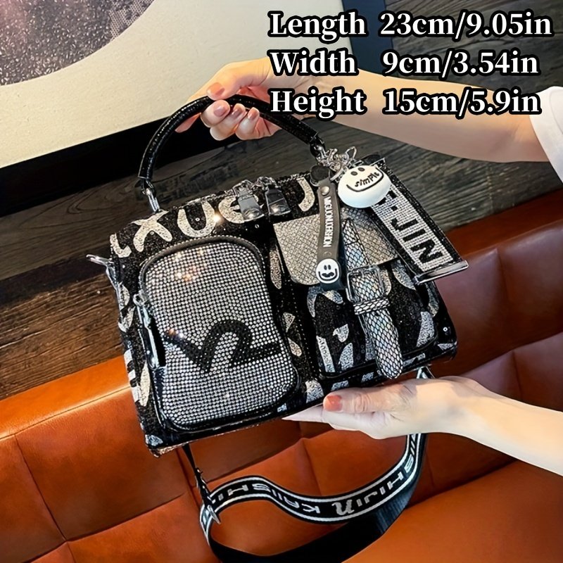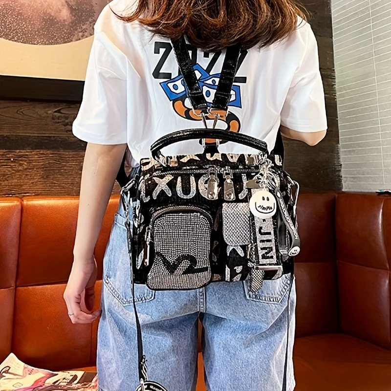 Women'S Fashion Backpack Handbag with Rhinestone Embellishment, Adjustable Strap, Zipper Closure, Polyester Lining, Solid Color, Spacious Crossbody Satchel for Occasions – Black