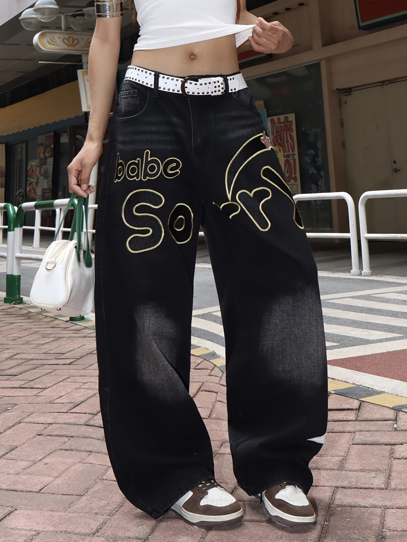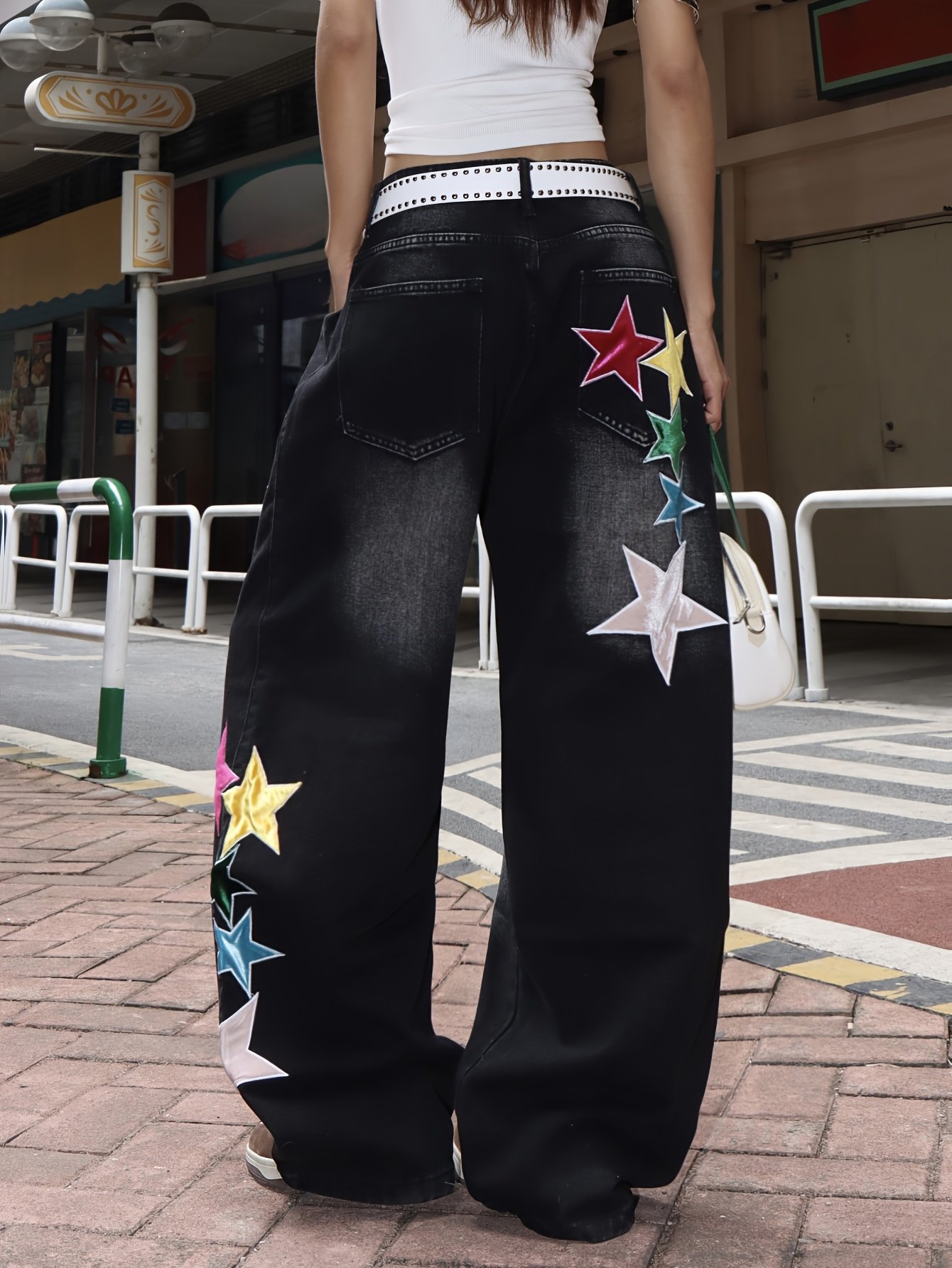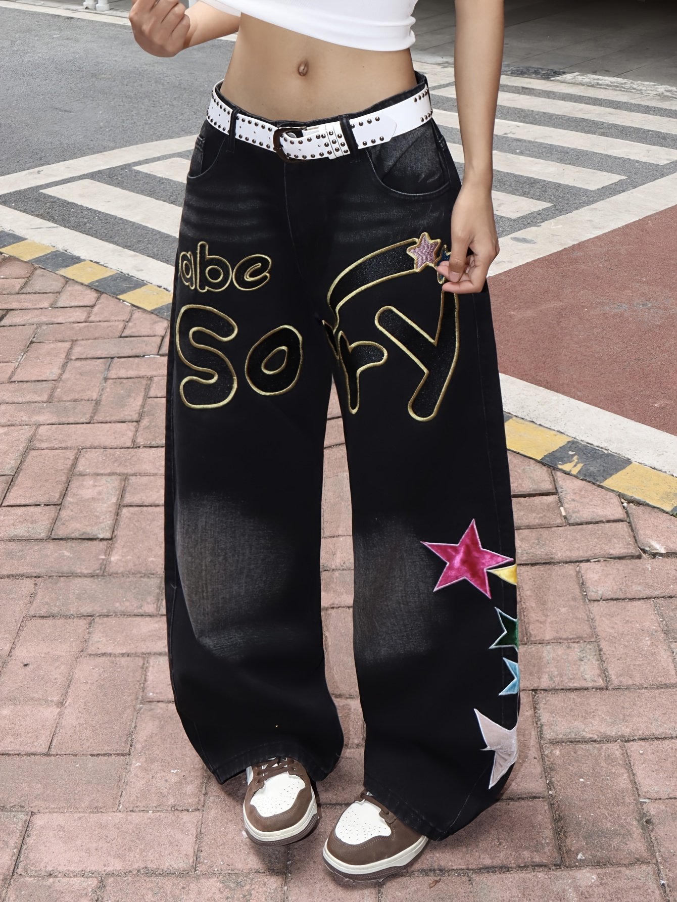 Women'S High-Waist Wide-Leg Jeans with Star Embroidery – Vintage Washed Denim, Loose Fit, Zipper Fly, Geometric Pattern, All-Season Casual Streetwear, High Waisted Jeans, Streetwear Fashion, Relaxed Fit Pants, Durable Fabric