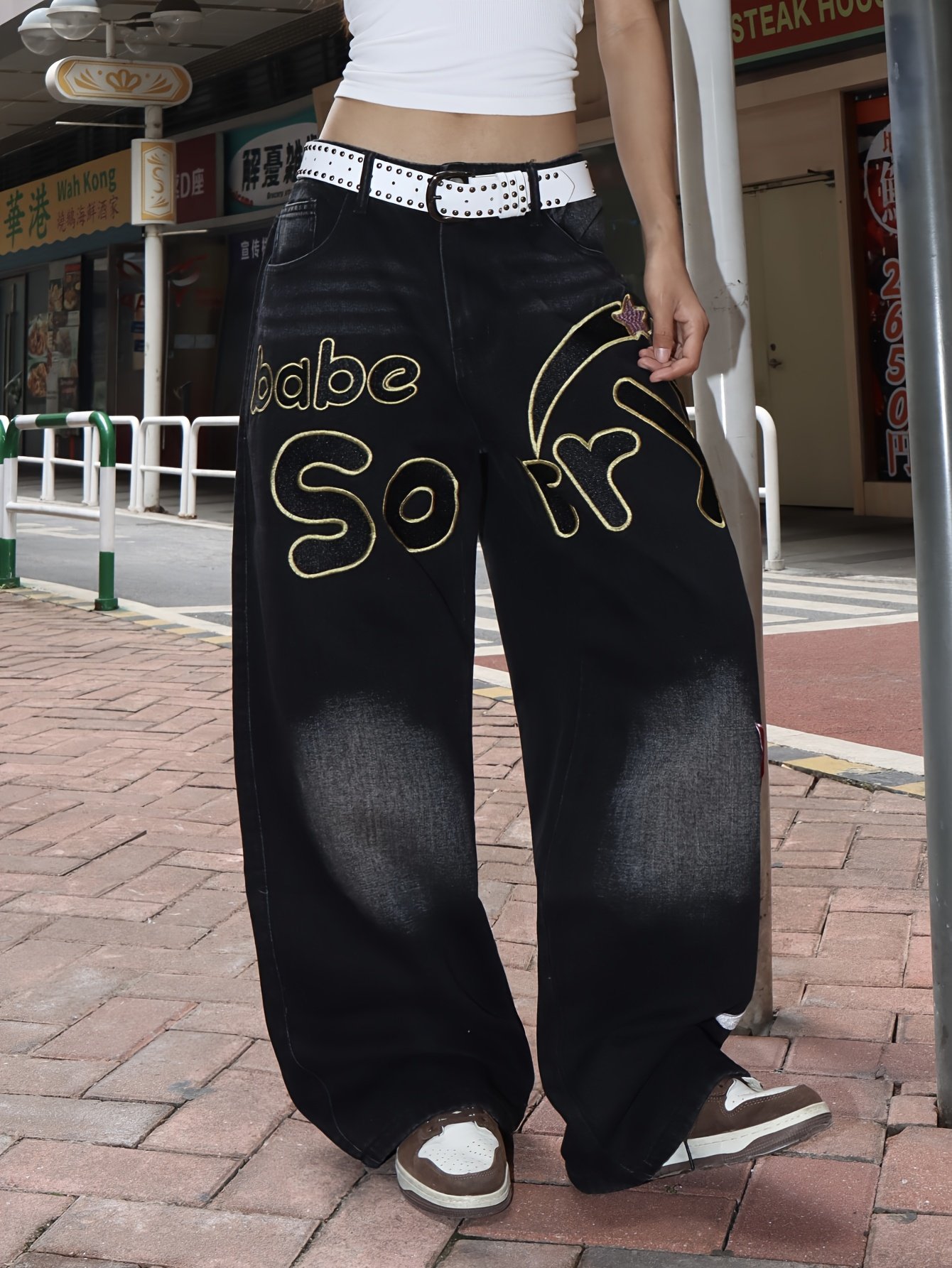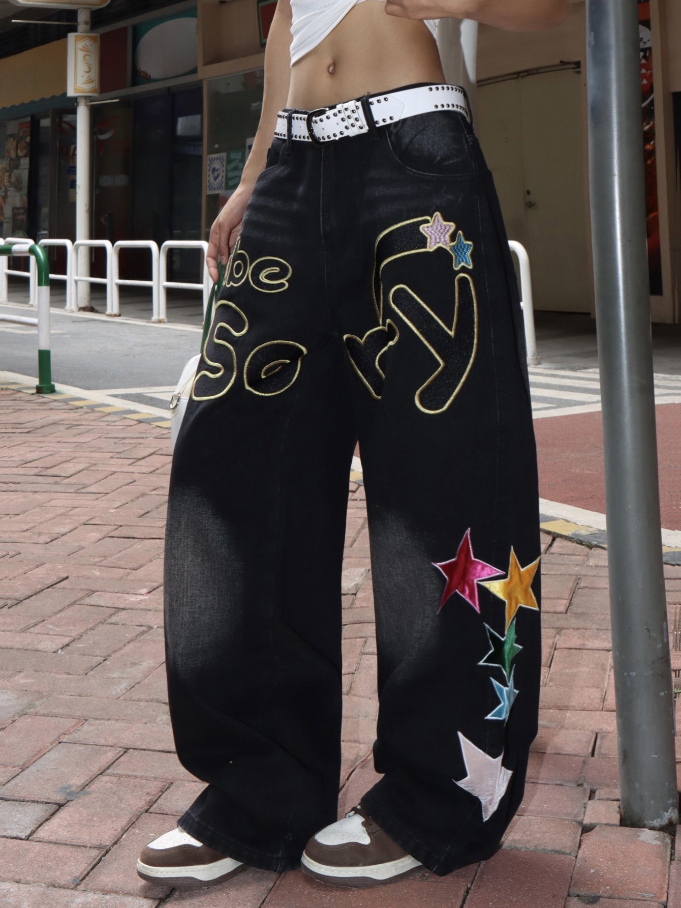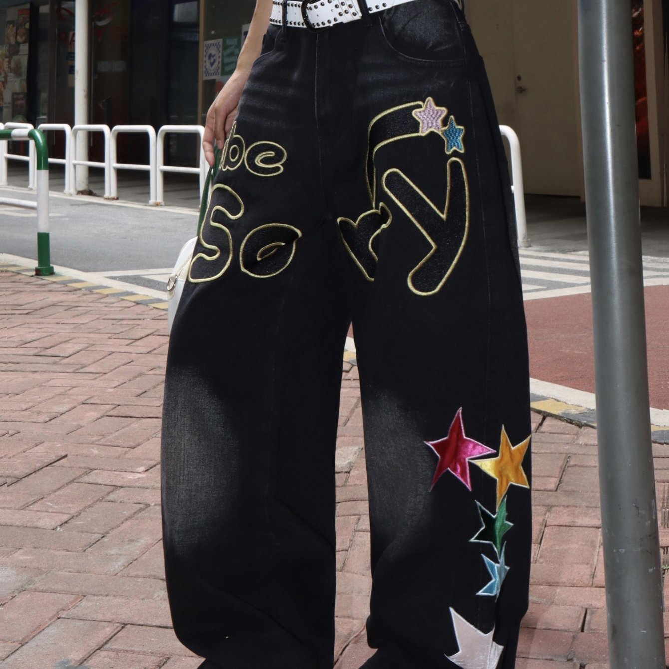 Women'S High-Waist Wide-Leg Jeans with Star Embroidery – Vintage Washed Denim, Loose Fit, Zipper Fly, Geometric Pattern, All-Season Casual Streetwear, High Waisted Jeans, Streetwear Fashion, Relaxed Fit Pants, Durable Fabric