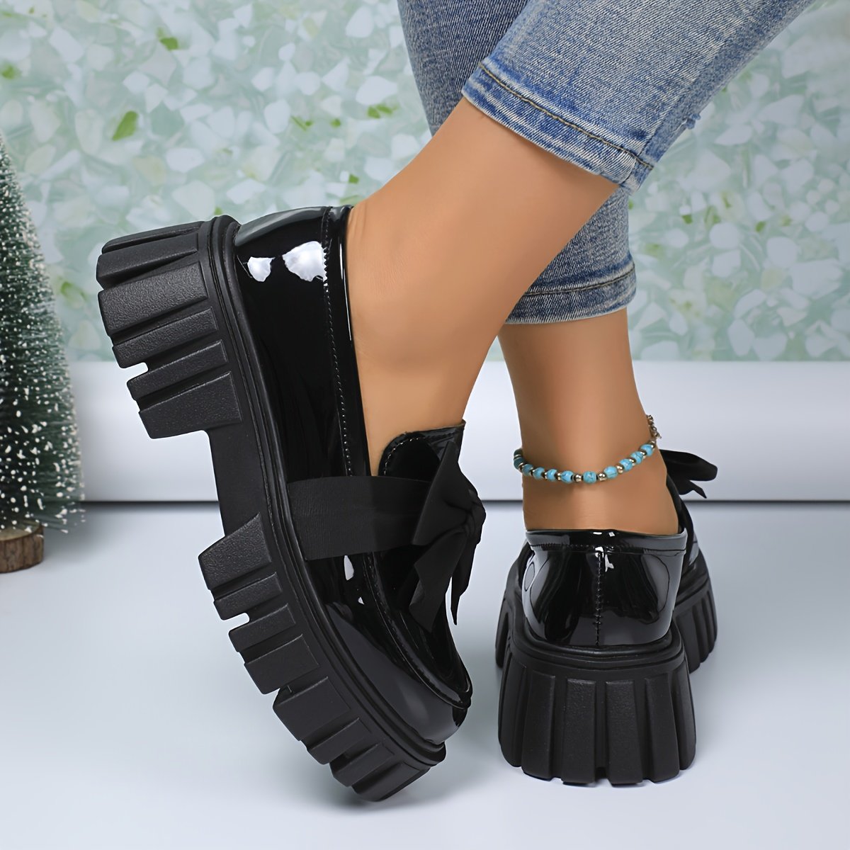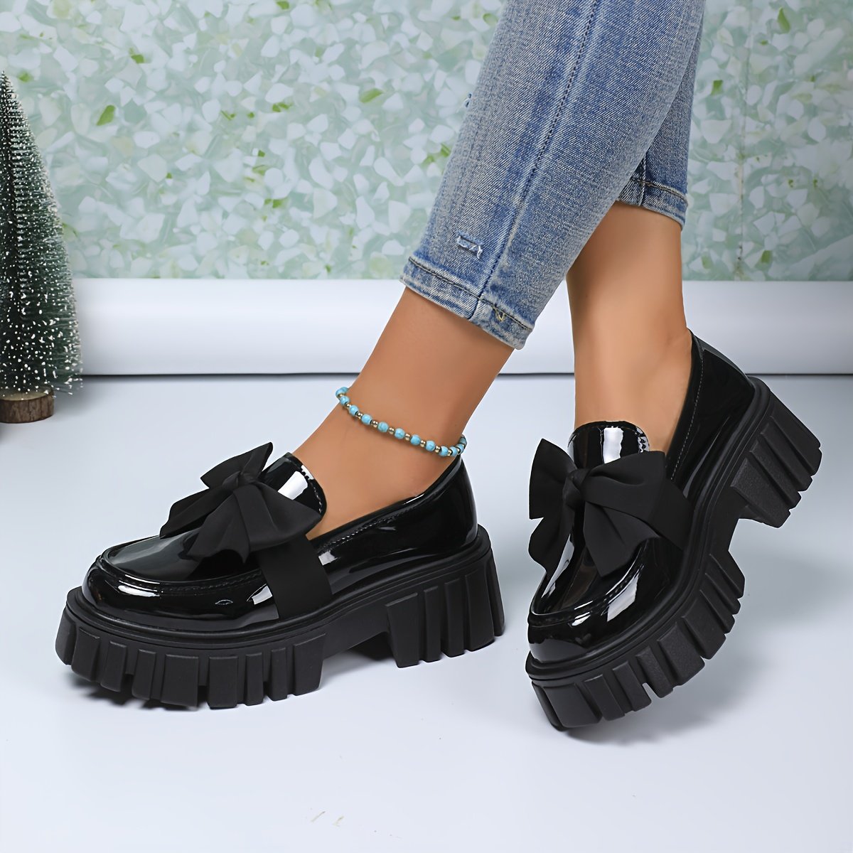 Women'S Slip-On Loafers with Thick Platform Sole – Glossy Black Shoes, Cushioned Insole & Non-Slip Rubber Outsole – All-Season Formal & Casual Footwear for Everyday, Office, Parties – Easy Slip-On Design, Office Wear, Elegant Style, Comfortable Fit, Fashi