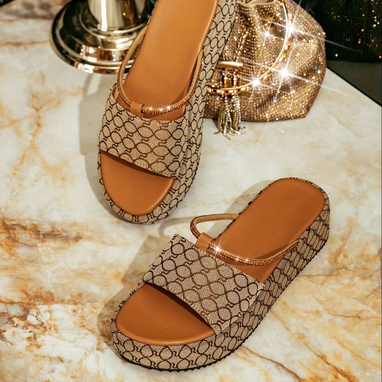 Women's Slip-On Platform Sandals – Beige & Brown Retro Open-Toe shoes with Cushioned Insole, Slip resistant Rubber Sole for Beach, Party, Everyday – All-Season Slip-Ons, Party Footwear, Rhinestone Embellished