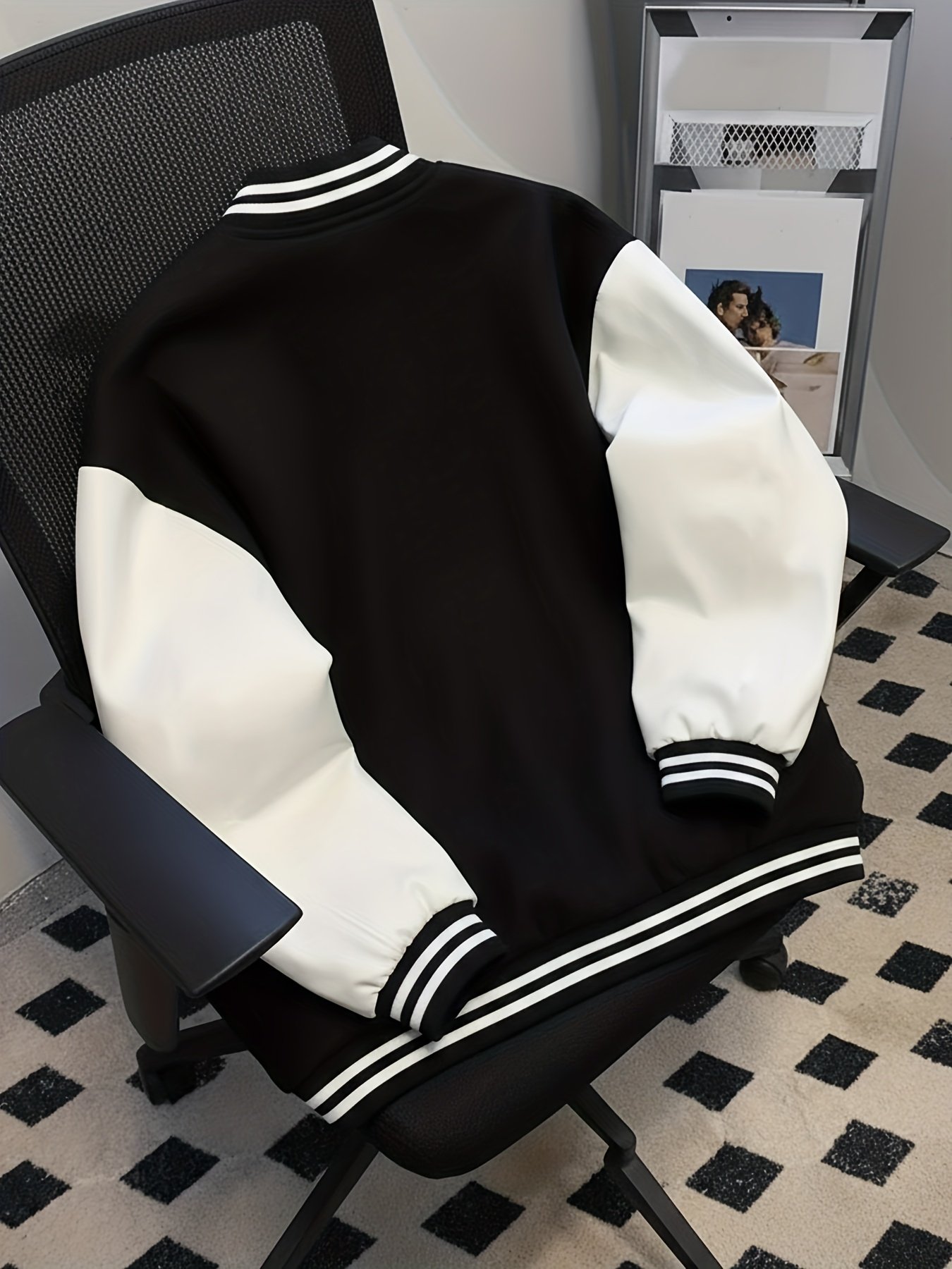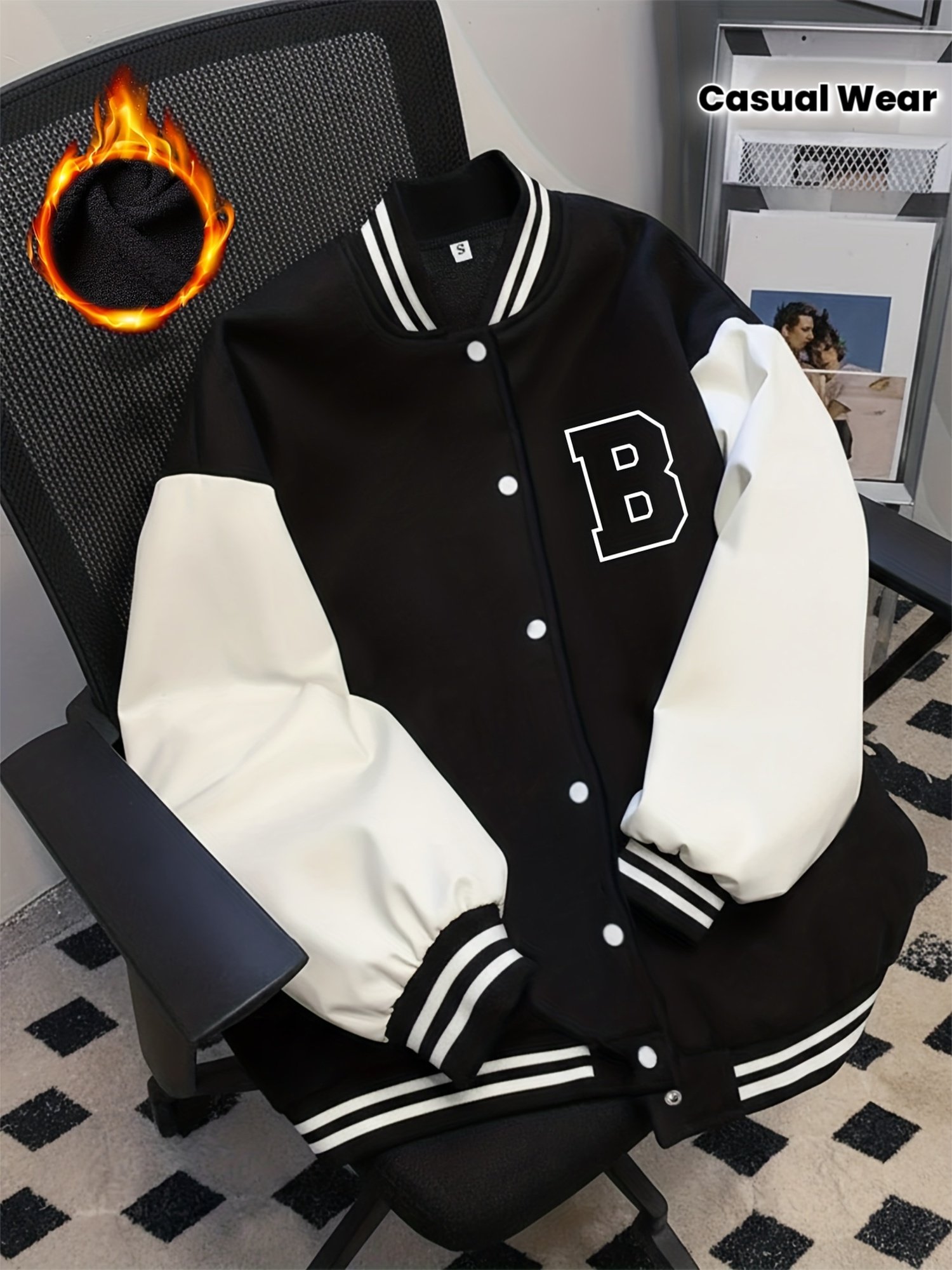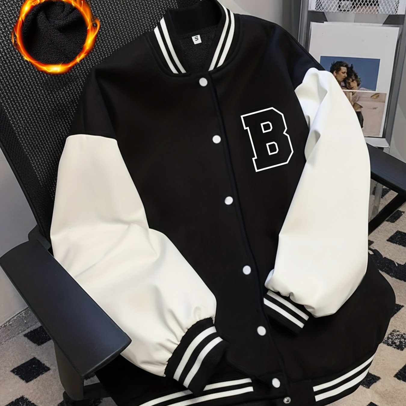 Women'S Vintage Baseball Jacket, Black And White Collegiate Style Coat, Featuring a 'B' Letter Print Design, Fleece-Lined Without a Zipper, Suitable for Casual Streetwear, Machine Washable, Trendy Street Style