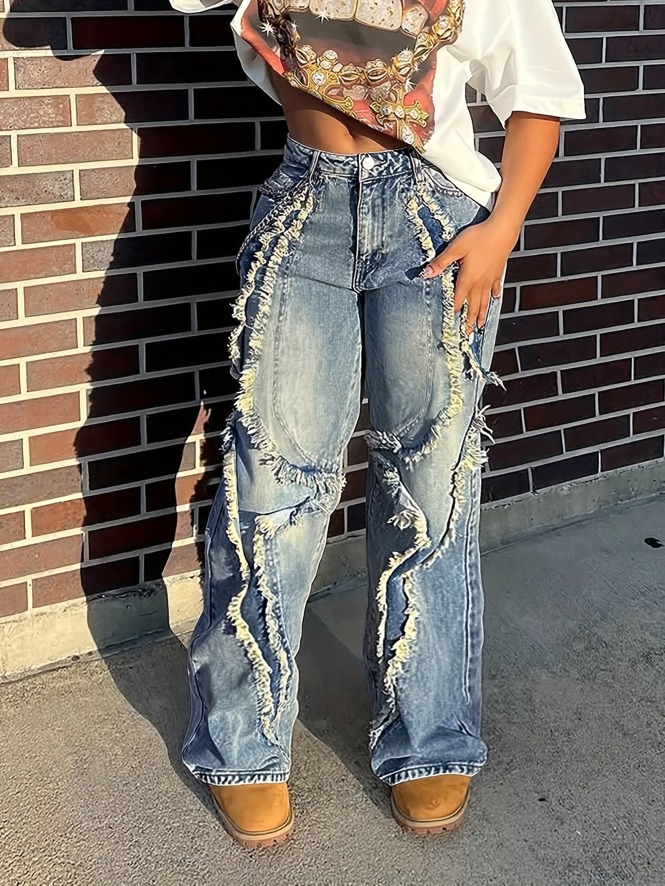 Women'S Y2K 90s Retro Fringe Distressed Straight Leg Jeans – Non-Stretchy Straight Leg Pants with Fringe Hem & Fringe Pocket, All-Season Casual to Party Outfits