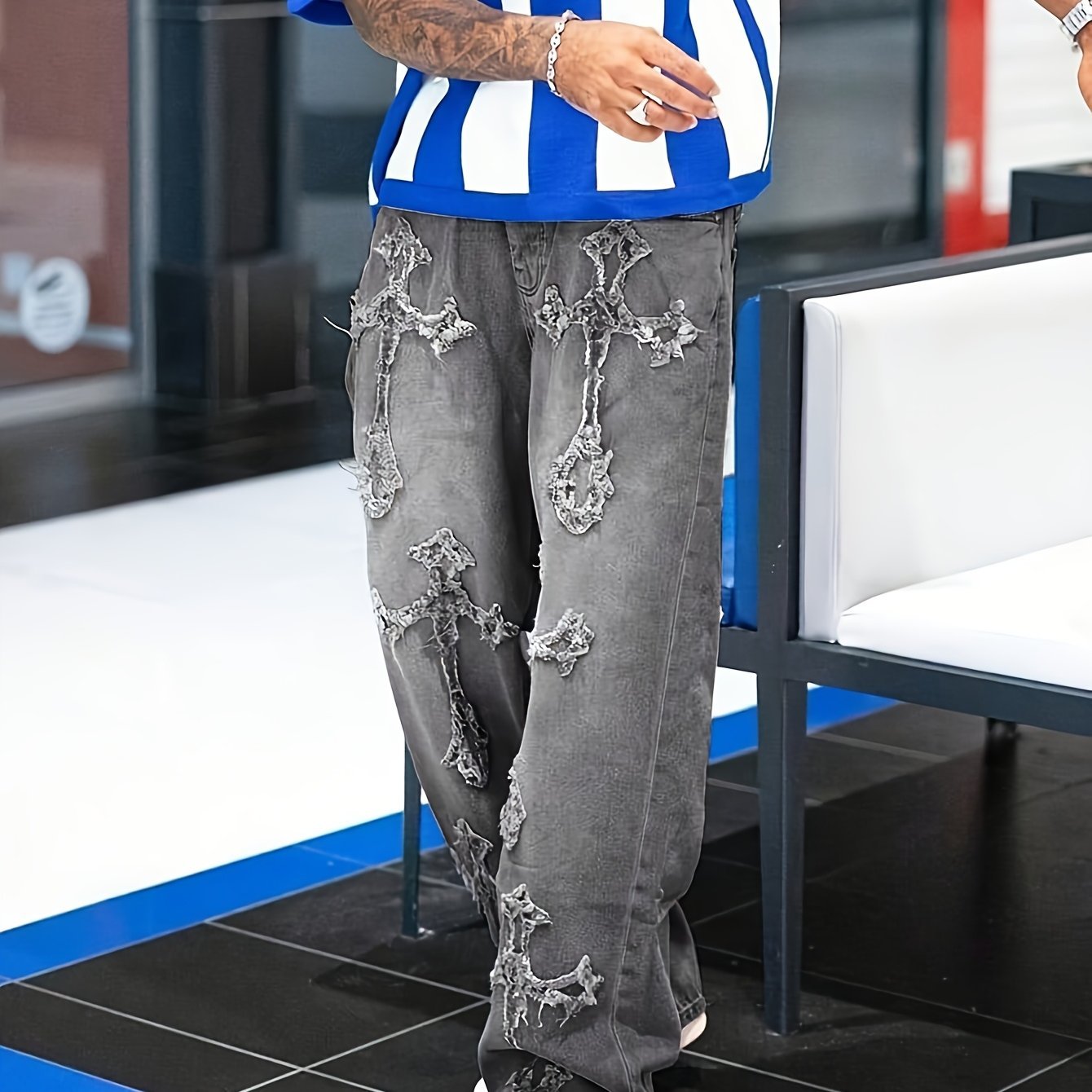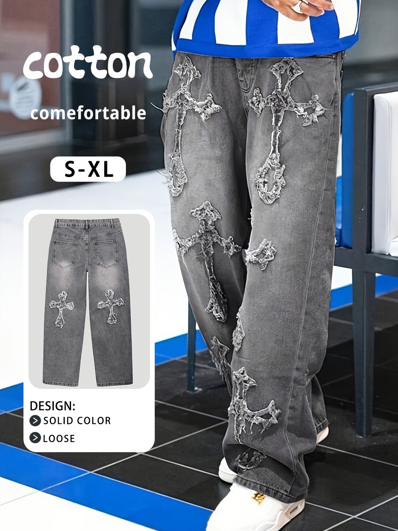 American Retro Jacquard Cross Star Print Men's Jeans, Light Luxury Niche Streetwear Loose Fit Straight Leg Pants, Jeans Special for Men, White Strech Jeans Regular Fit for Men, Cool Jeans, Mens Drawstring Jeans, Jeans for Men Plus Size, Cargo Jeans Pants