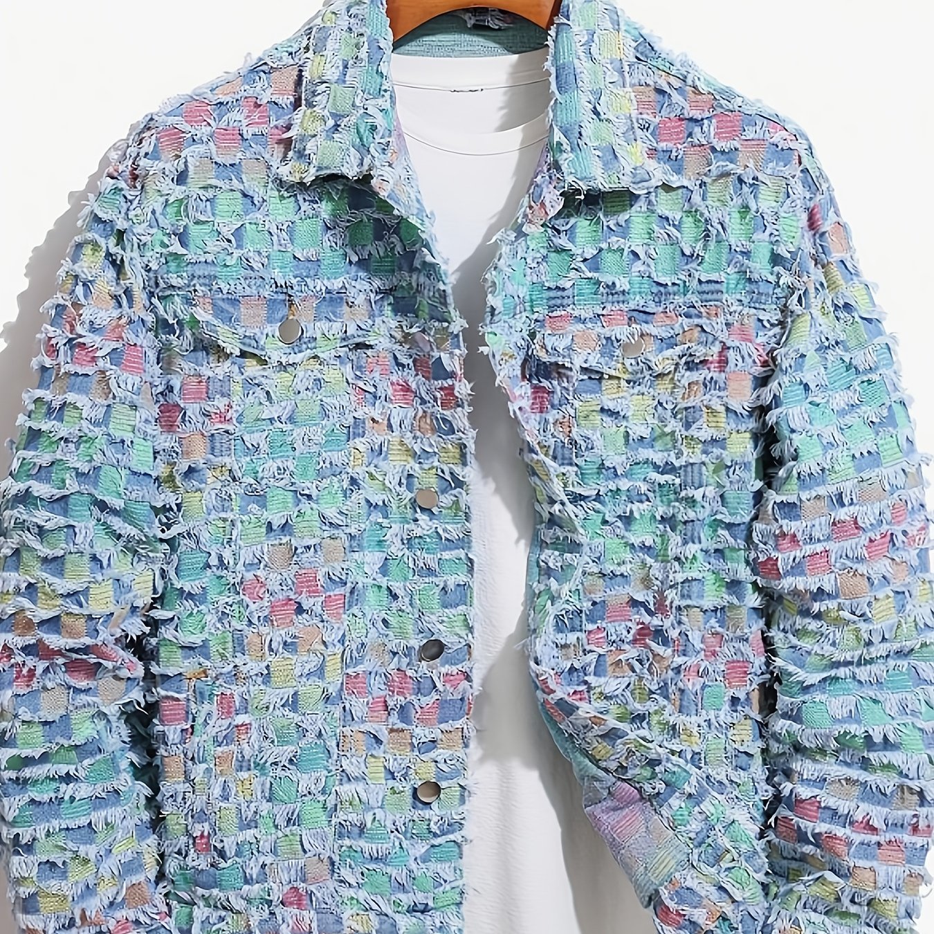 Men's Trendy Plaid Fringe Color-block Denim Jacket