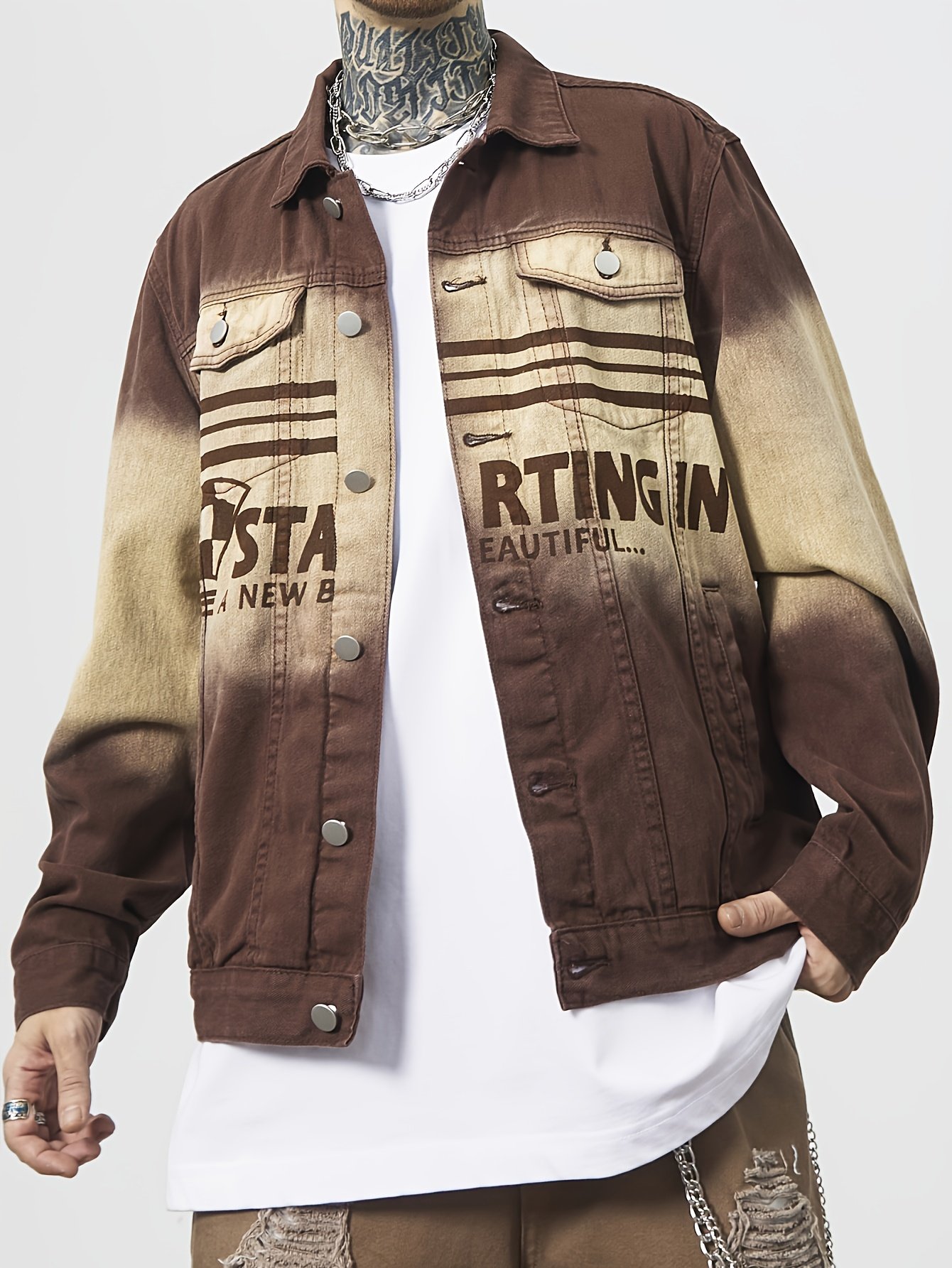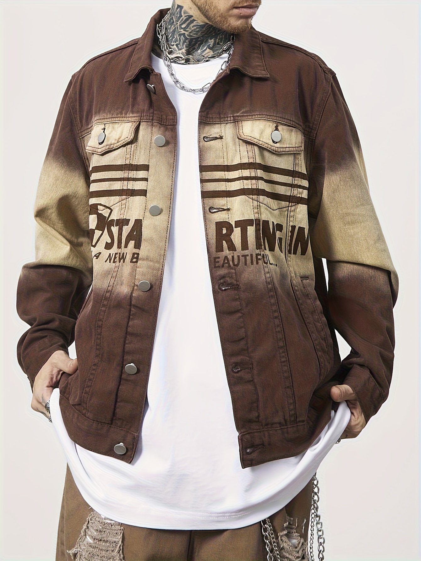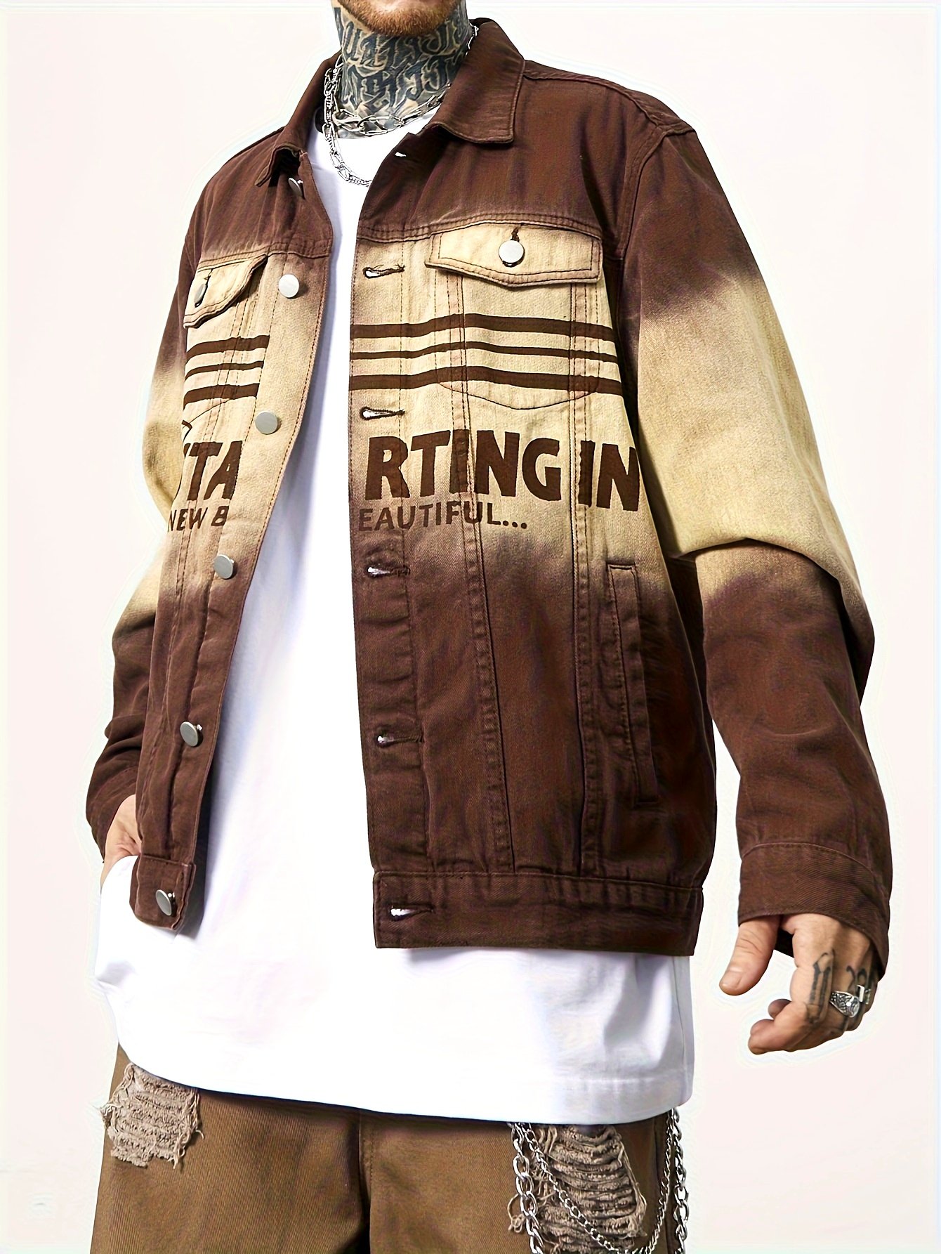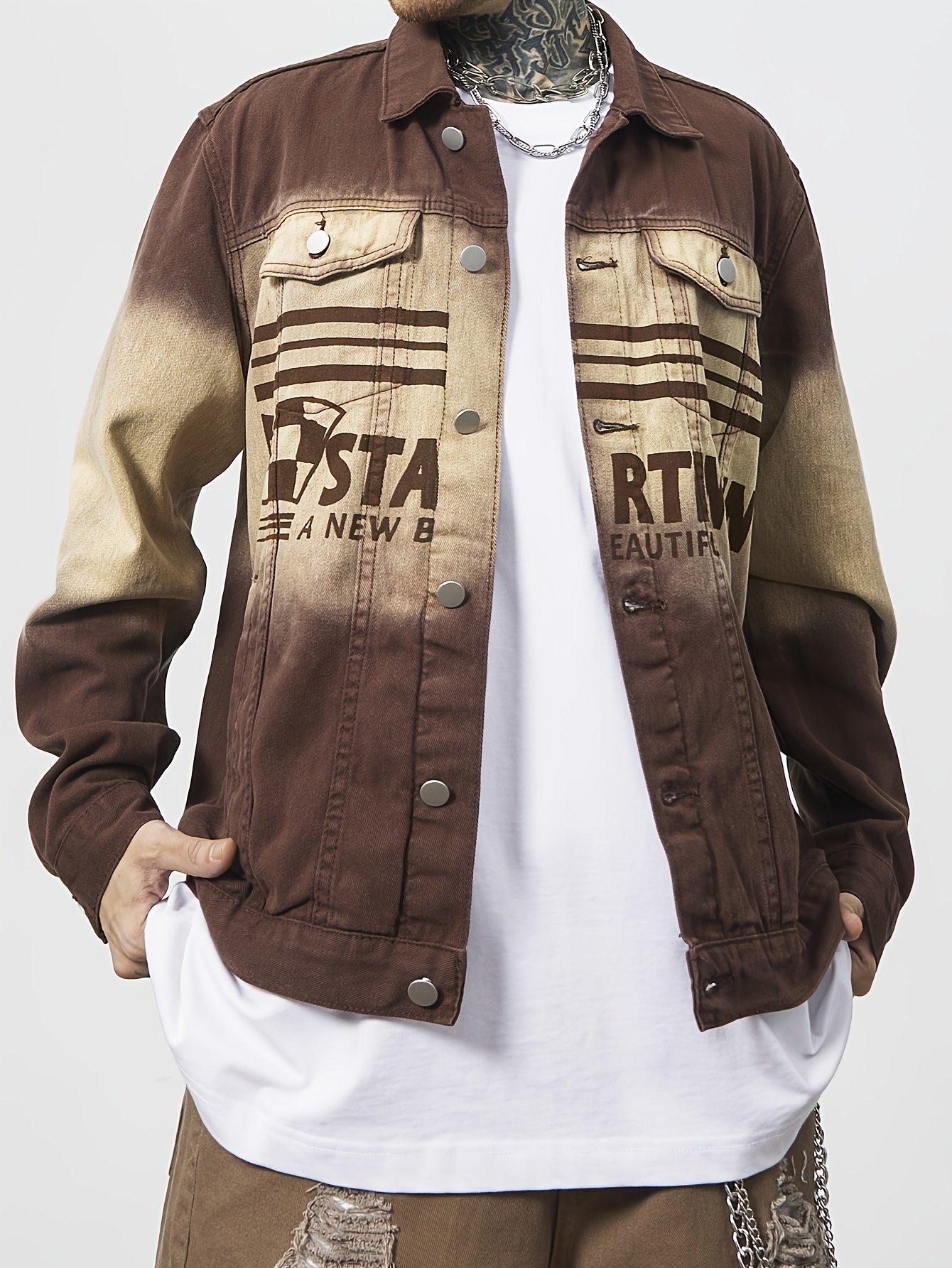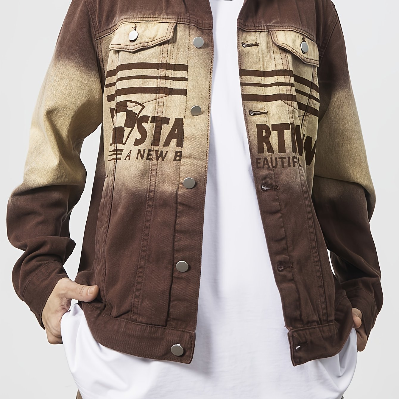Men'S Vintage Washed Distressed Gradient Denim Jacket – Brown to Gradient, Loose Fit Streetwear Coat with Chest Pocket, Single-Breasted Button Closure