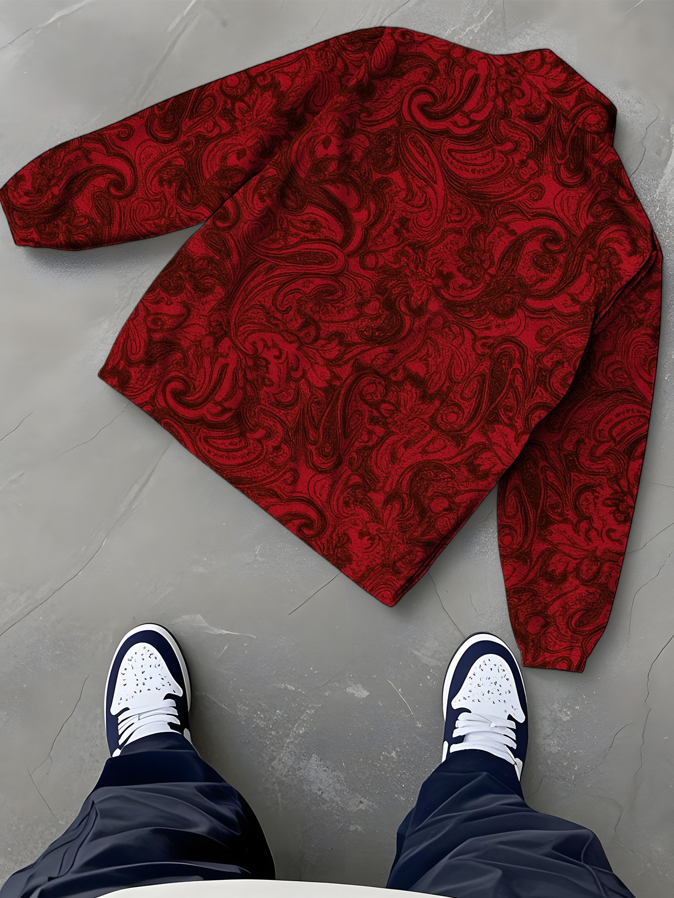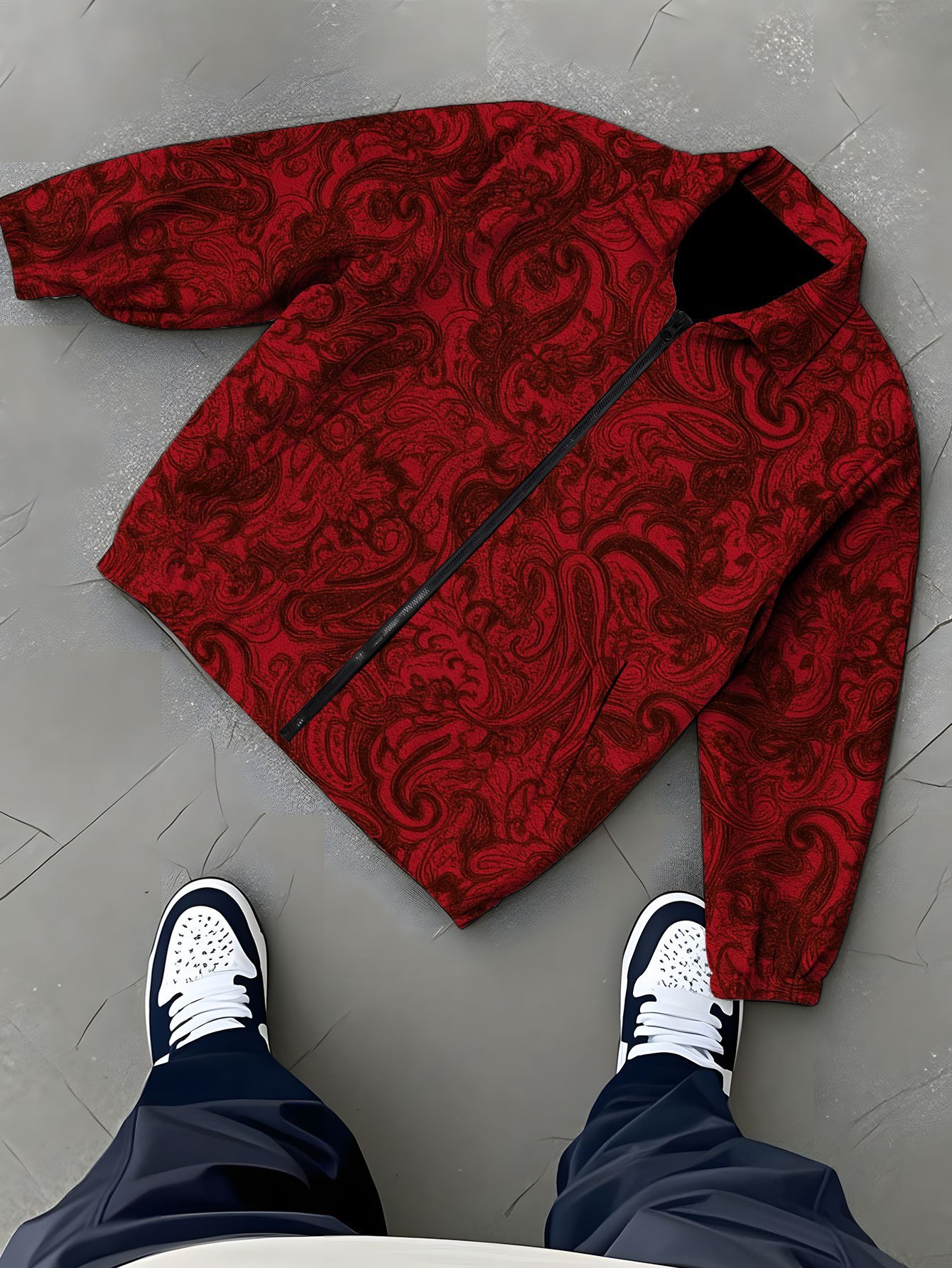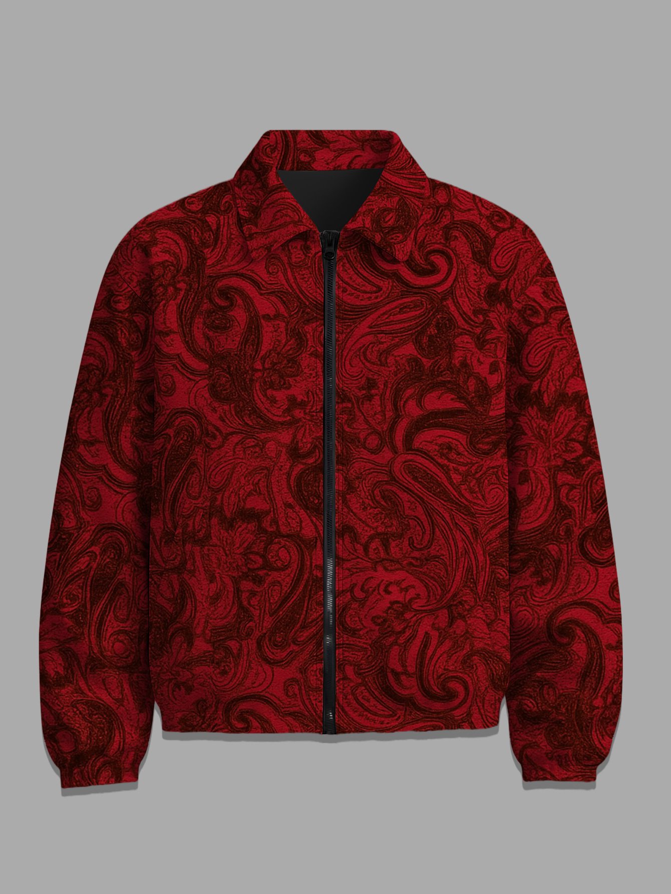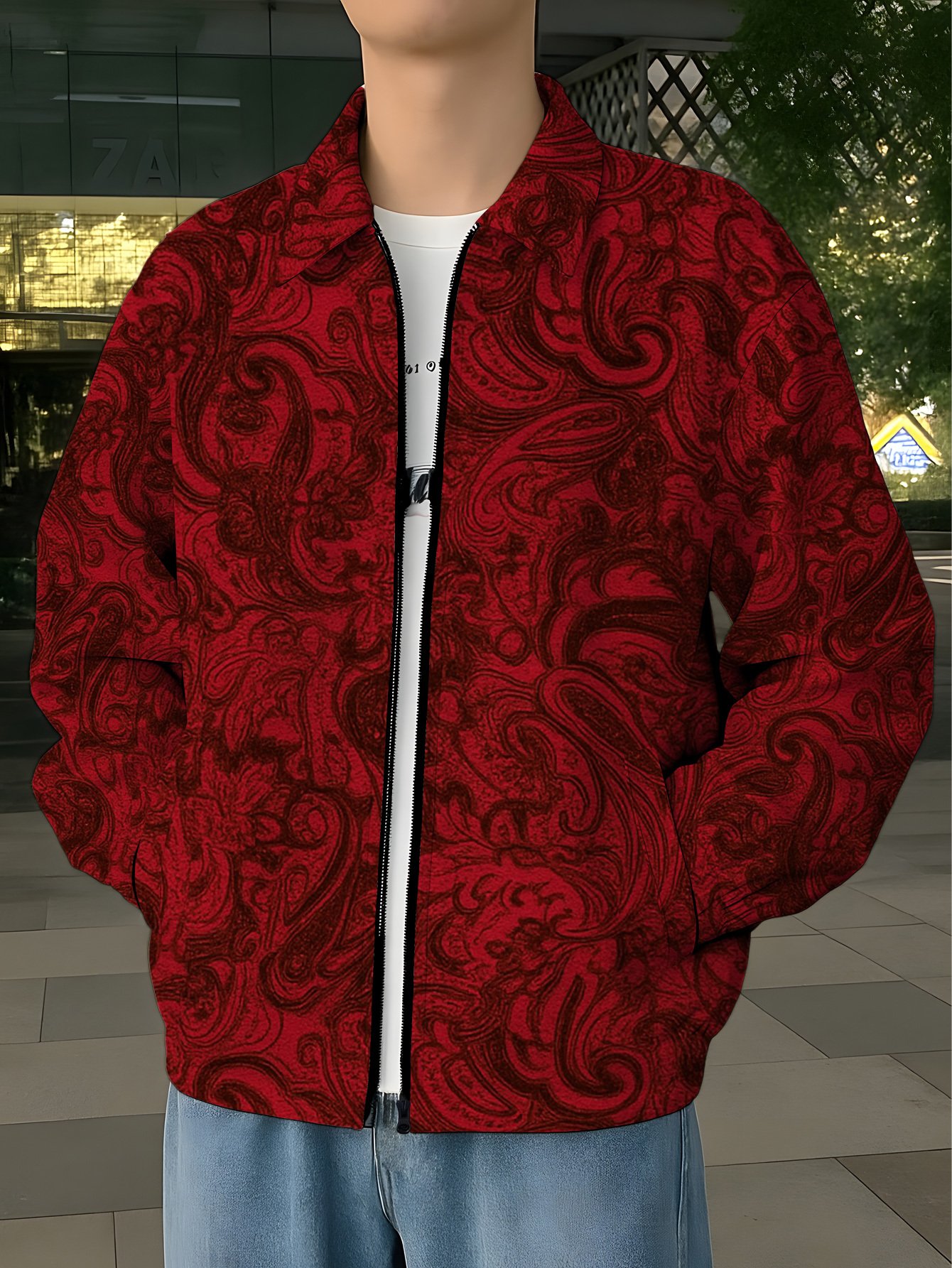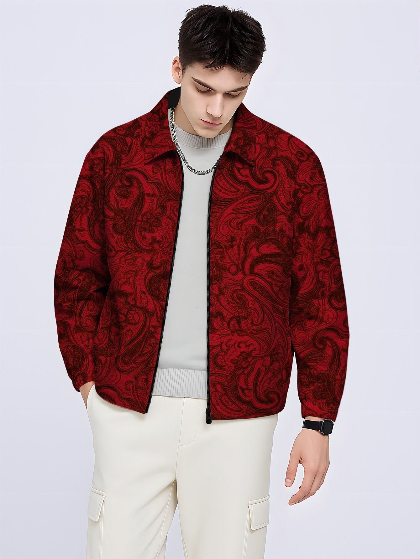 New Windproof Wrinkle- Men's Collared Jacket, Trendy Lightweight Outdoor Jacket with Digital Print, Regular Versatile Short Workwear Coat with Zipper Pockets, Soft Polyester Casual Men's Jacket Top in Red Paisley Pattern Vintage Style