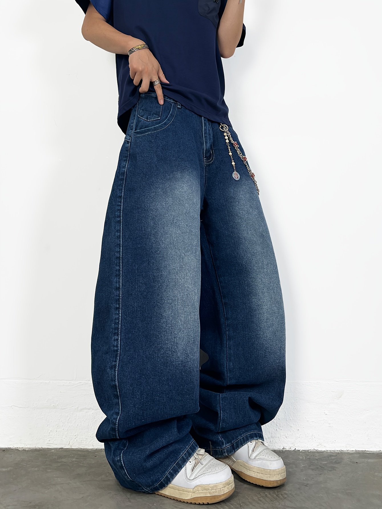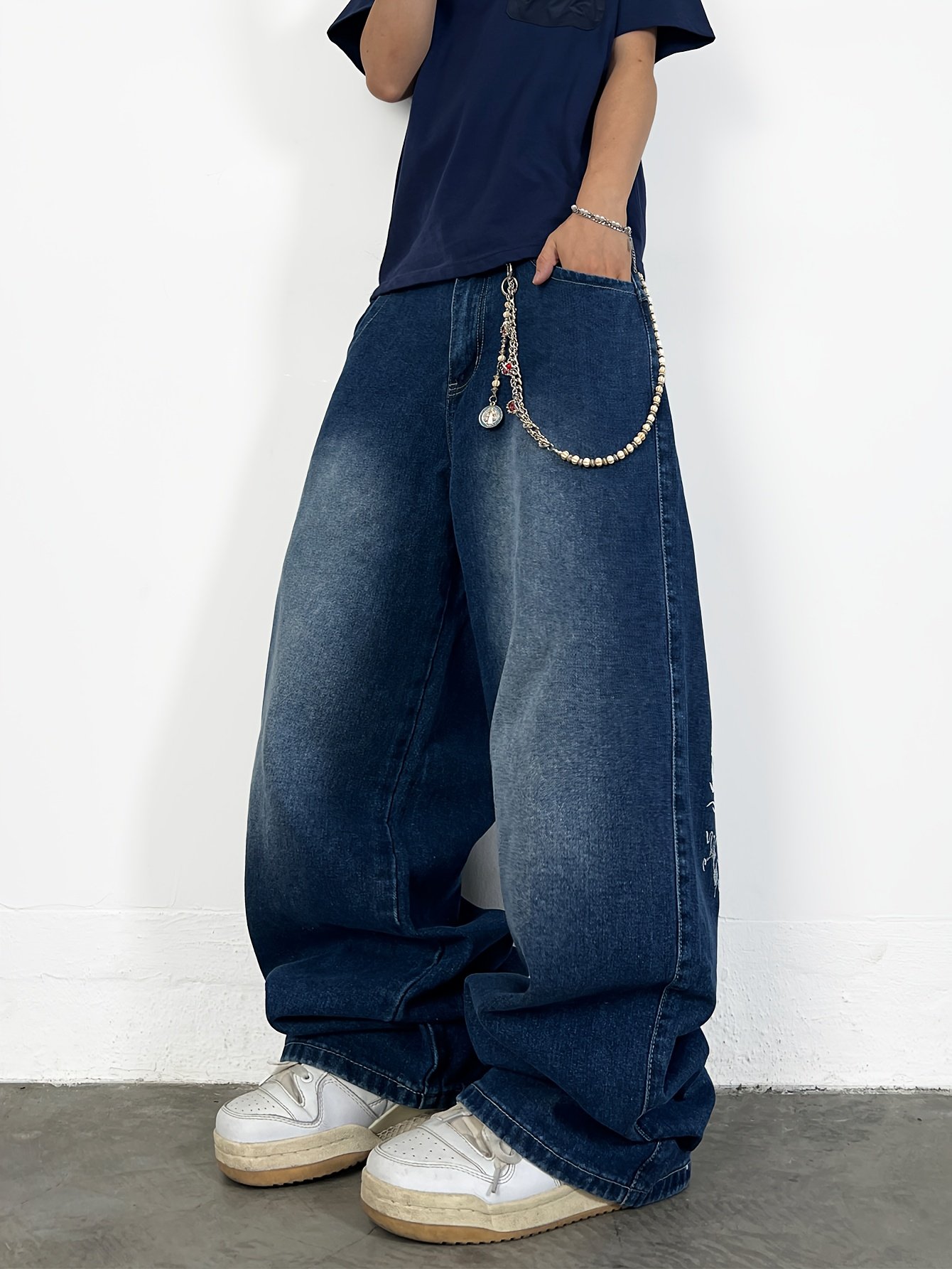 1 Pair of Blue Loose-Fit Jeans, Unisex Streetwear Style with American Wide-Leg Design for a Cool and Stylish Look. Casual Long Trousers Suitable All Seasons Belt/Accessories Not Included, Versatile Bottoms, Everyday Pants, Trendy Streetwear, Durable Mat