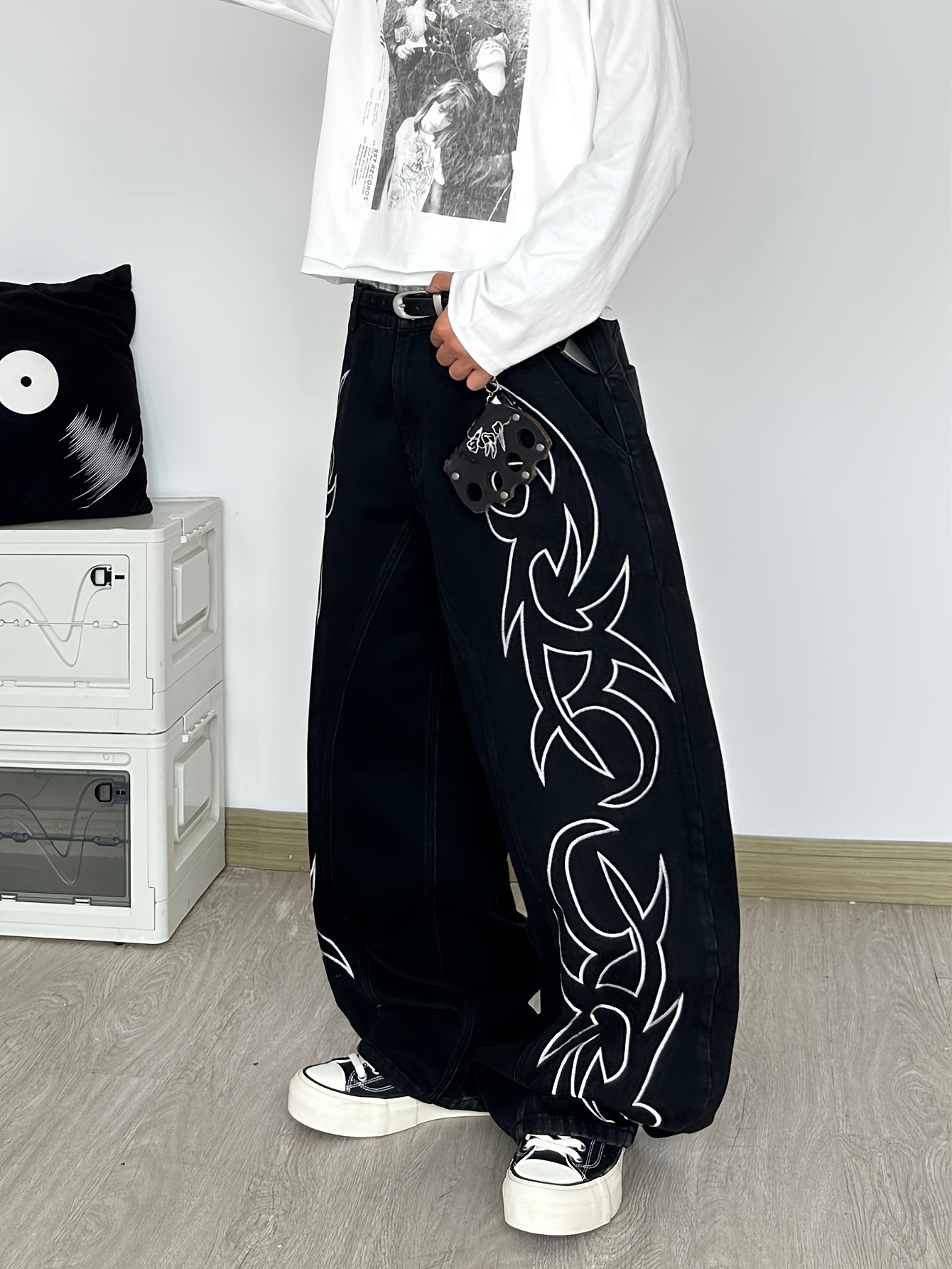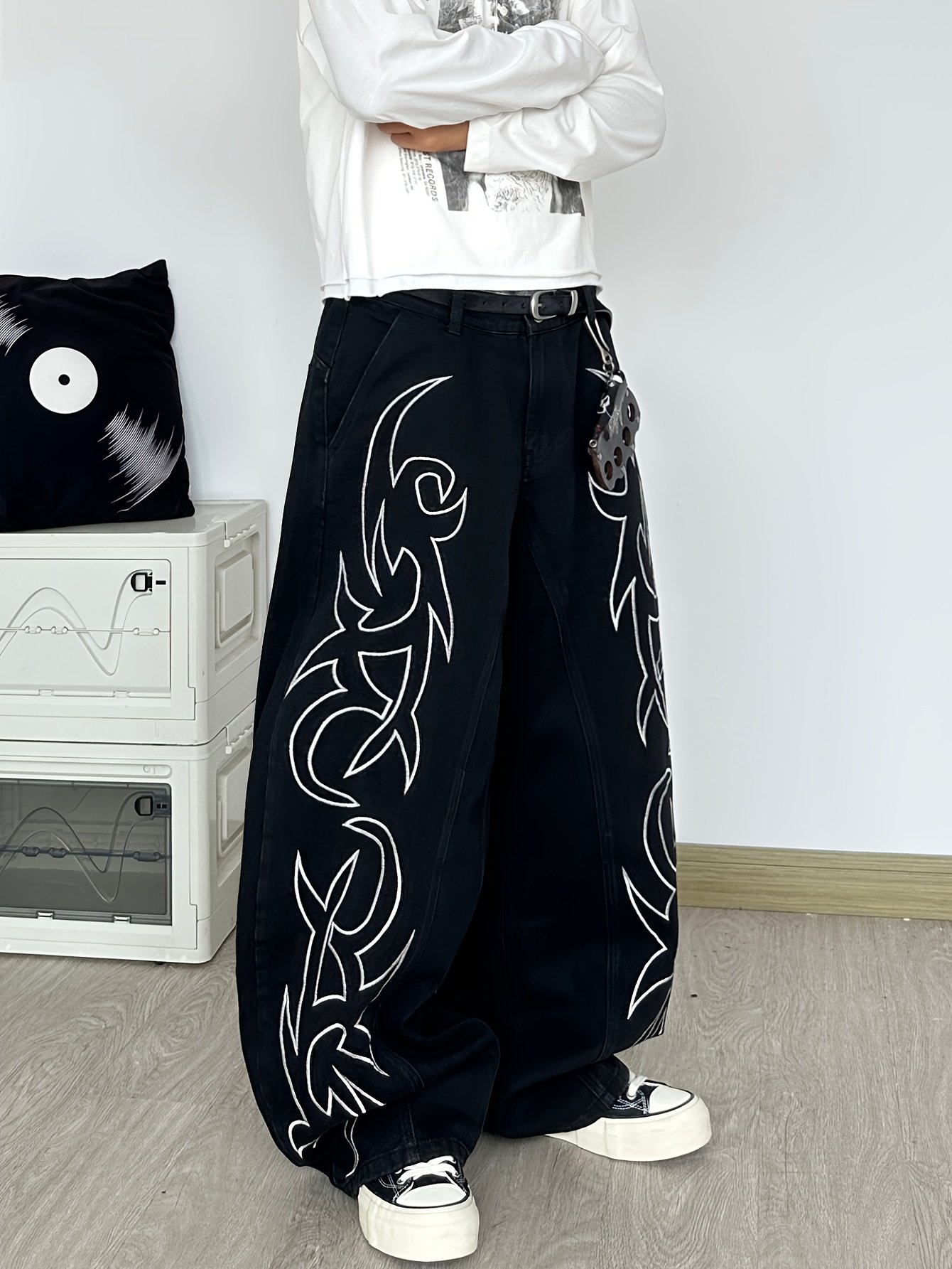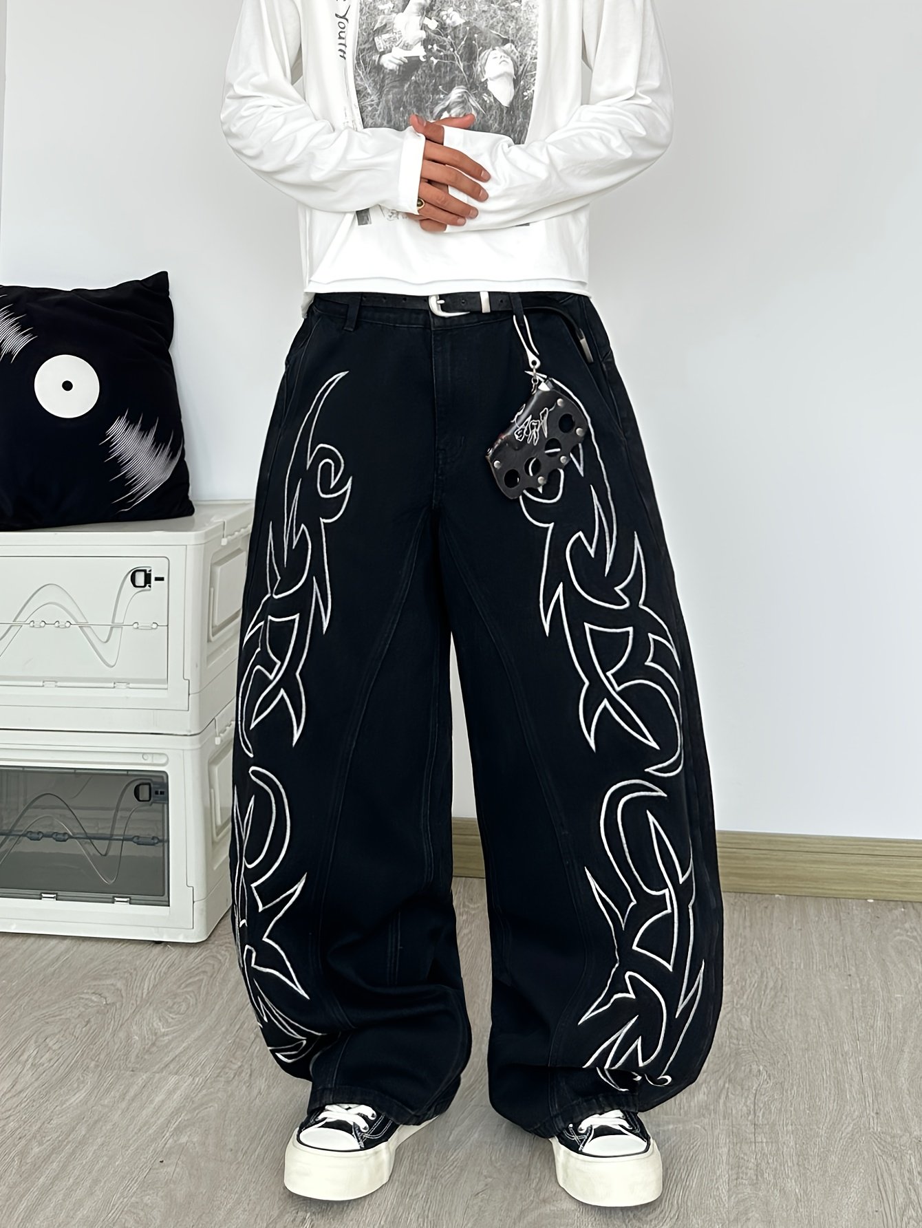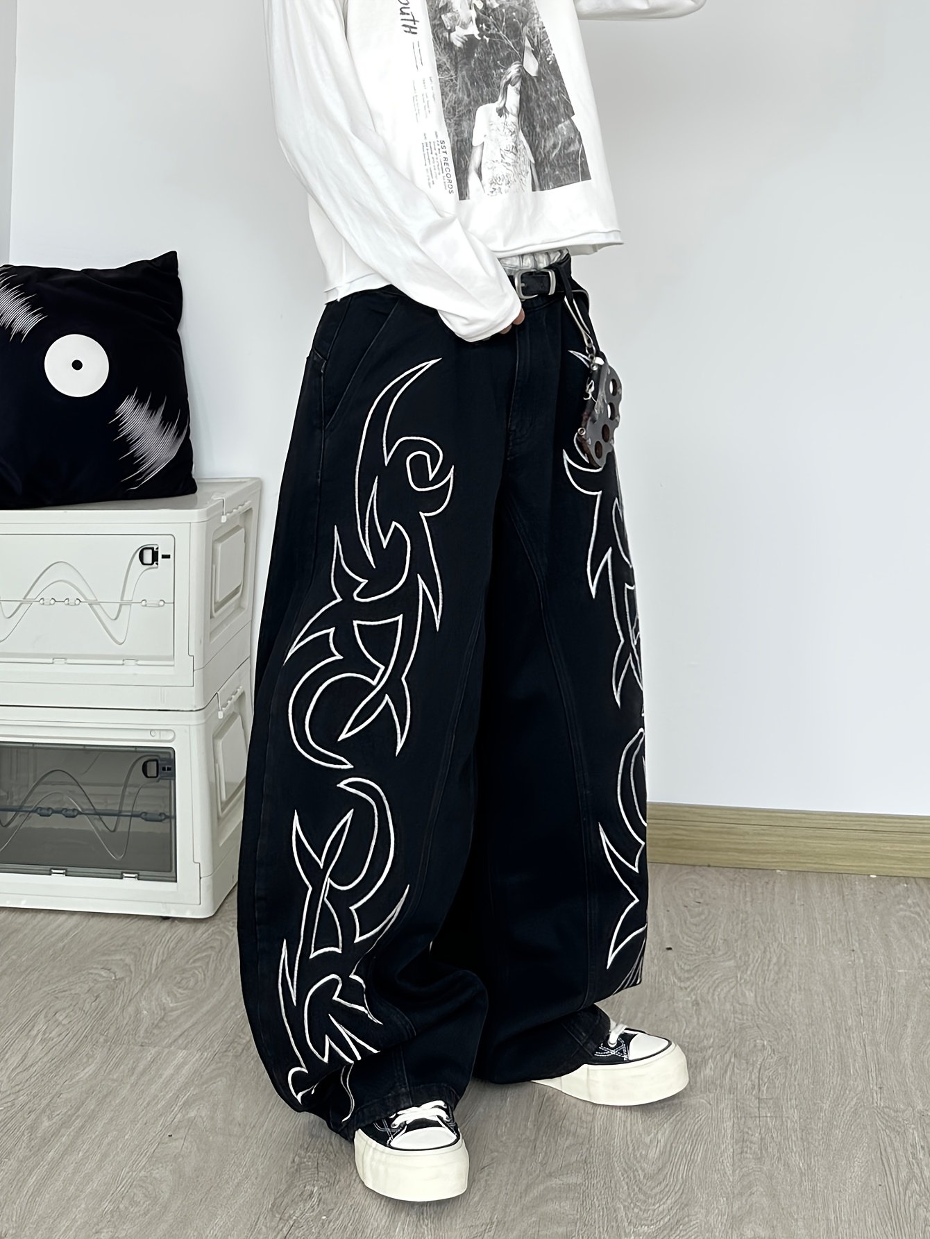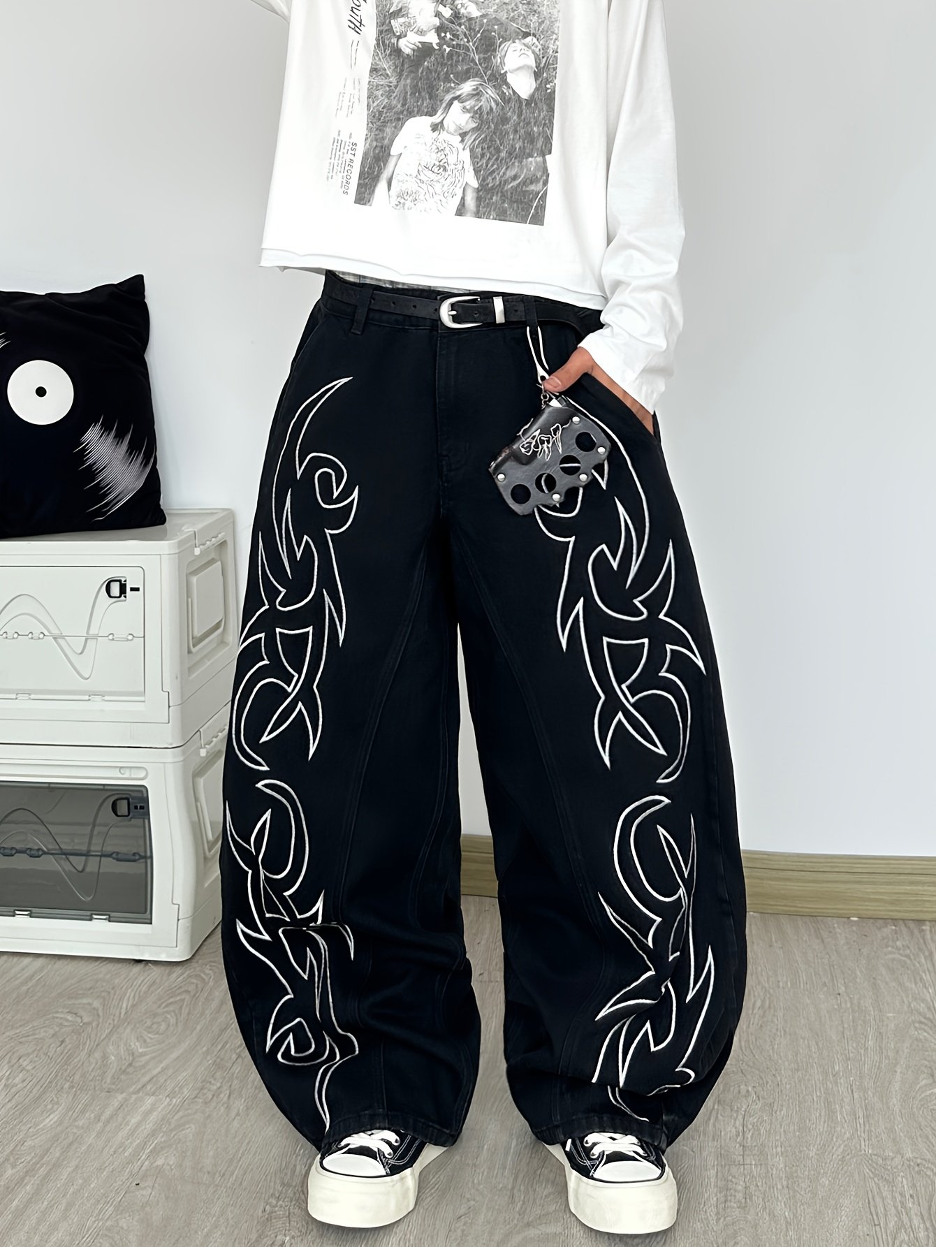 1pc American High Street Niche Design Totem Embroidery Curved Knife Pants, Deconstructed Patchwork Retro Washed Fashionable Versatile Wide Leg Pants, Unisex Without Belt/Without Pendant