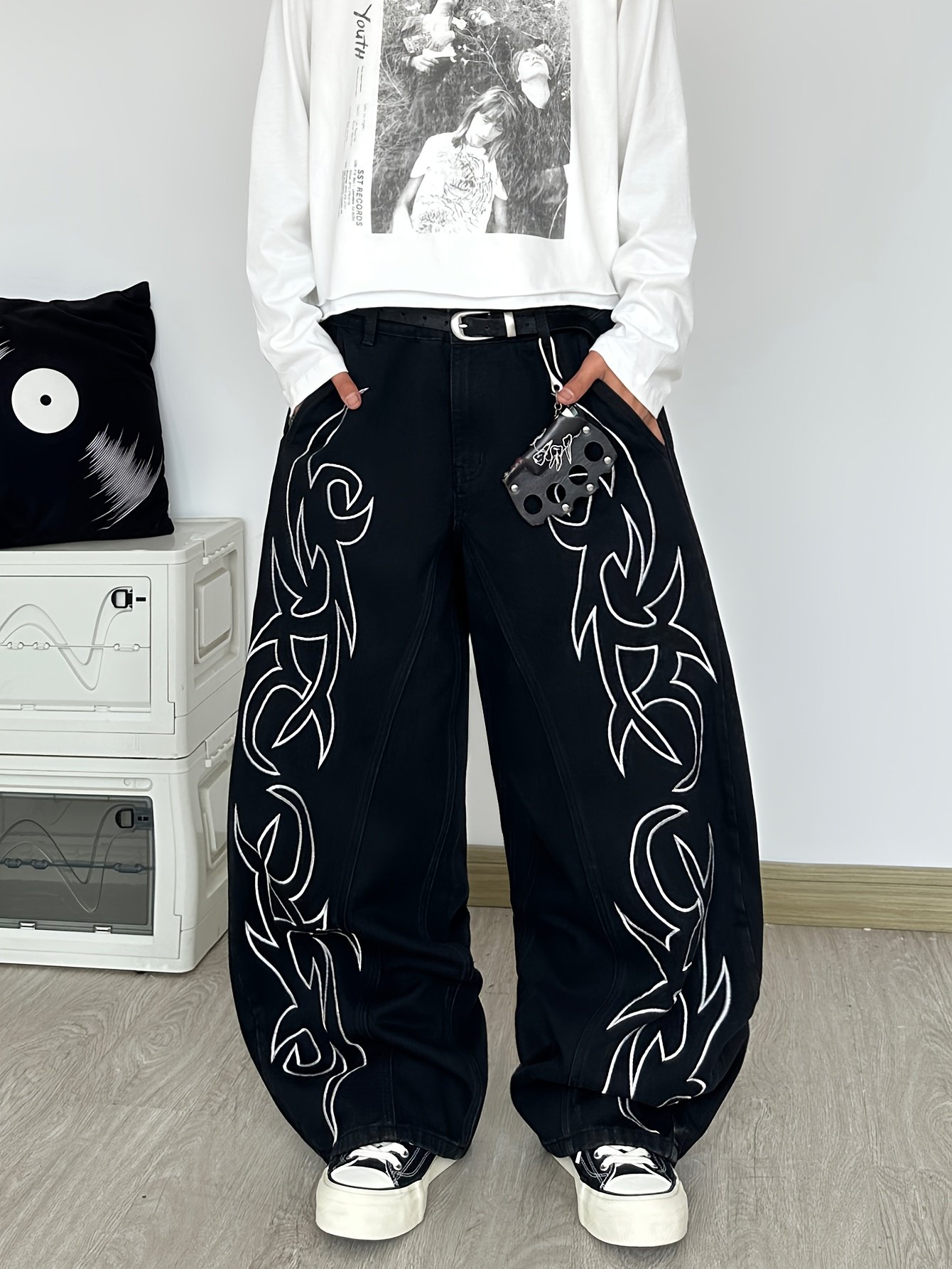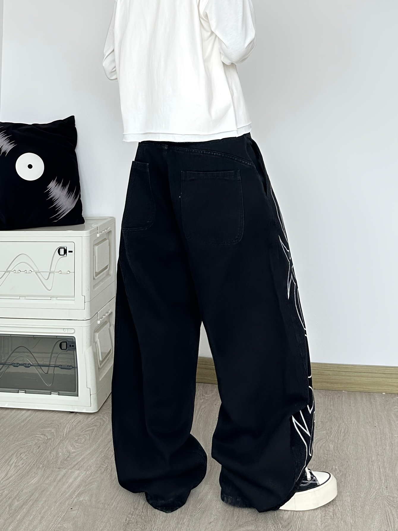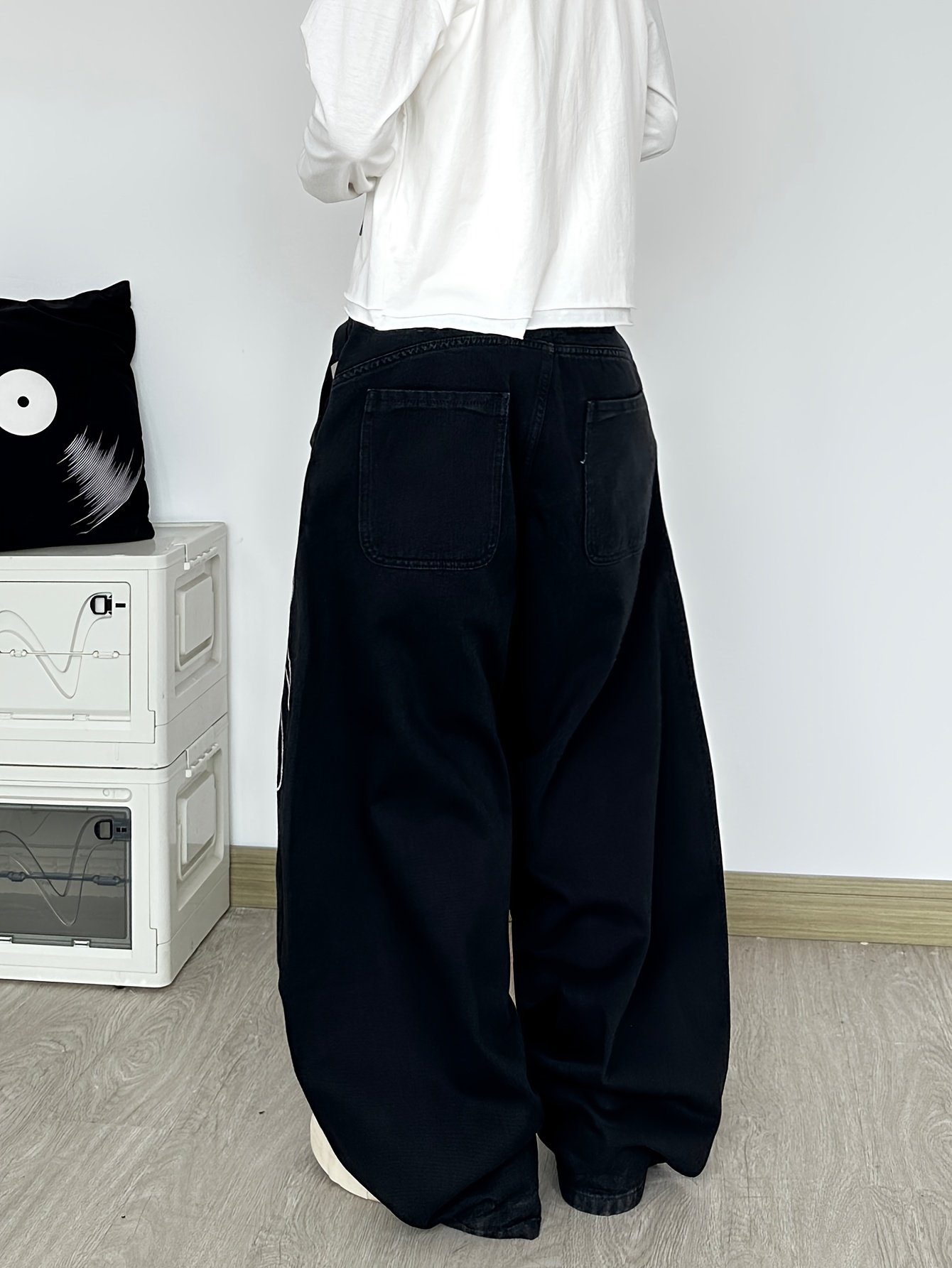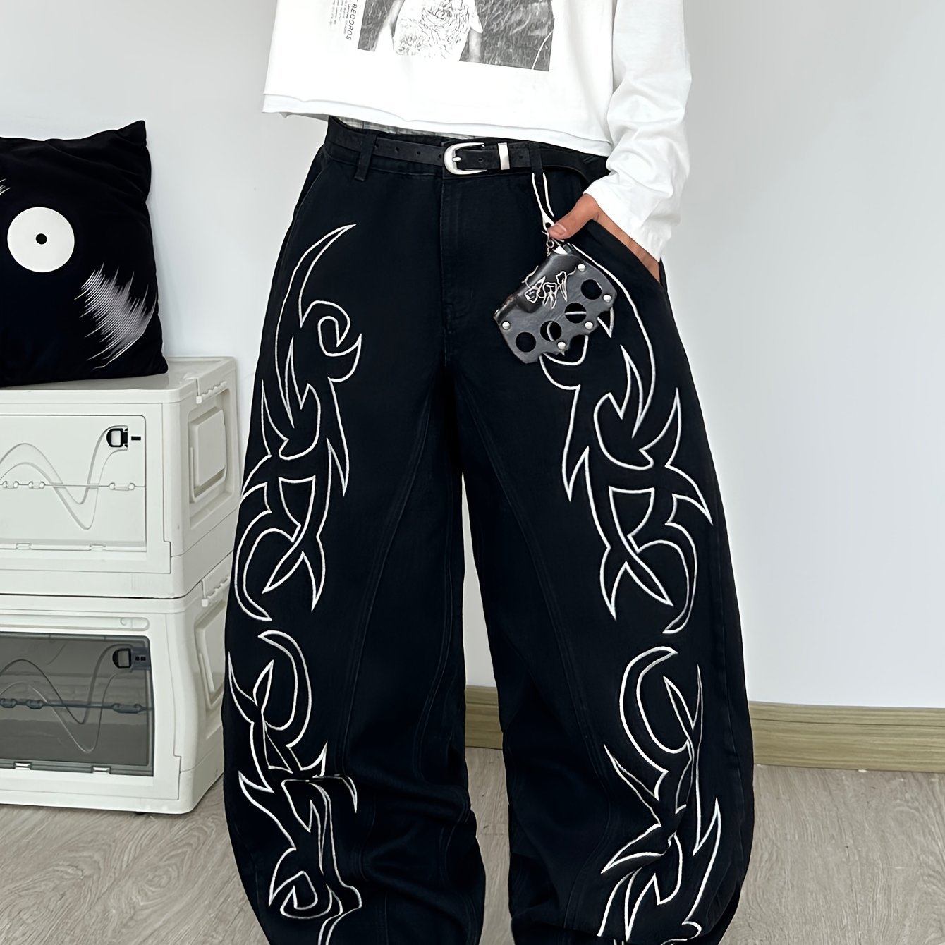 1pc Black Loose Faux Denim, Street Style Niche Design Embroidery, Vintage Fashion Versatile Wide-Leg Pants, Unisex Style, All-Season Wide-Leg No Belt/No Accessories, Streetwear Fashion, Vintage Style, Embroidered Details, Nonstretch Fabric