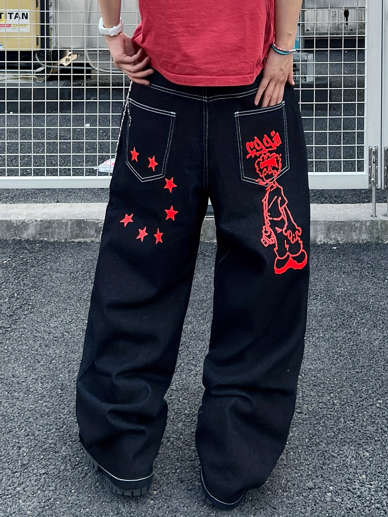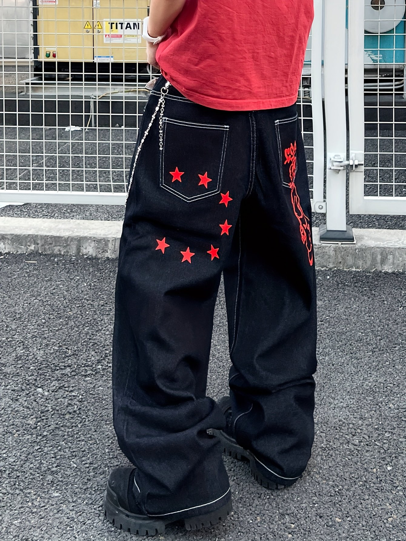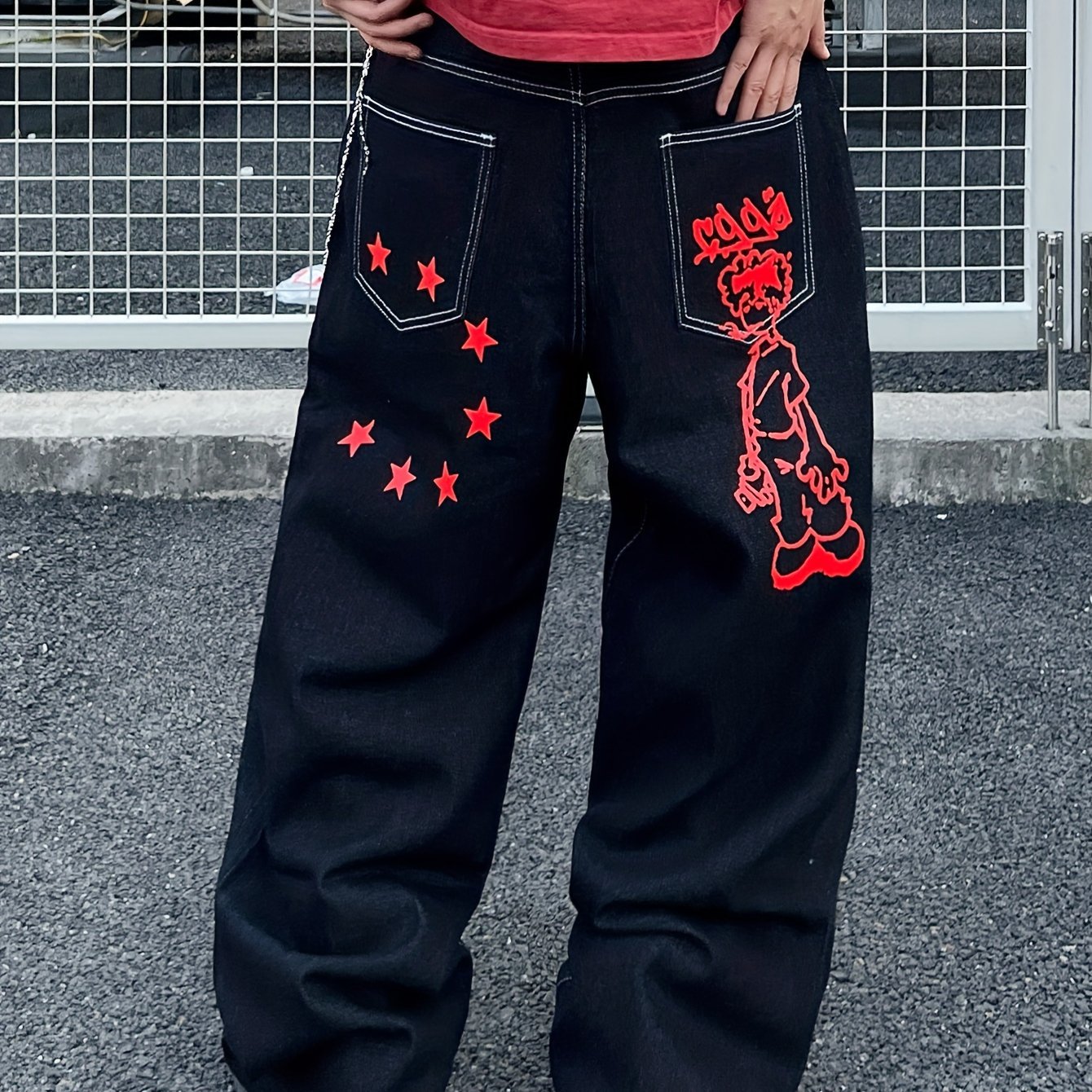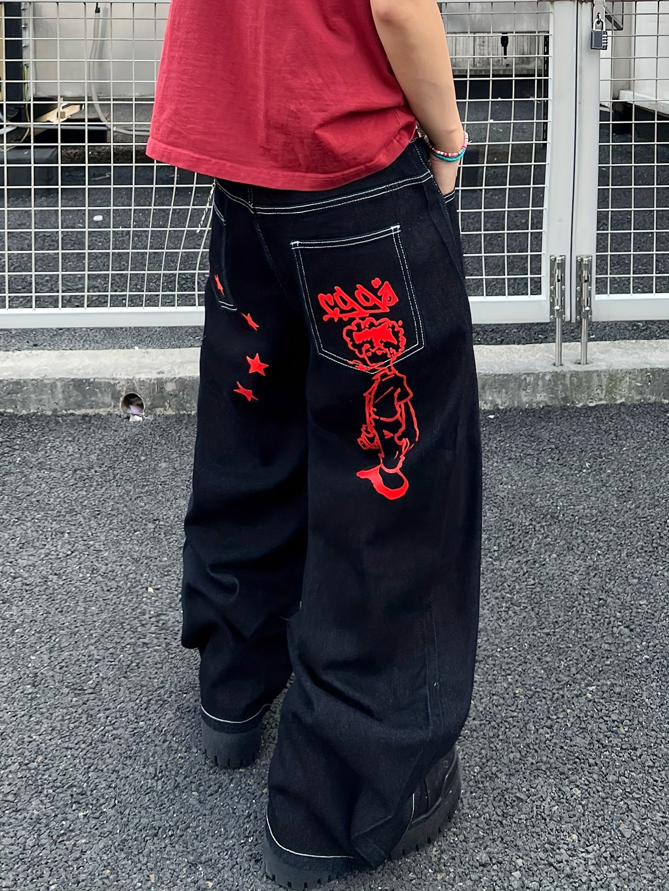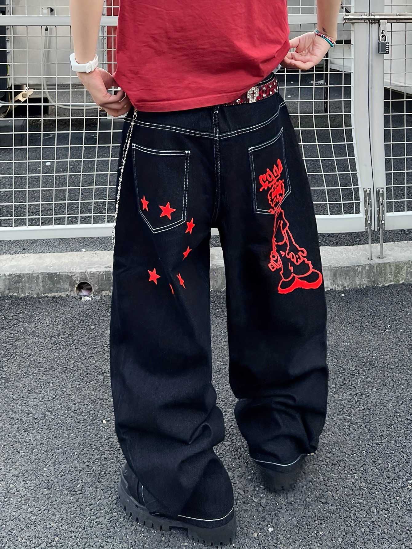A Pair of Loose-Fitting Vintage American Style Print Denim Pants, Trendy And Versatile Black Wide-Leg Trousers for Both Men And Women Belt And Accessories Not Included.