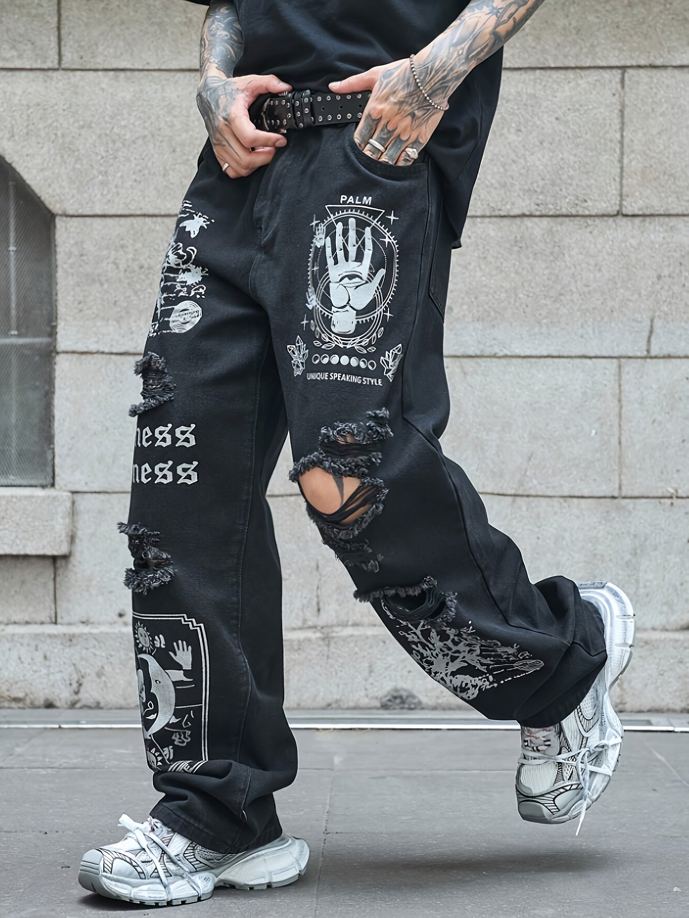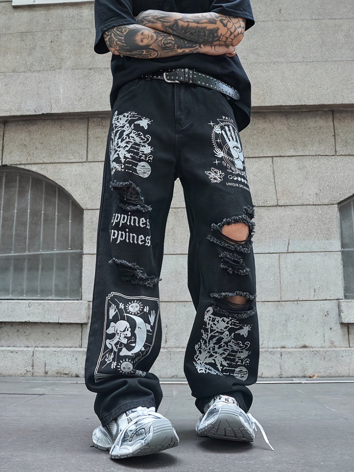 1pc Men'S Washed Blue Distressed Faux Denim – Oversized Loose-Fit Streetwear Pants with Blue & Black Graffiti Print, Non-Stretch Fabric, All-Season Casual Trousers for Men & Women, Streetwear Fashion, Trendy Design, Comfortable Fit, Urban Style