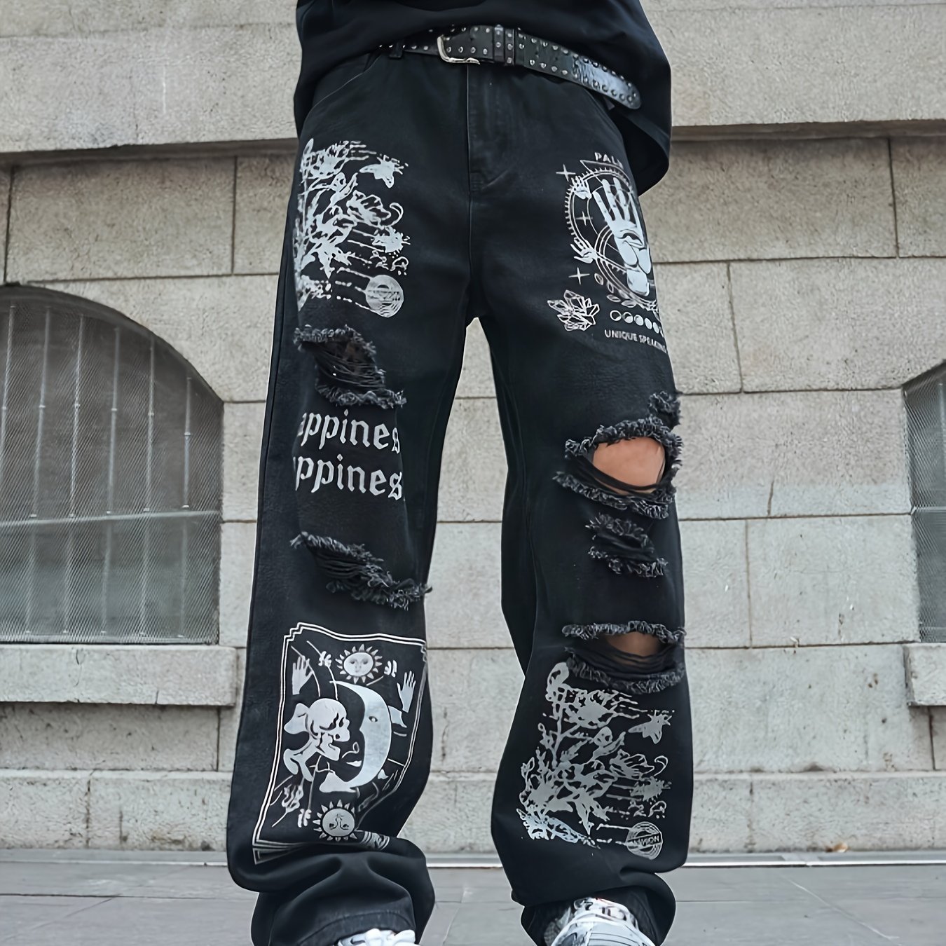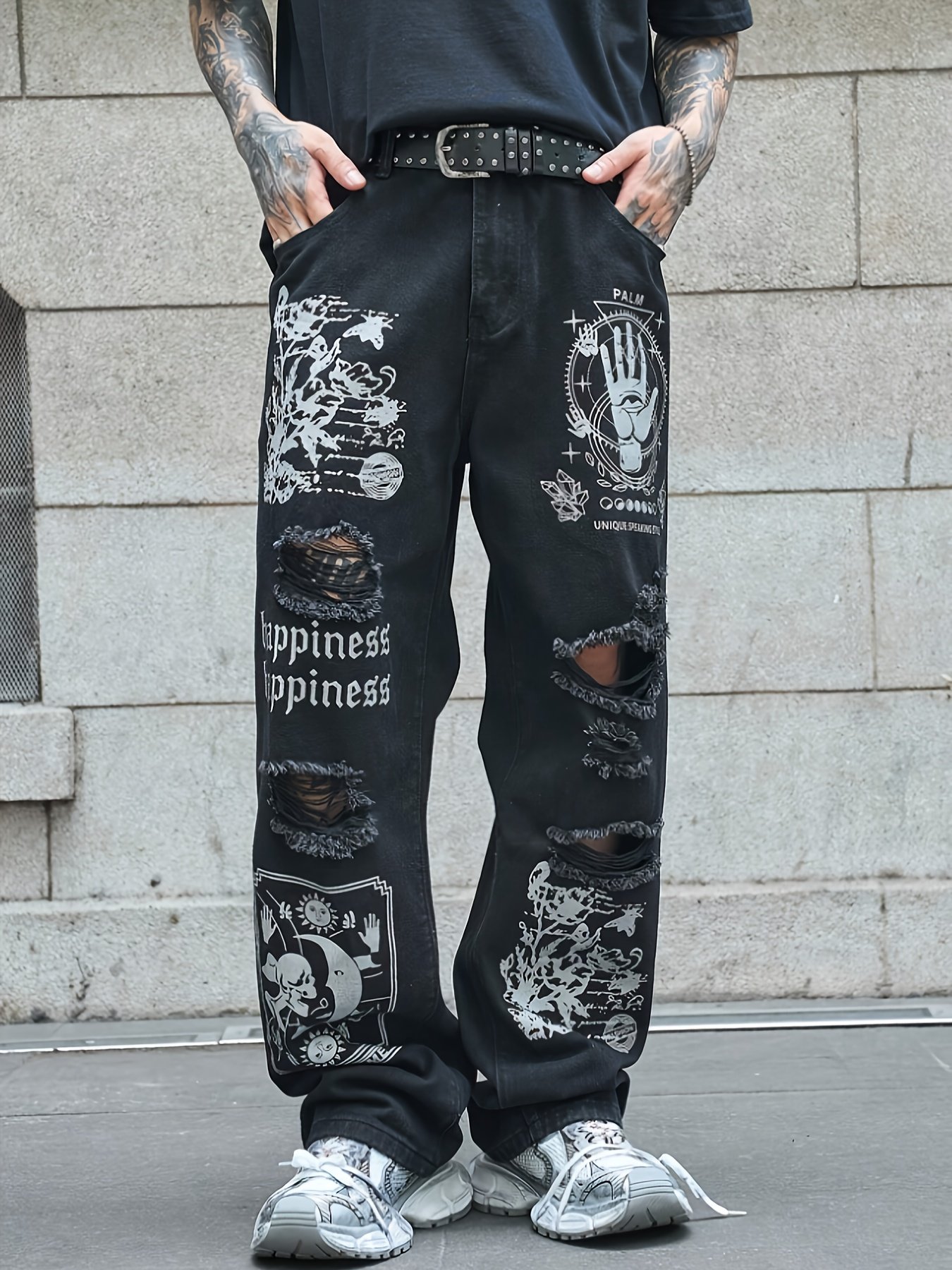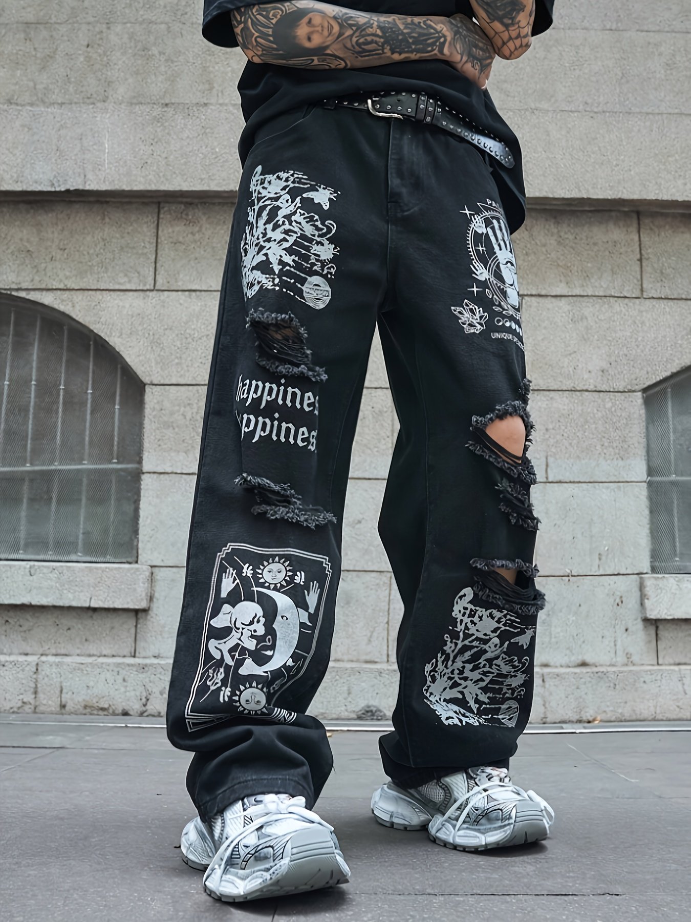 Men's Laser Thorn Print Wide-Leg Jeans – Oversized Streetwear Pants with Beltless Design, Heavy-Wash Look & Thigh/Ankle Laser Pattern – Machine-Washable Loose Fit Trousers No Belt Included for Urban Fashion