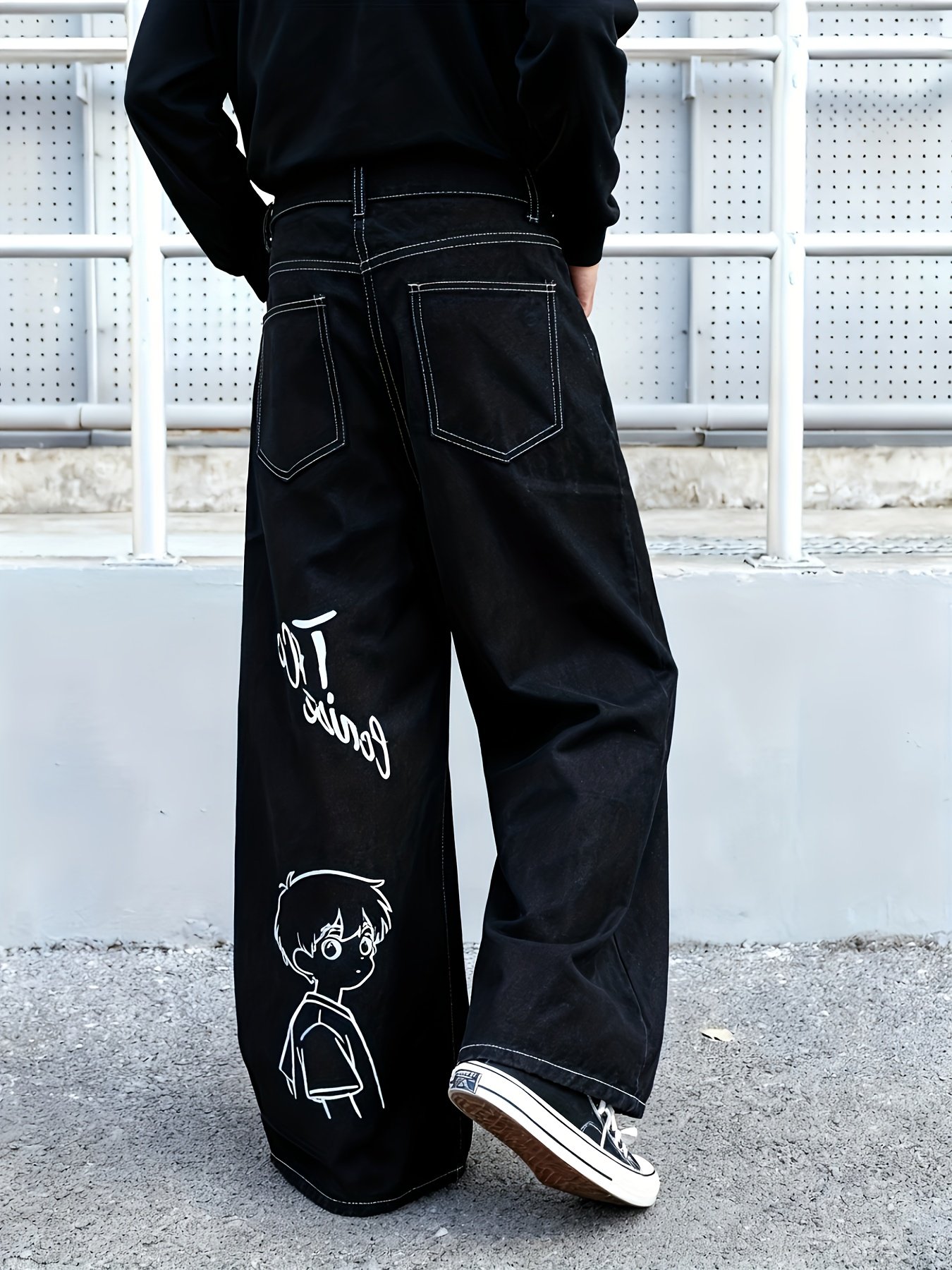 Men's Black Oversized Wide-Leg Jeans with Anime Manga Print Text & Characters – Relaxed Fit Straight-Leg Trousers, Heavy-Wash for Casual Wear, & Everyday Use – -Inspired Style