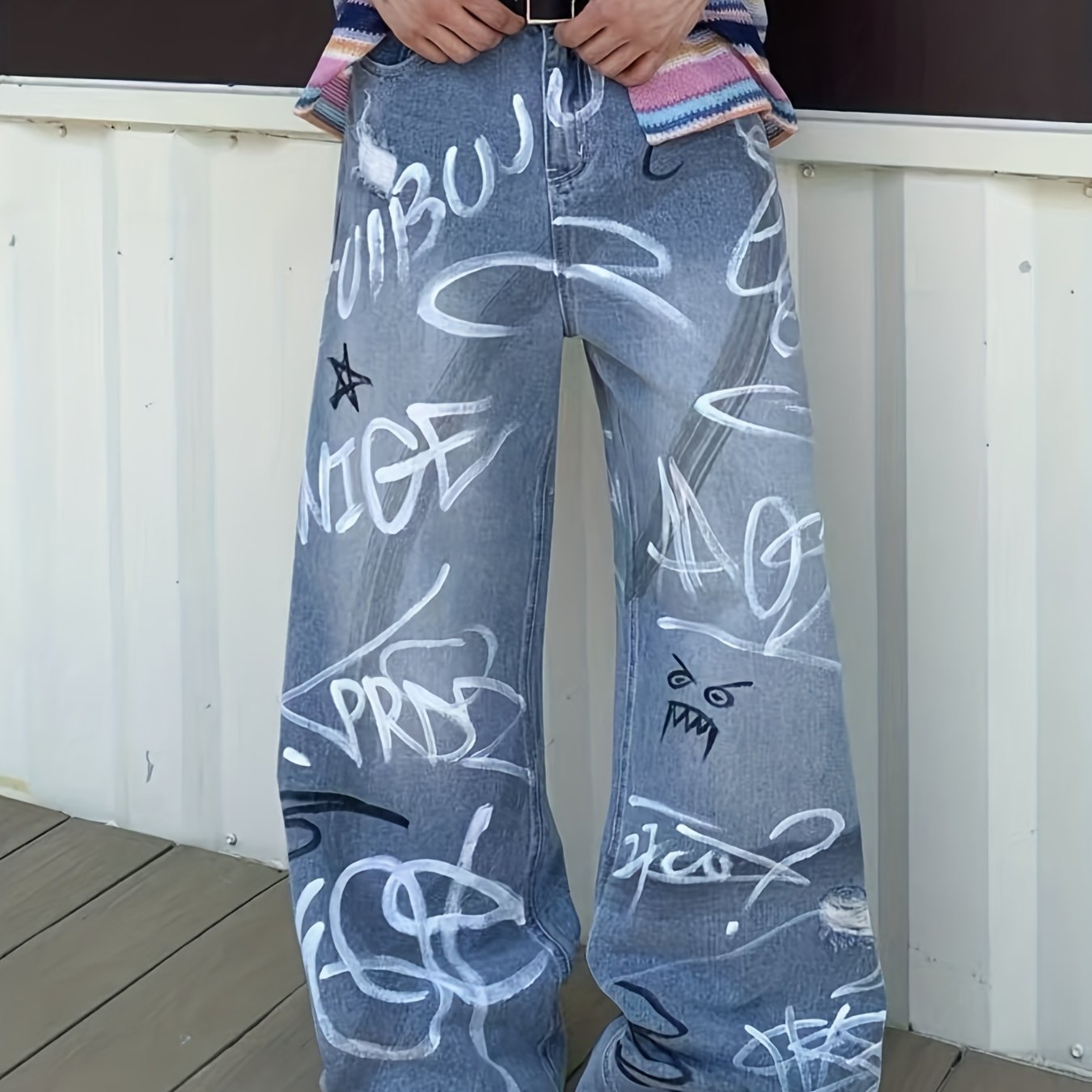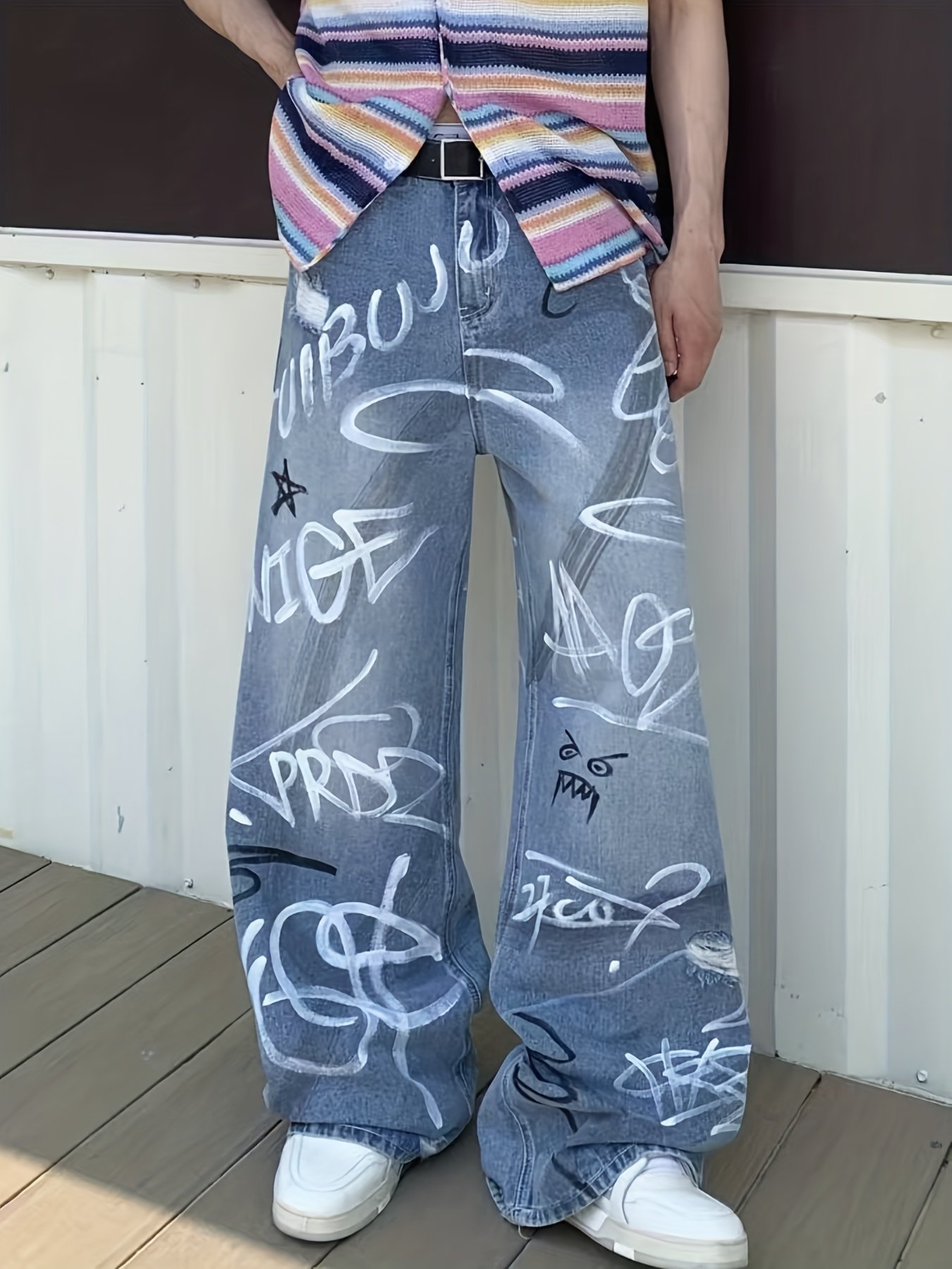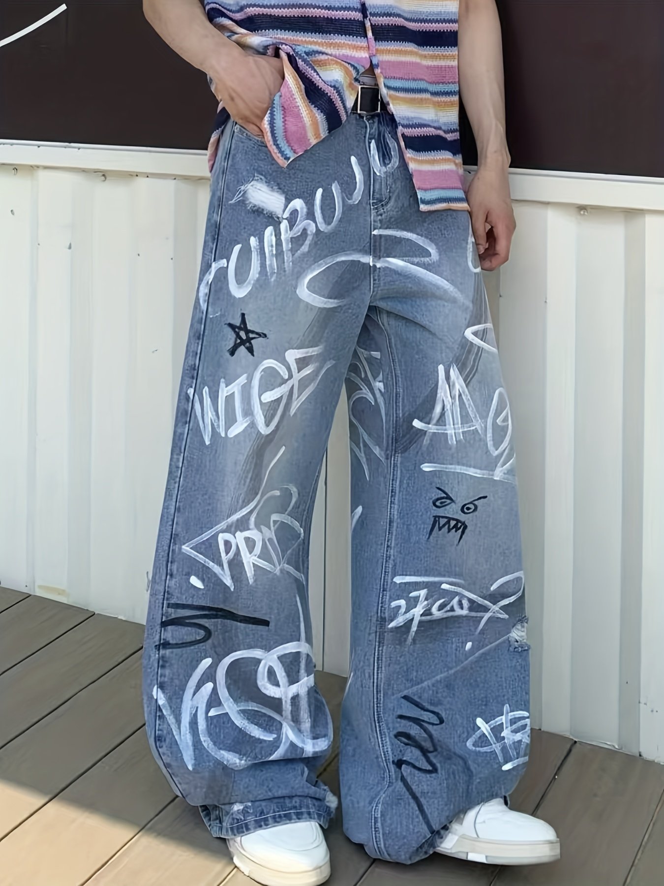 Be the first to review “Men's Heavy-Duty Streetwear Graffiti Print Jeans – Washed Straight-Leg Oversized Trousers with Graffiti Leg Print Knee/Ankle/Thigh, Machine-Washable Pants for Urban Style & Casual Wear” Cancel reply