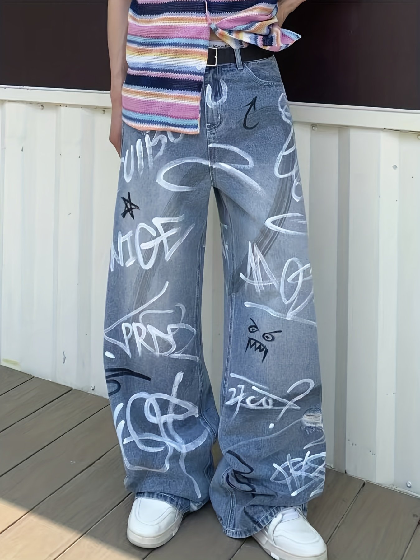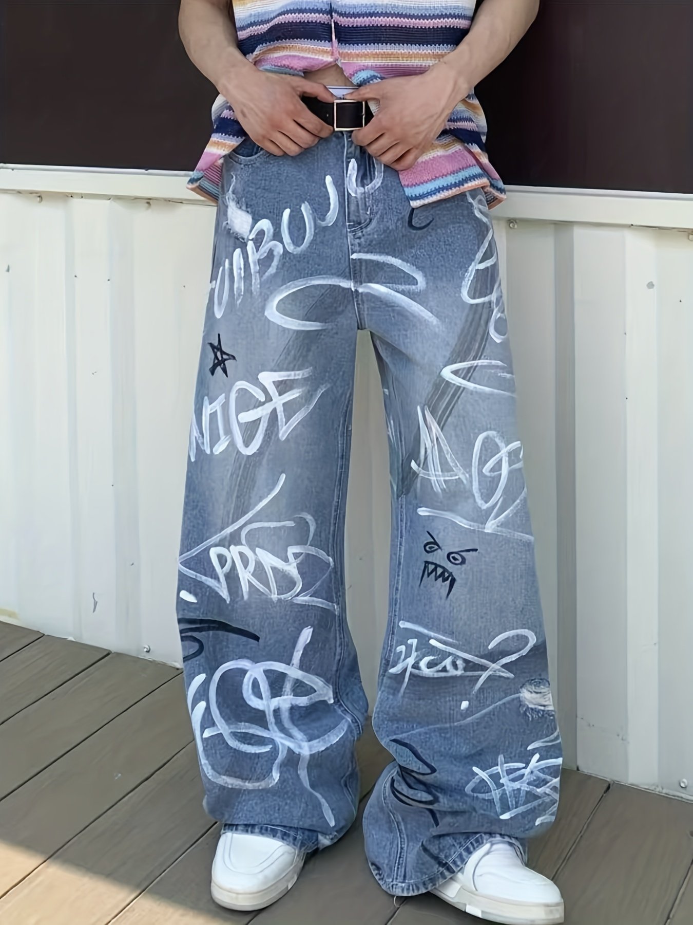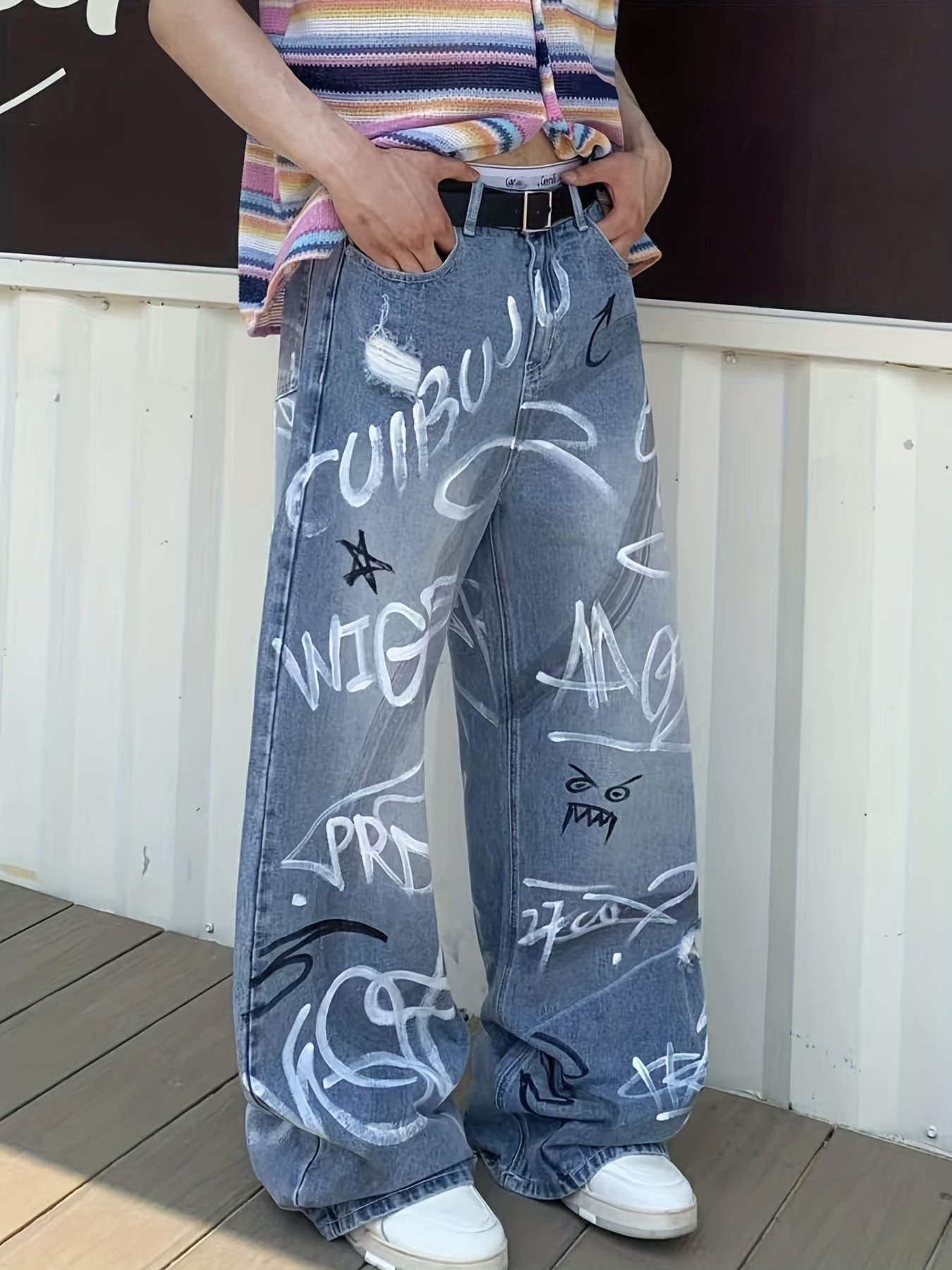 Be the first to review “Men's Heavy-Duty Streetwear Graffiti Print Jeans – Washed Straight-Leg Oversized Trousers with Graffiti Leg Print Knee/Ankle/Thigh, Machine-Washable Pants for Urban Style & Casual Wear” Cancel reply