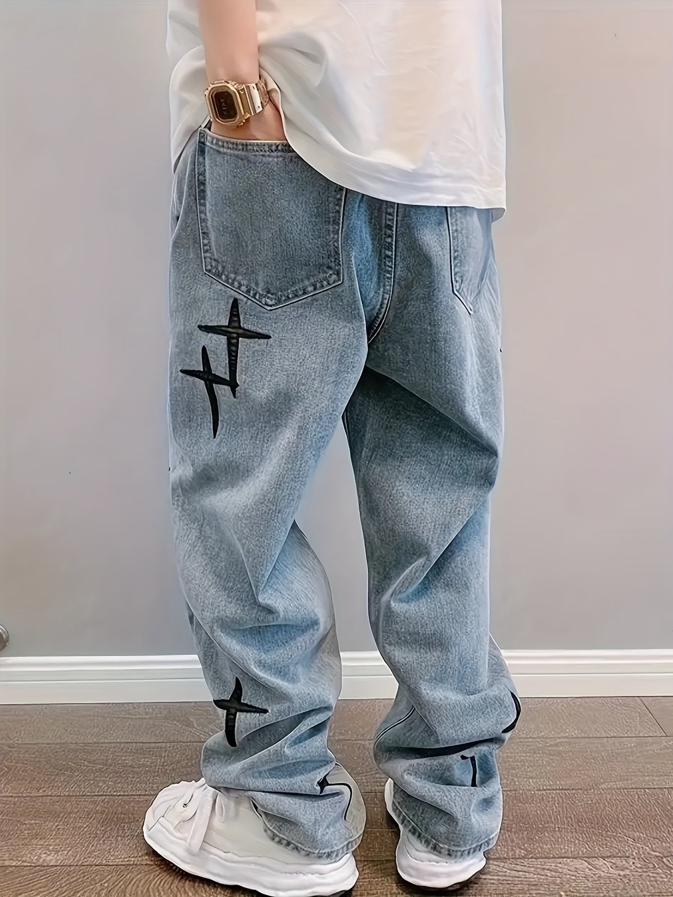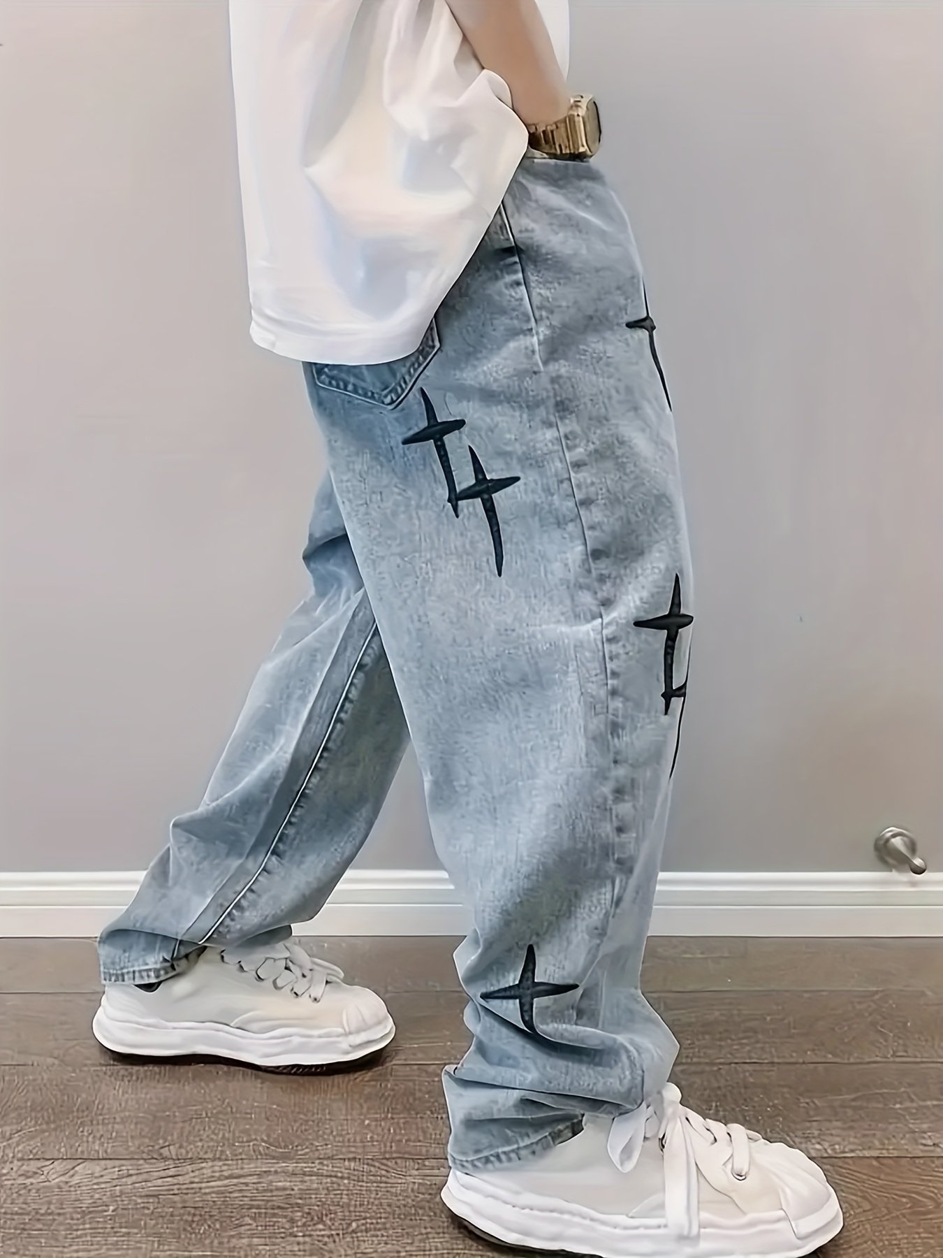 Men's Laser Thorn Print Wide-Leg Jeans – Oversized Streetwear Pants with Beltless Design, Heavy-Wash Look & Thigh/Ankle Laser Pattern – Machine-Washable Loose Fit Trousers No Belt Included for Urban Fashion