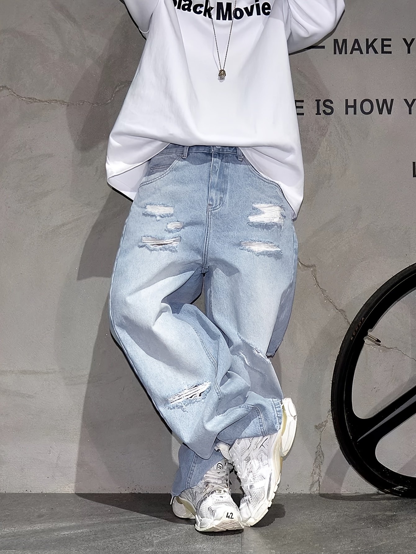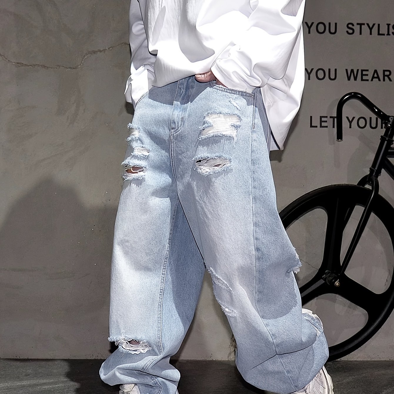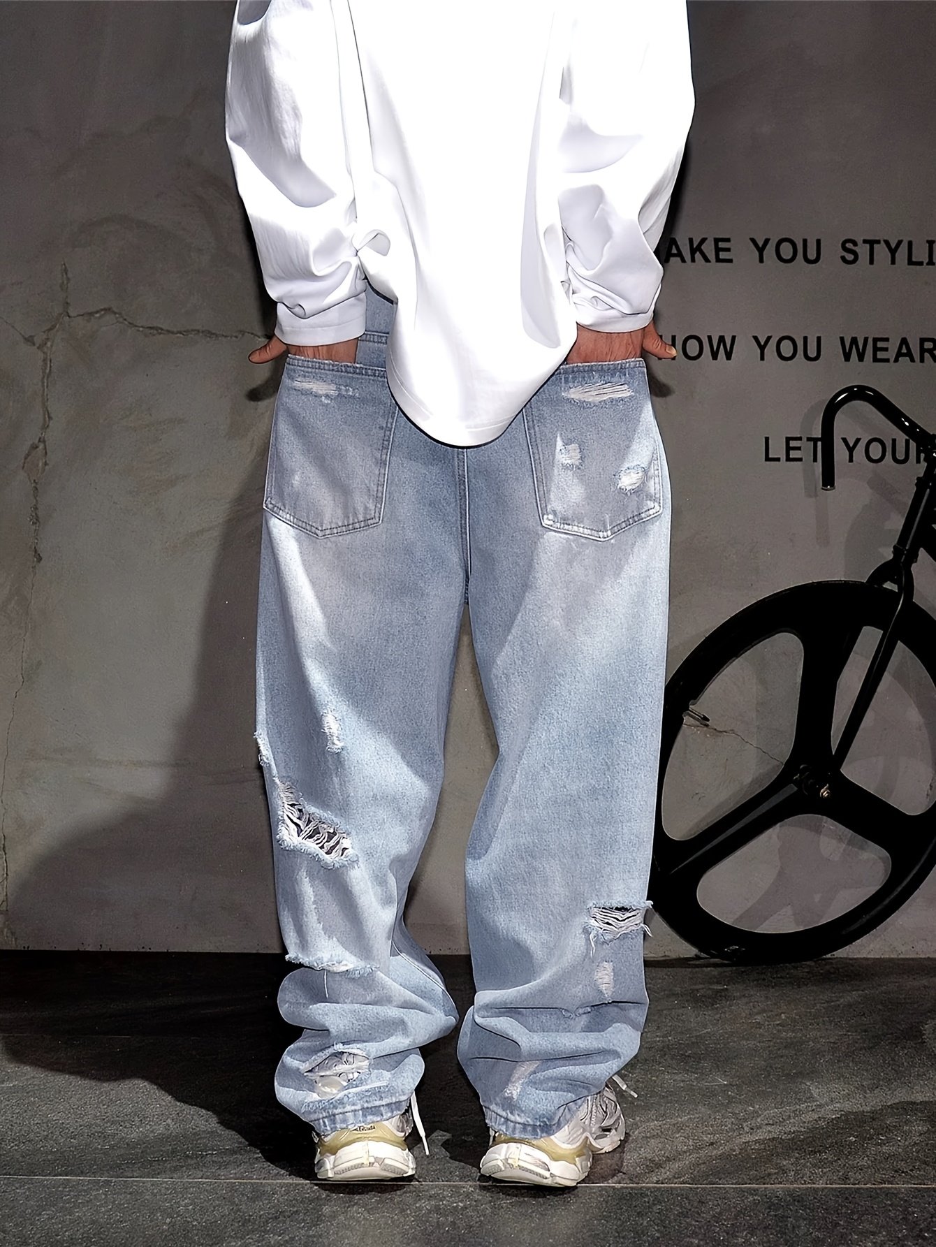 Men's Vintage Distressed Wide-Leg Jeans – Oversized Relaxed Fit Wash Blue, Frayed Hem & Belt Loop Casual Hiphop Streetwear Pants Non-Stretch, Machine Washable for All-Season Wear