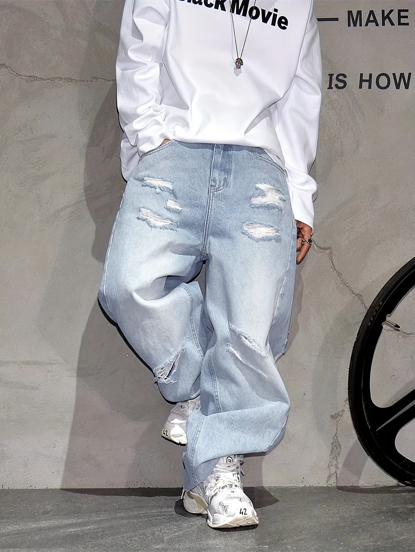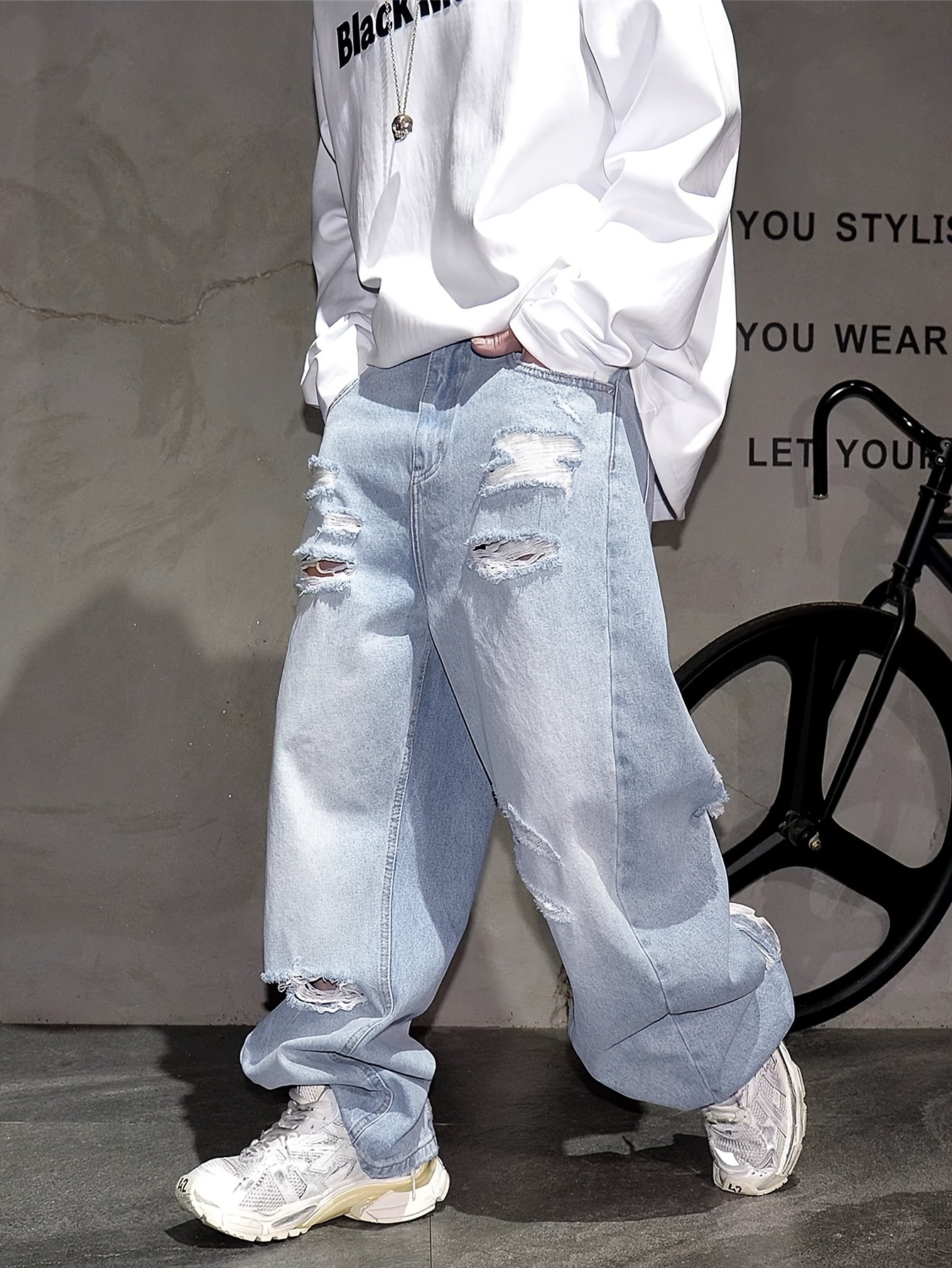Men's Hip-Hop Loose Fit Wide-Leg Denim Pants, Beltless Skater Jeans