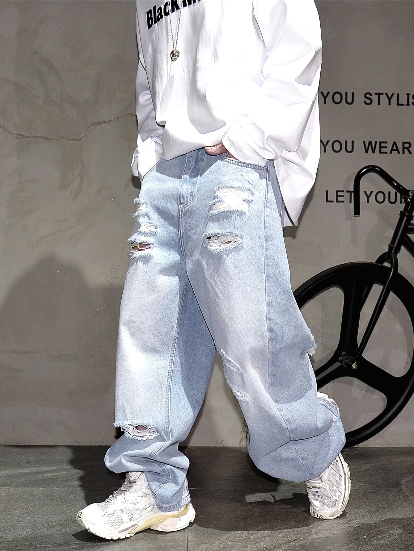 American High Trendy Frayed Patchwork Washed Distressed Men's Loose Fit Wide-Leg Jeans