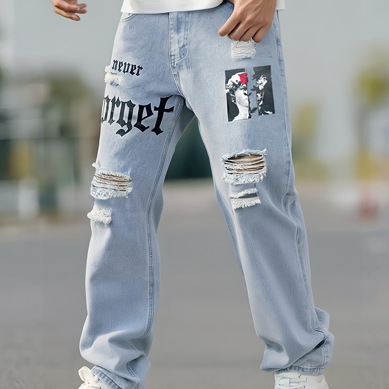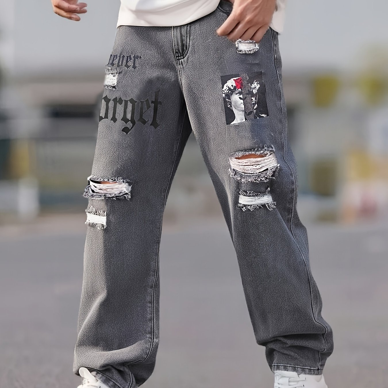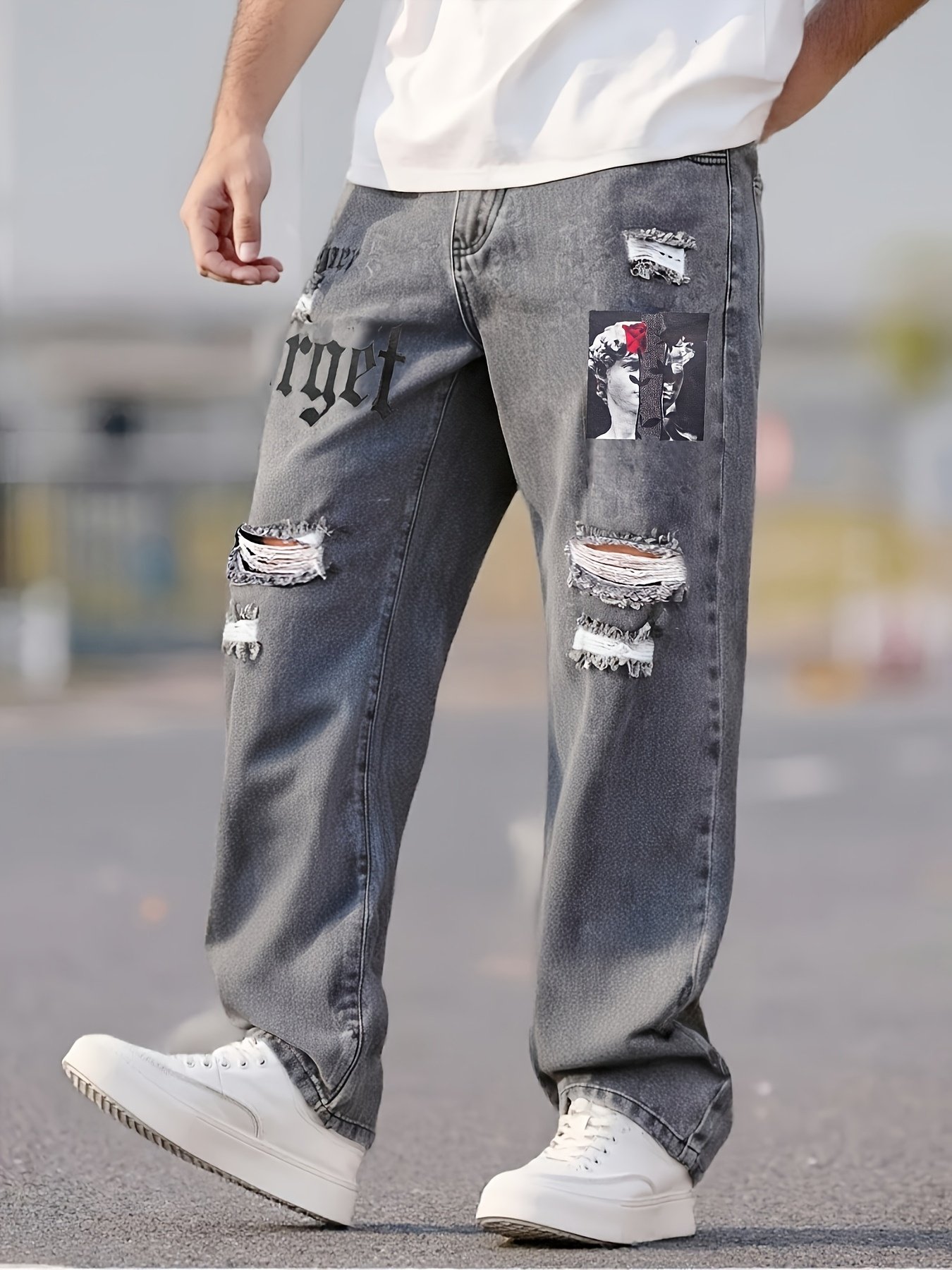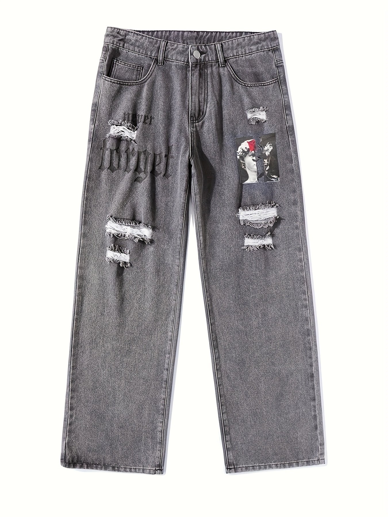 Men's Street Style Loose Straight Leg Jeans – Distressed Perforated Design with Angel Wing & Portrait Print, Washed Denim Urban Fashion Pants for All Seasons, Casual Streetwear, Nonstretch Fabric