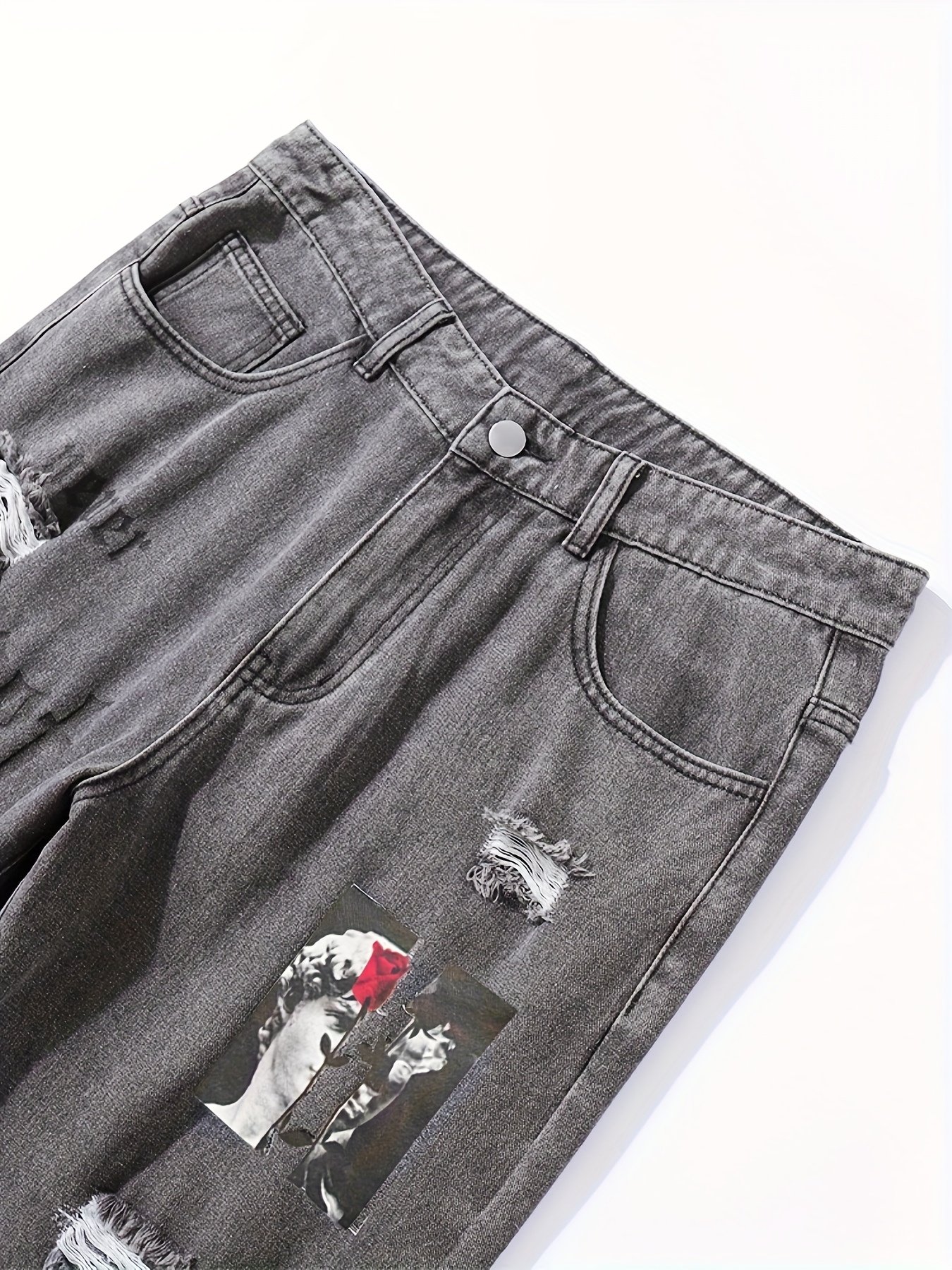 Be the first to review “Men's Street Style Loose Straight Leg Jeans – Distressed Perforated Design with Angel Wing & Portrait Print, Washed Denim Urban Fashion Pants for All Seasons, Casual Streetwear, Nonstretch Fabric” Cancel reply