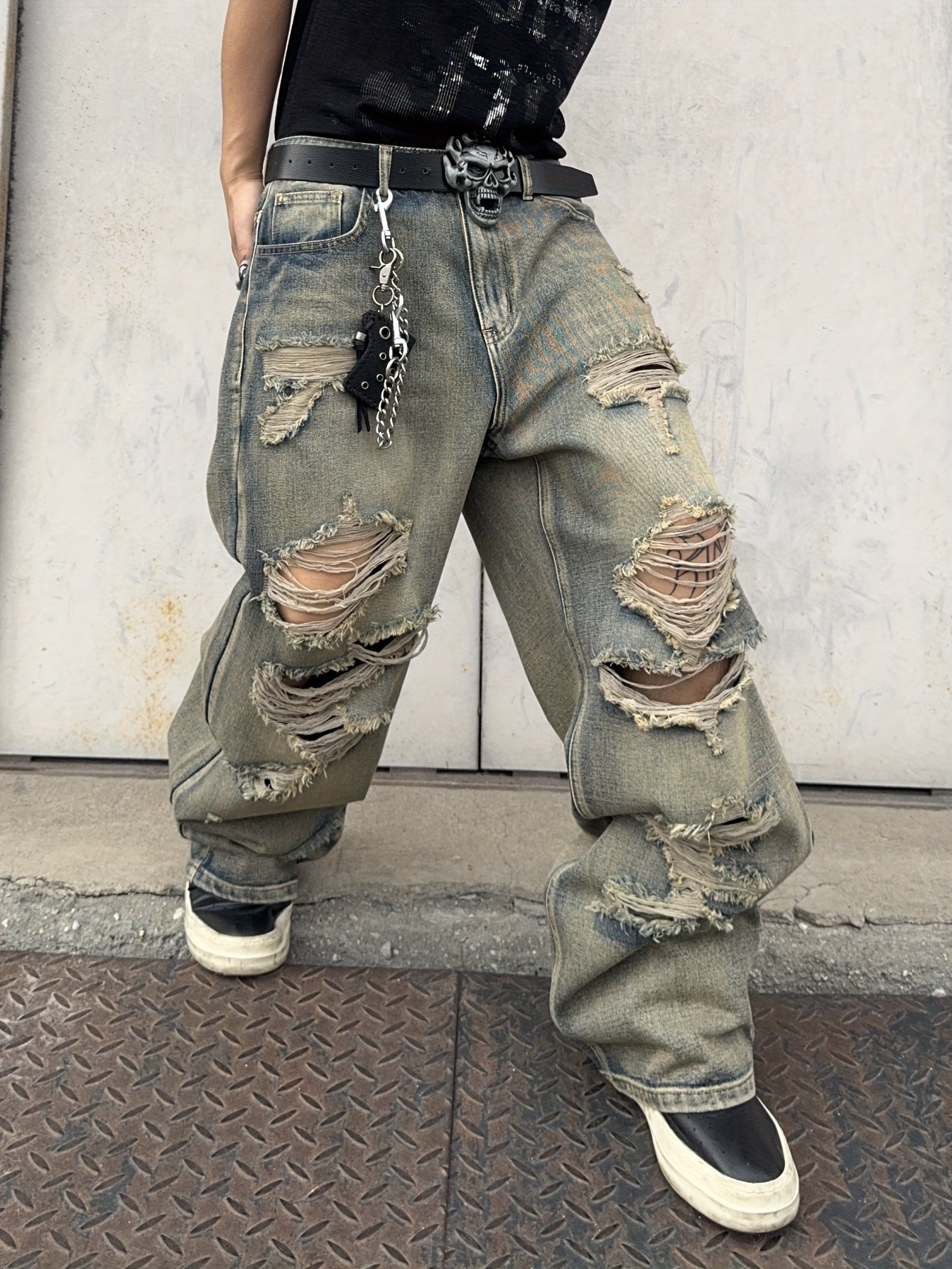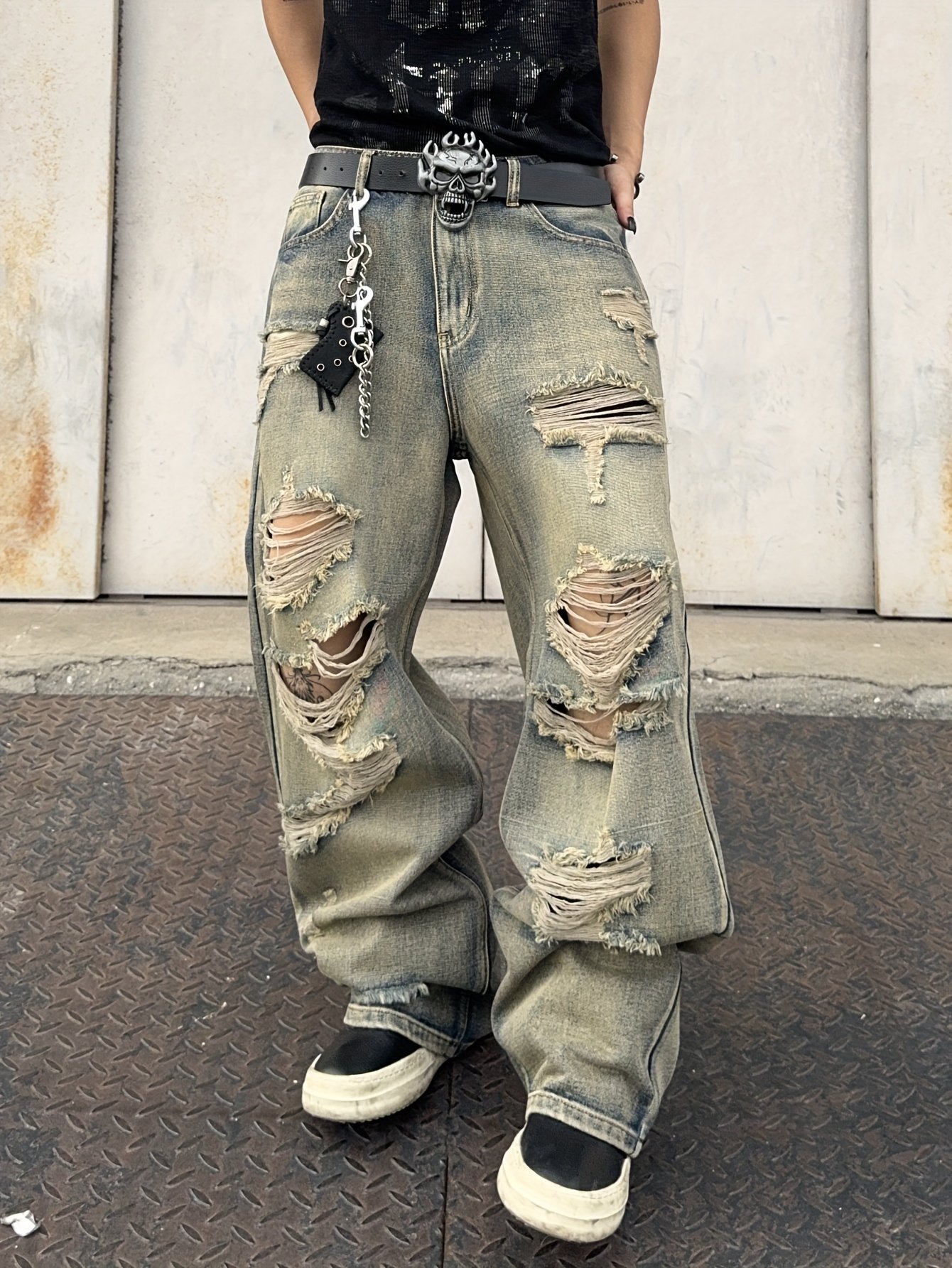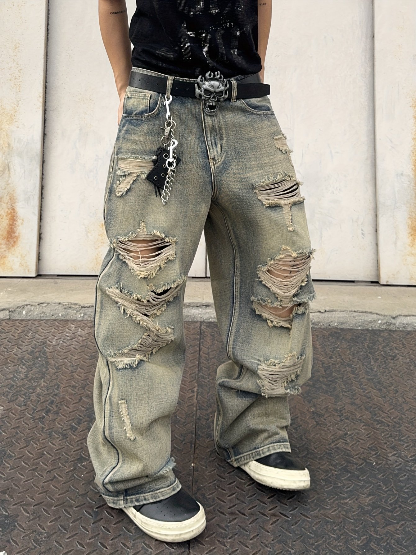 Men's Hip-Hop Loose Fit Wide-Leg Denim Pants, Beltless Skater Jeans
