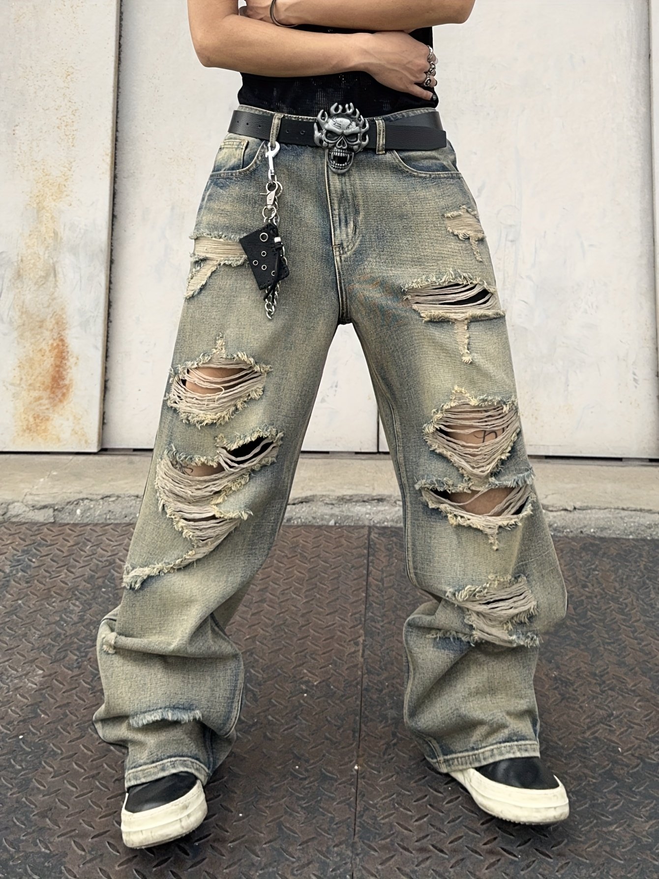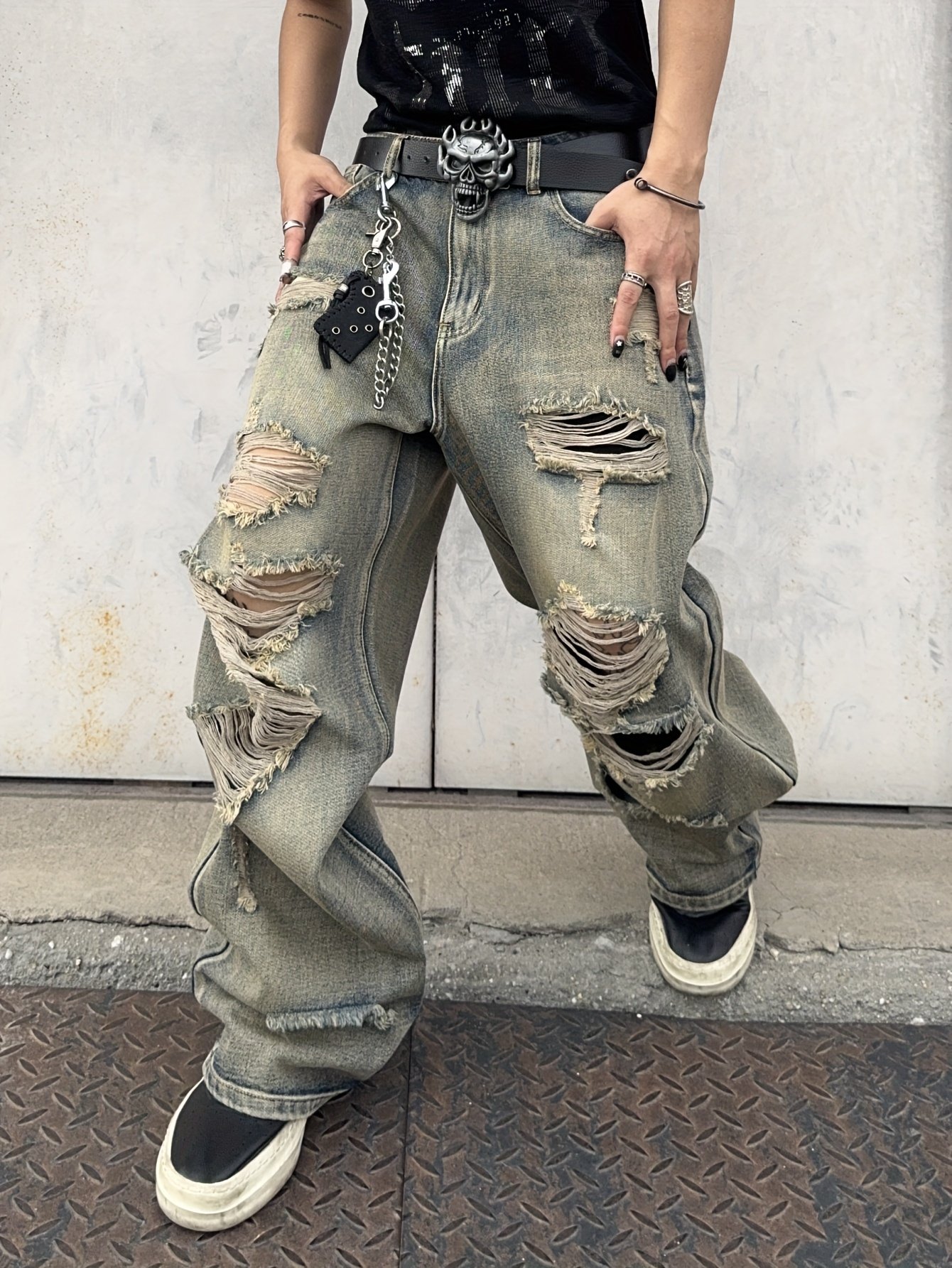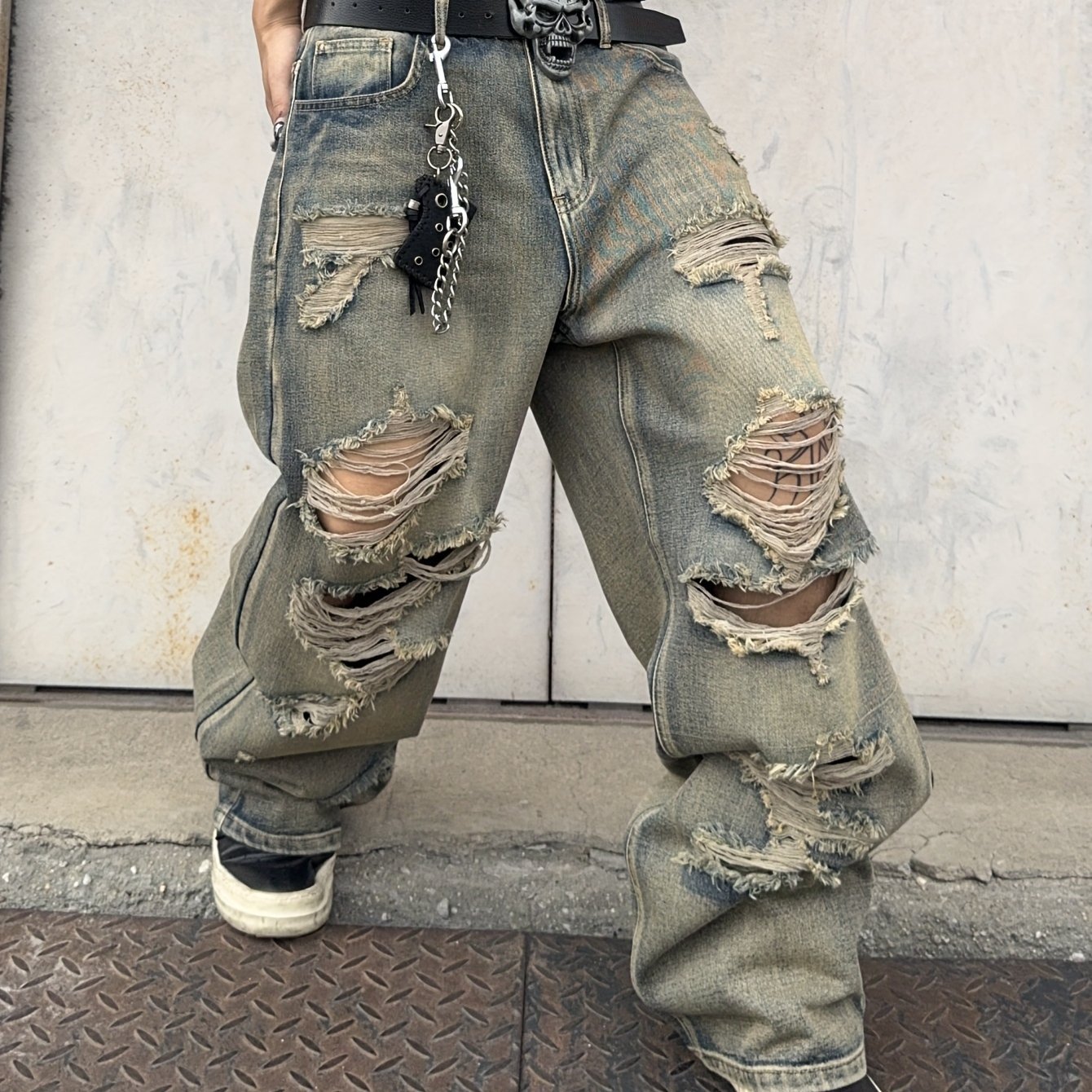 Men's Hip-Hop Loose Fit Wide-Leg Denim Pants, Beltless Skater Jeans