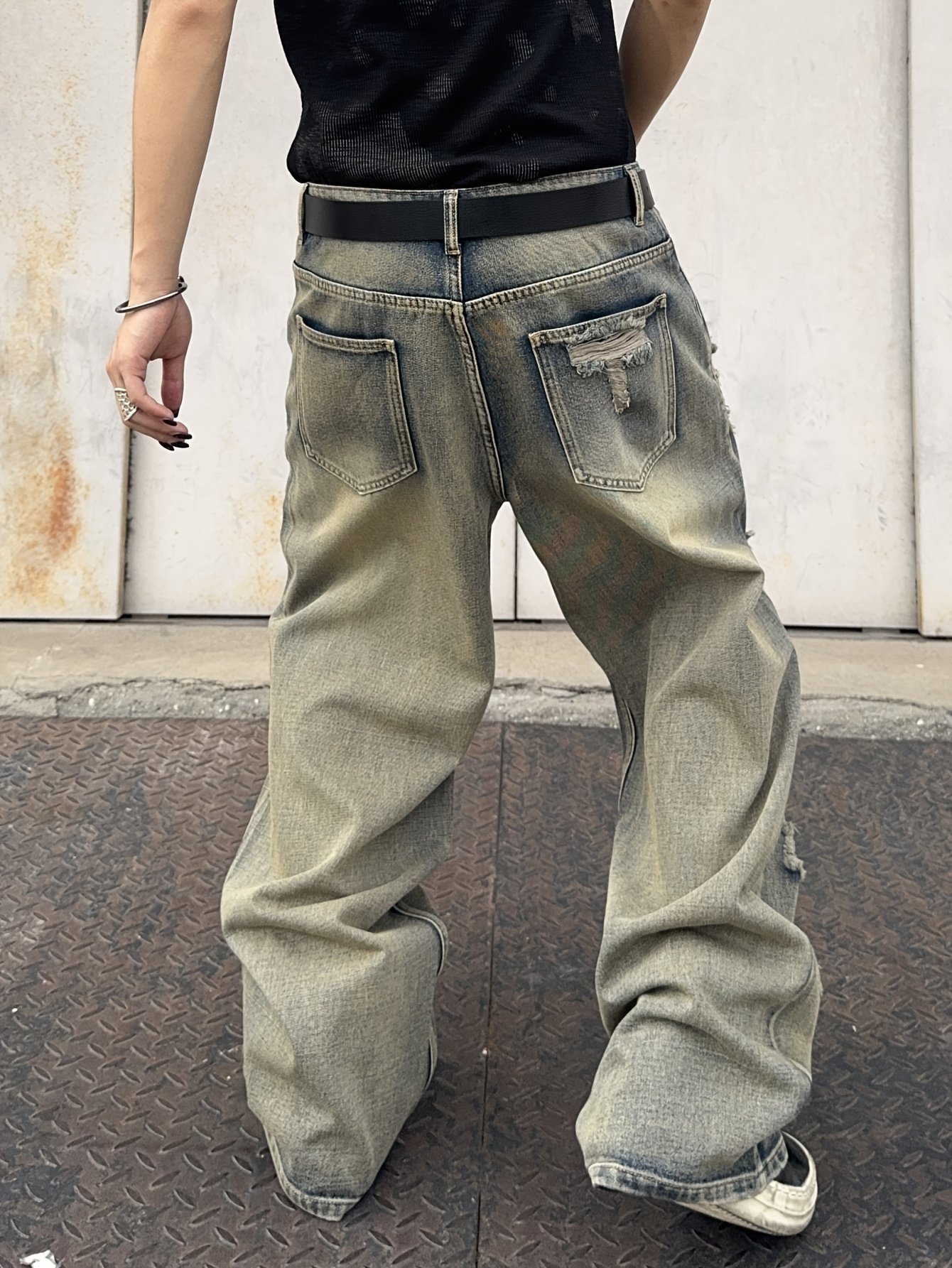 American High Trendy Frayed Patchwork Washed Distressed Men's Loose Fit Wide-Leg Jeans