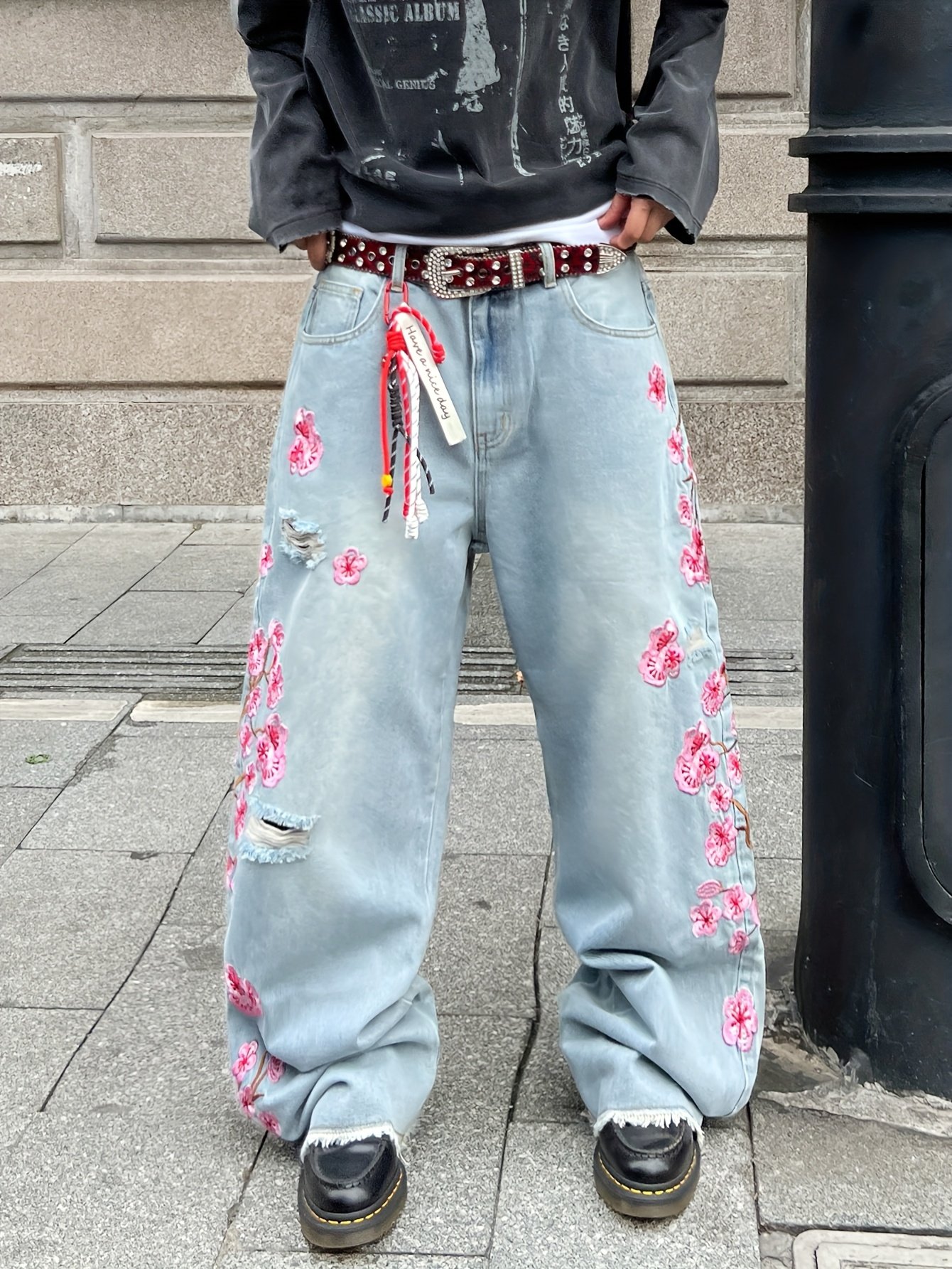 Men's Vintage Streetwear Wide-Leg Overalls Jeans – Heavy-Distressed Denim with Pink Cherry Blossom Embellishment, Mid-Rise Relaxed Fit Floor-Sweeping Trousers No Belt/Hardware, All-Season Casual Wear Machine Washable