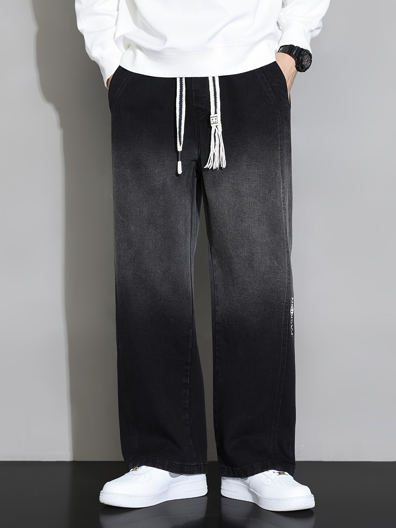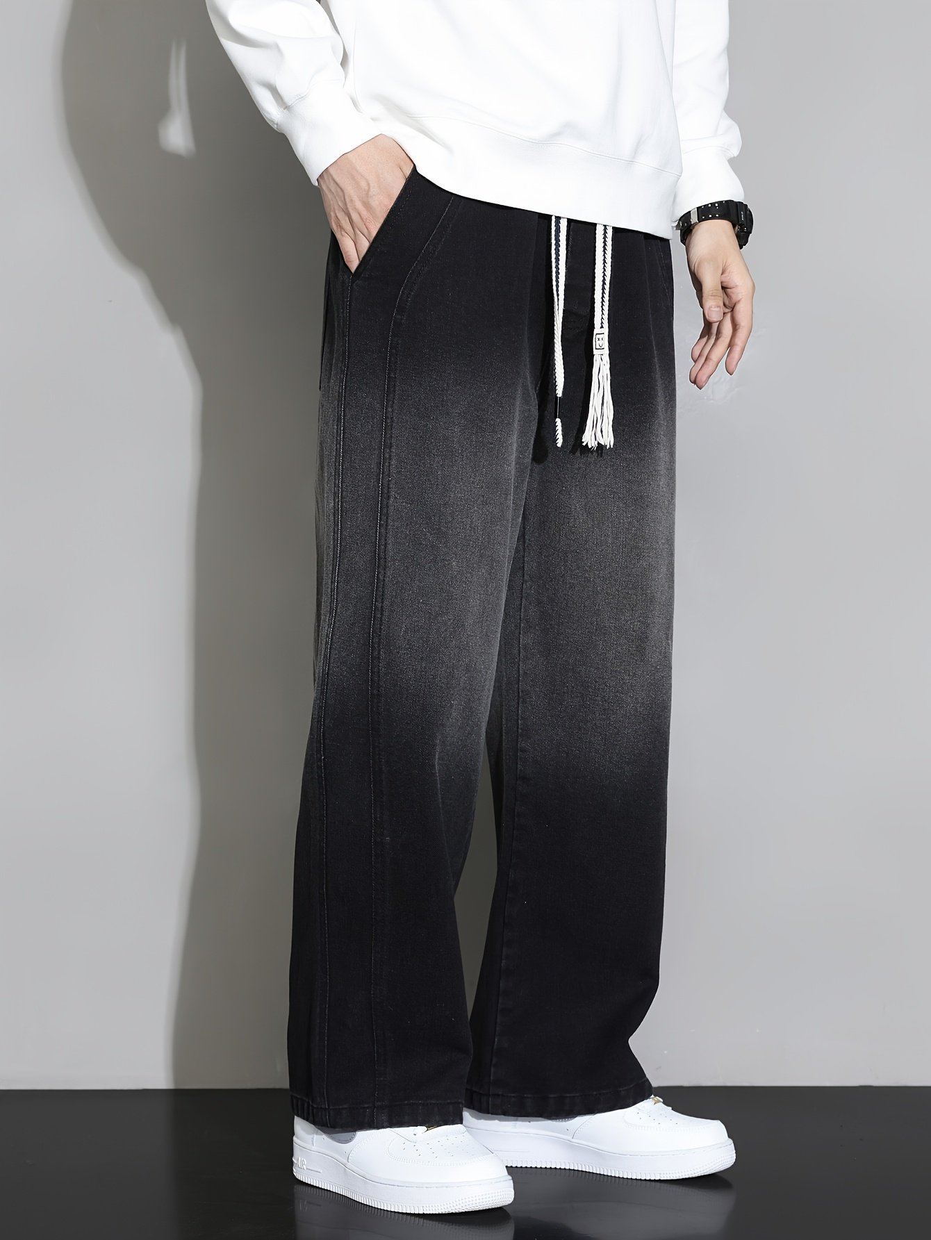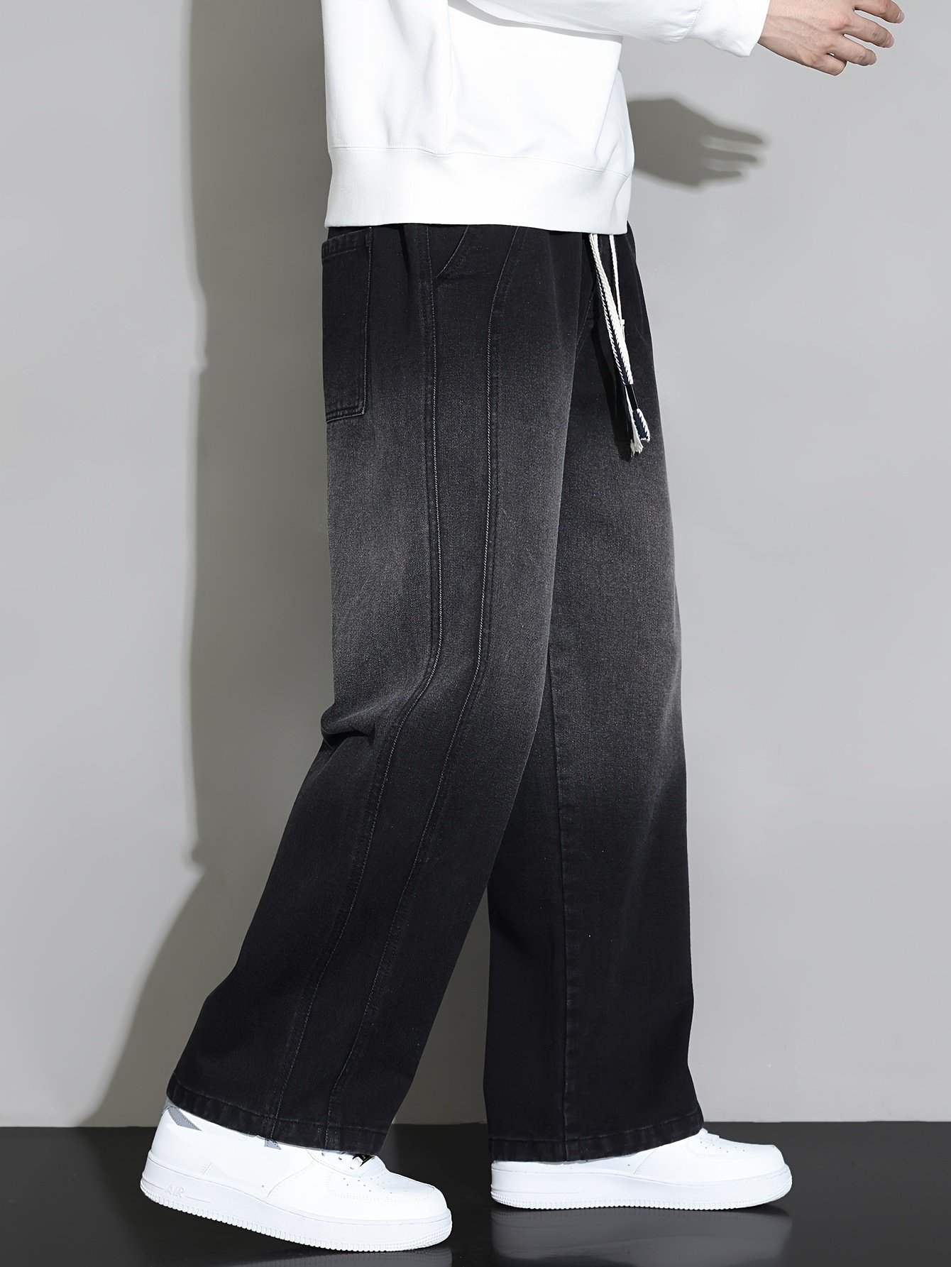 1pc New Men's Straight-Leg Loose-Fit Drawstring Elastic Waist Wide-Leg Casual Jeans for All Seasons