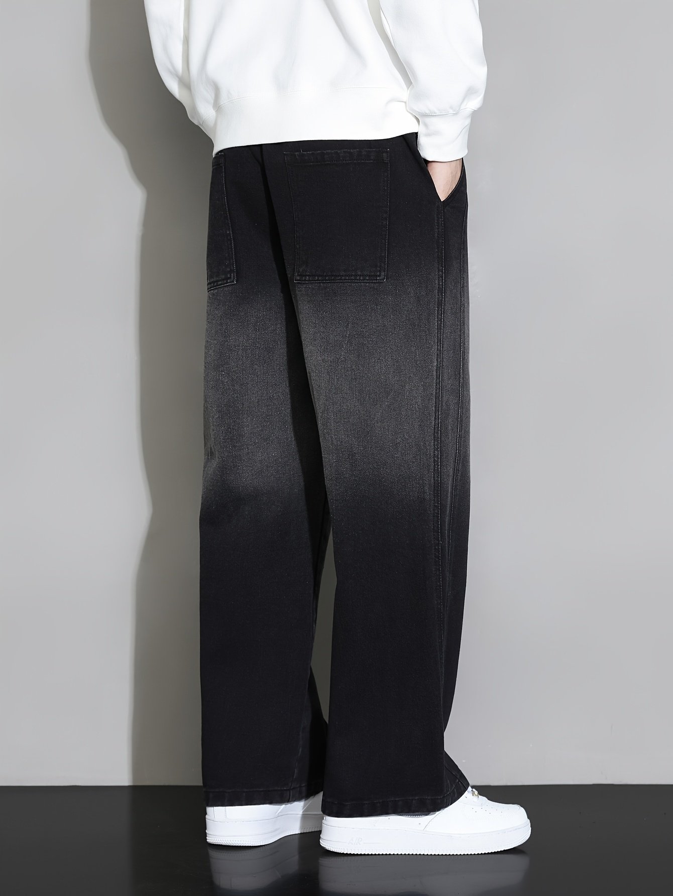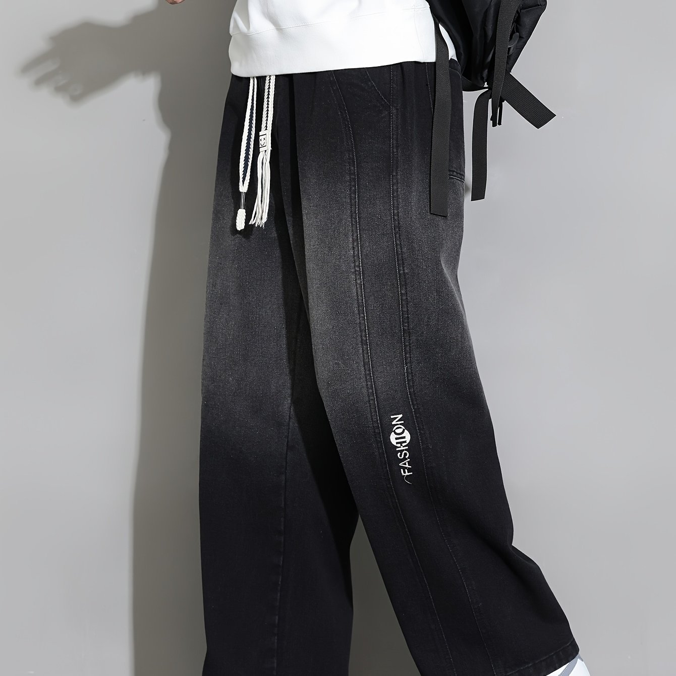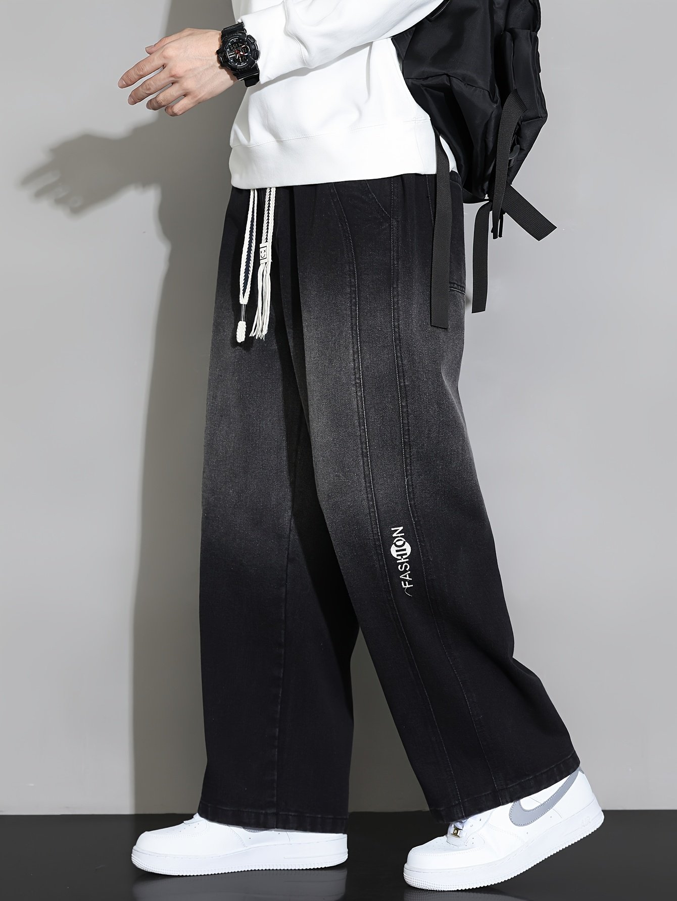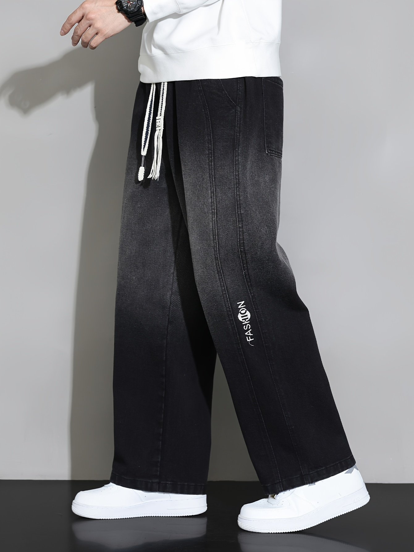 1pc New Men's Straight-Leg Loose-Fit Drawstring Elastic Waist Wide-Leg Casual Jeans for All Seasons