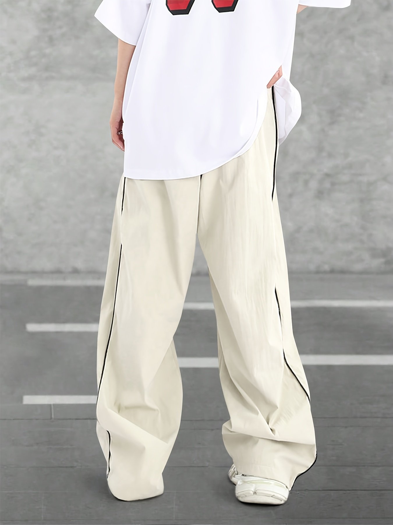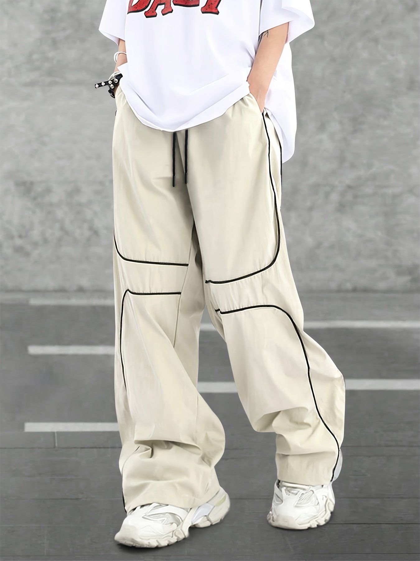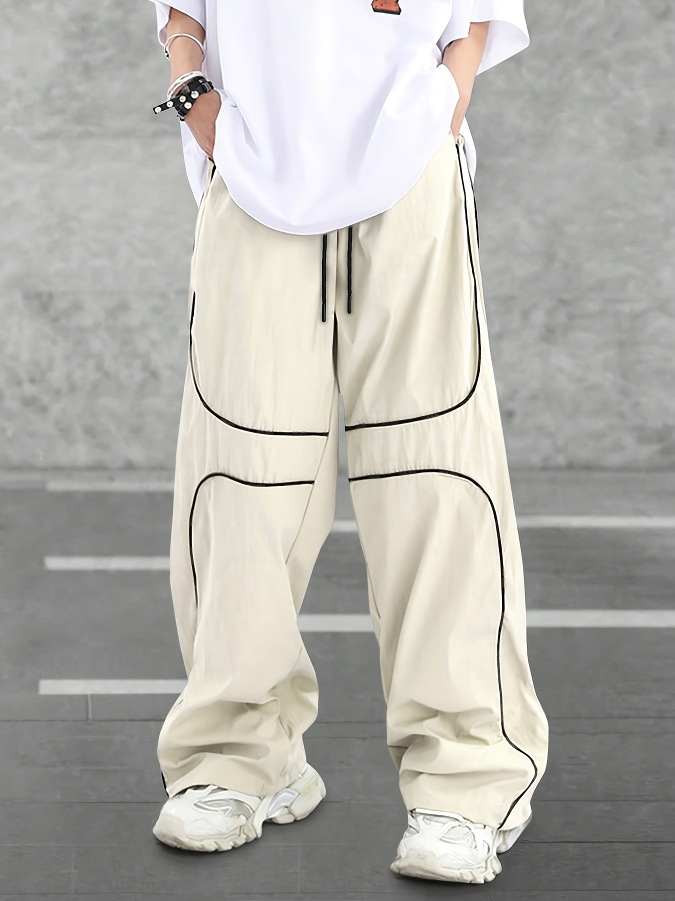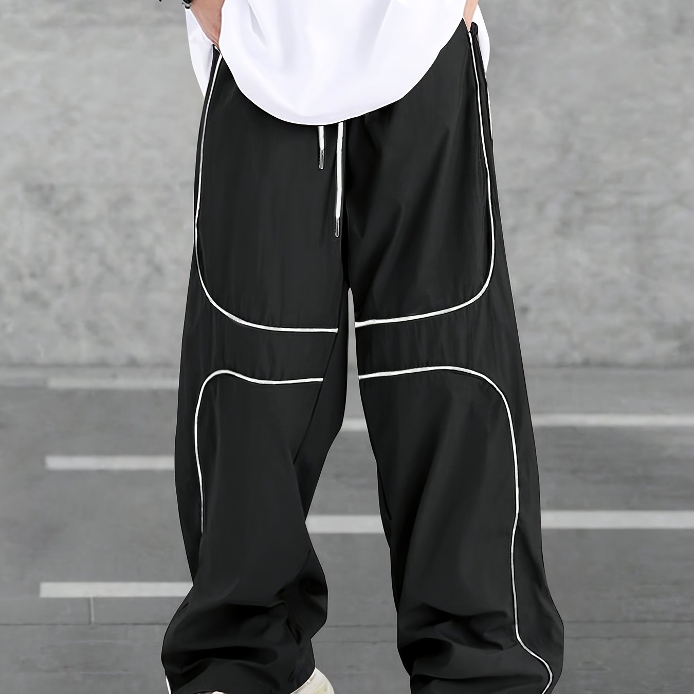 Men's Wide-Leg Trousers – Oversized Black Winter Pants with White Piping & Elastic Waist Drawstring, Thick Warm Casual & Formal Wear, Loose-Fit Full-Length Trousers for Fall/Winter,, or Everyday Use