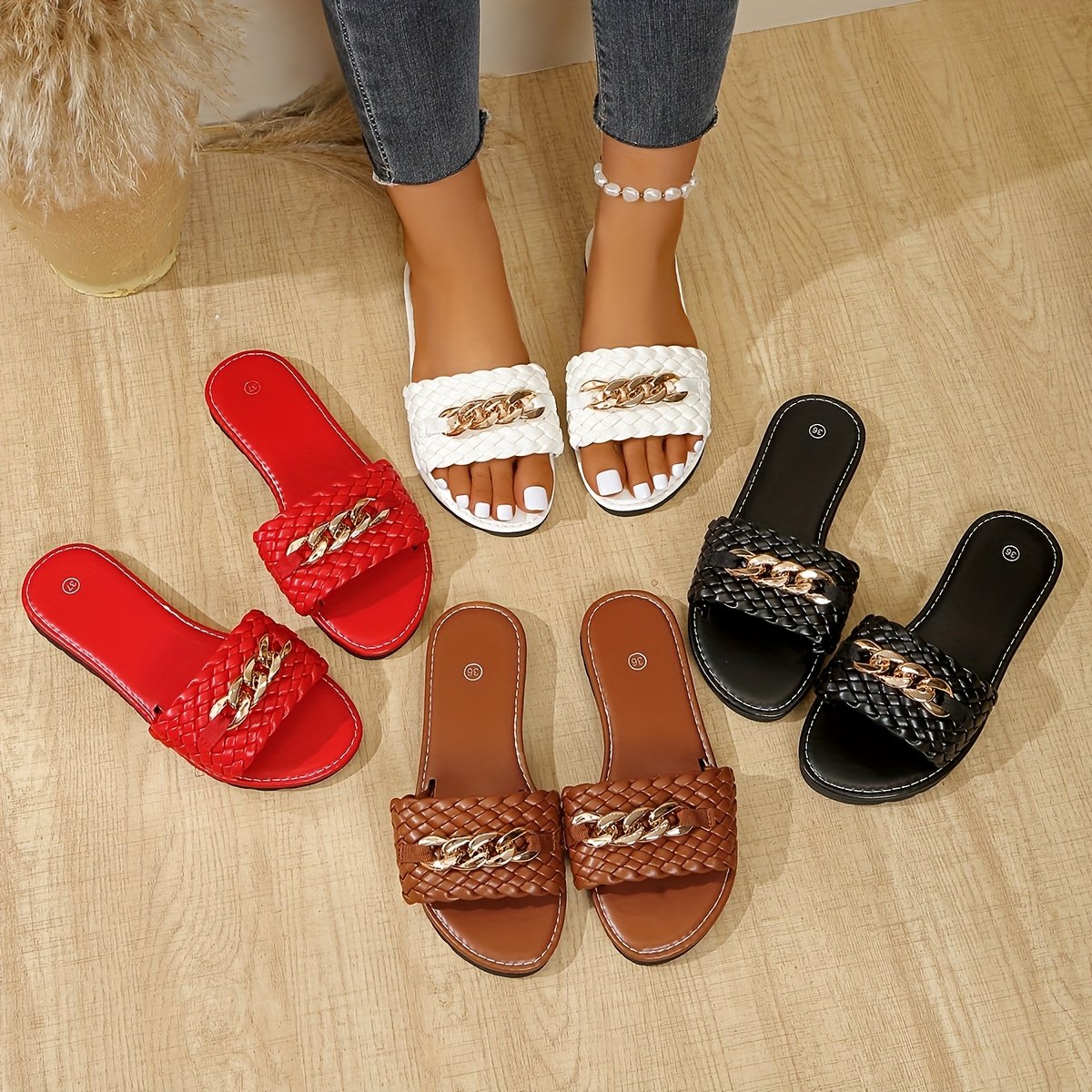 Women's Woven Slip-On Moccasin Slippers – Black & Golden Woven Texture, Flat with PU Sole, Open-Toe Design – Easy Care Fau Cover Casual for Beach, Home & Casual ttire, Womens Slides, Footwear For Women, Women Slippers, Women Slides, Slippers For Women Sum