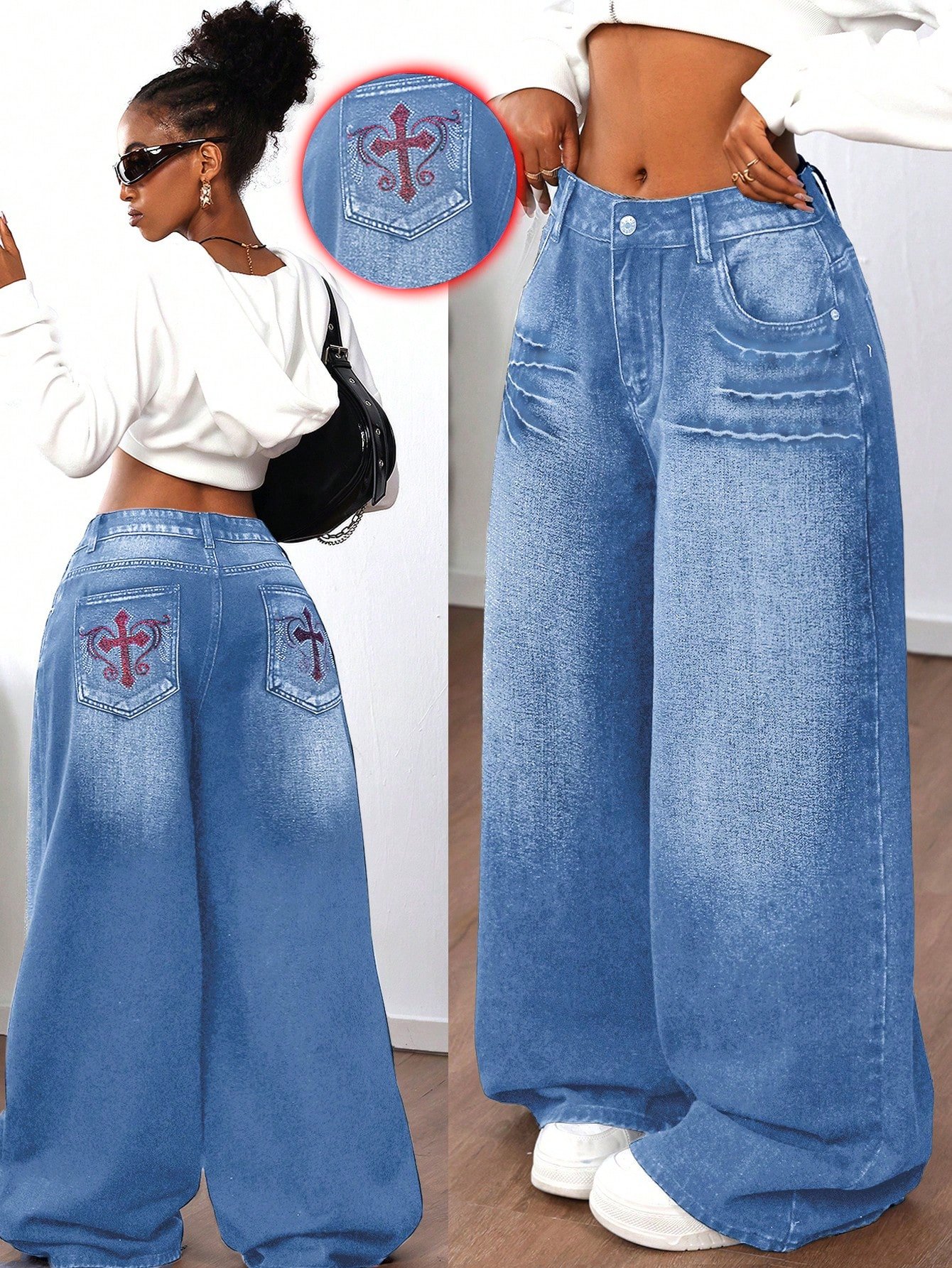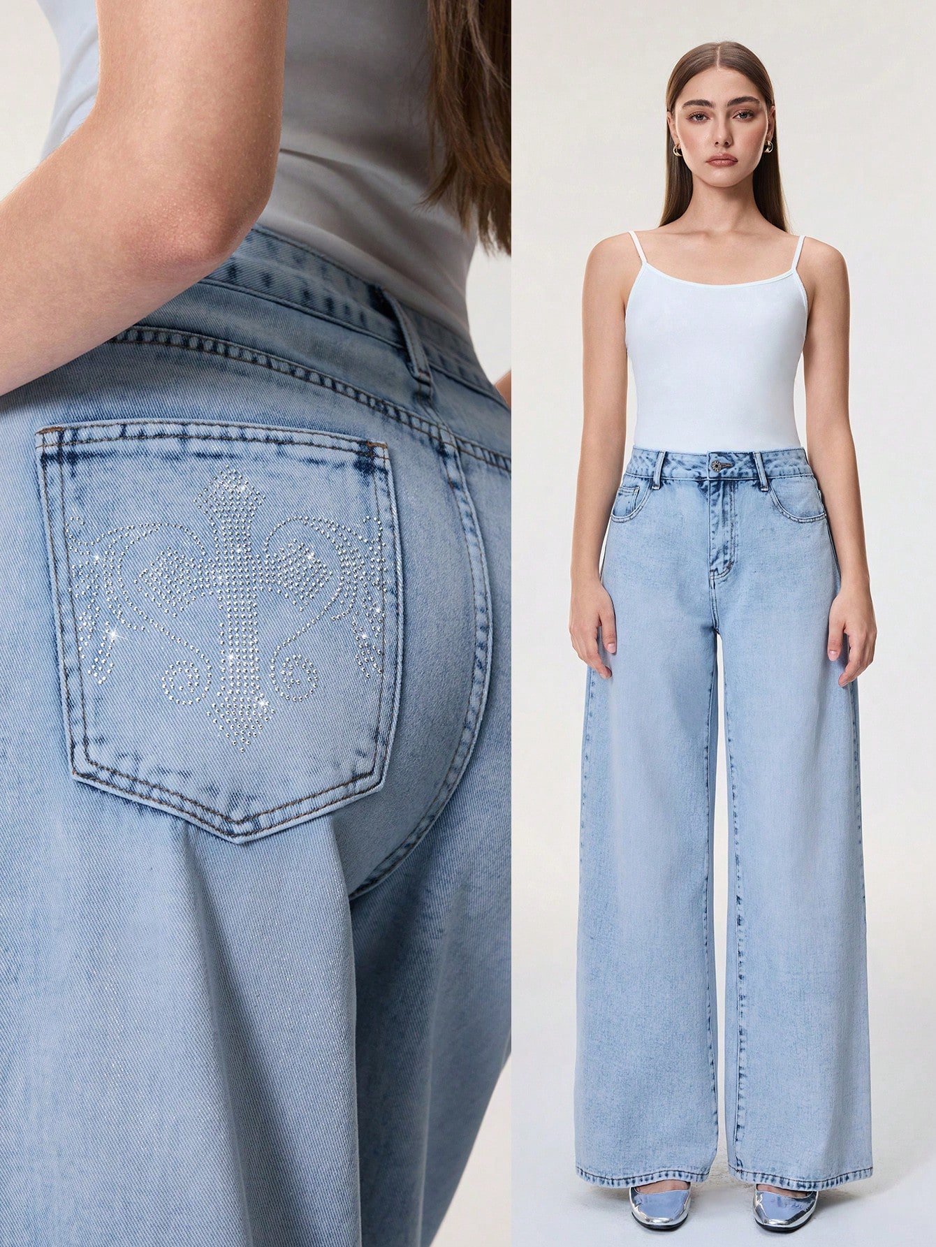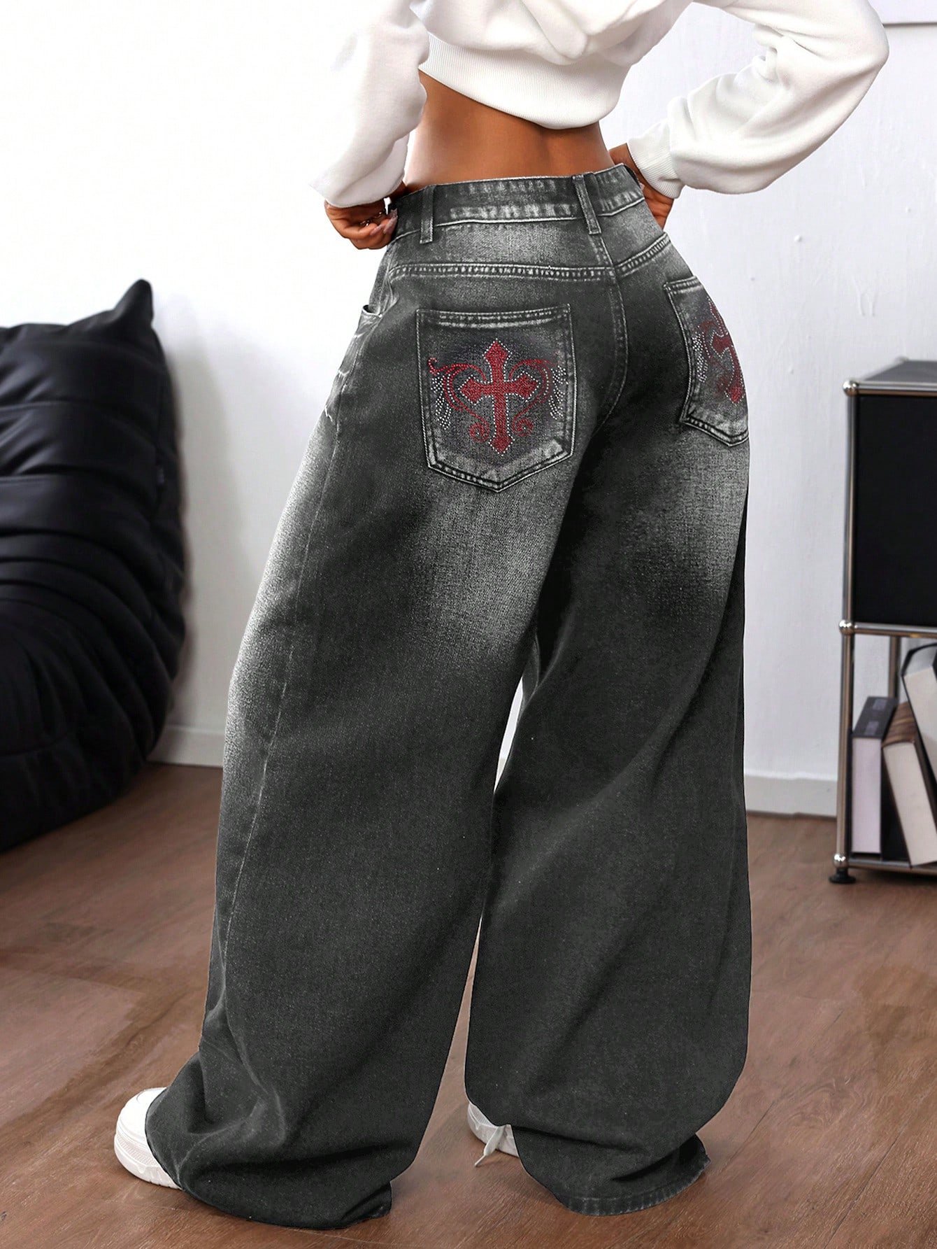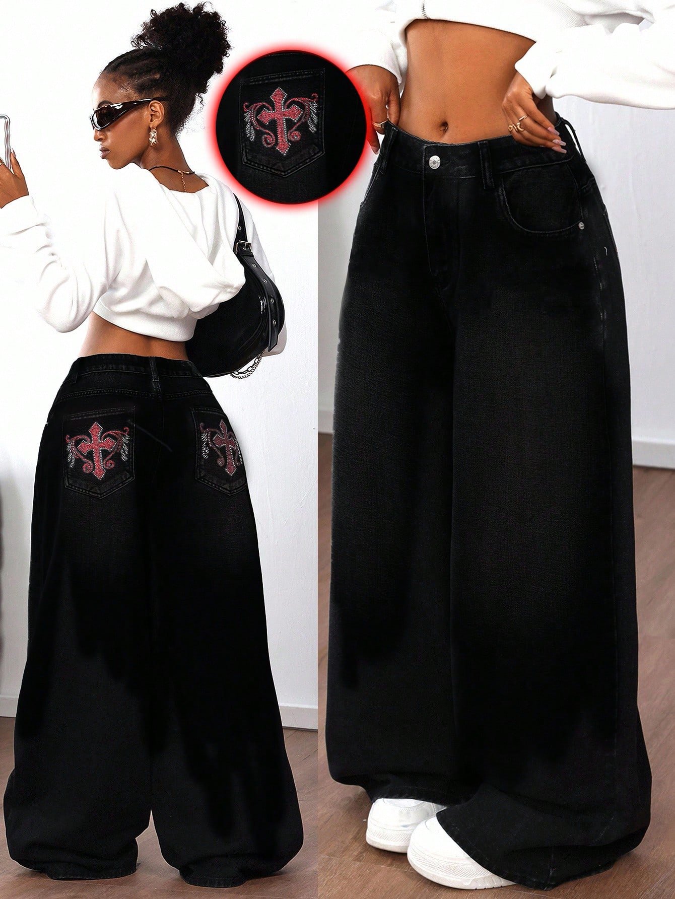 Be the first to review “SHEIN ICON Women's Rhinestone Cross Pocket Wide Leg Loose Casual Jeans” Cancel reply