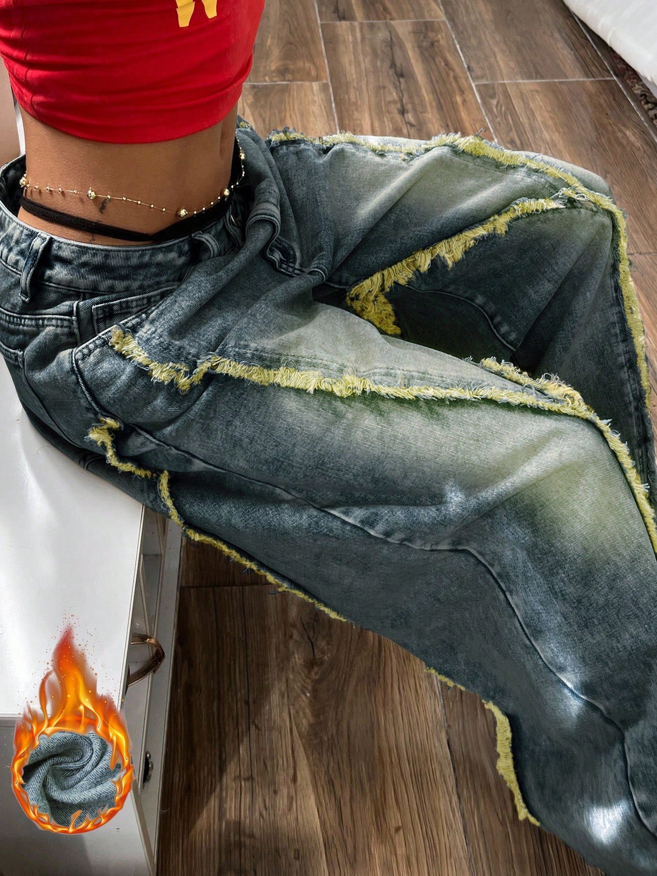 's High-Waisted Distressed Jeans-Like Straight-Leg Trousers – Vintage Blue Wash Ripped Wide-Leg Pants with Belt Loops & Frayed Hem, Non-Stretch -Like Texture for Casual & Formal Wear Machine Washable