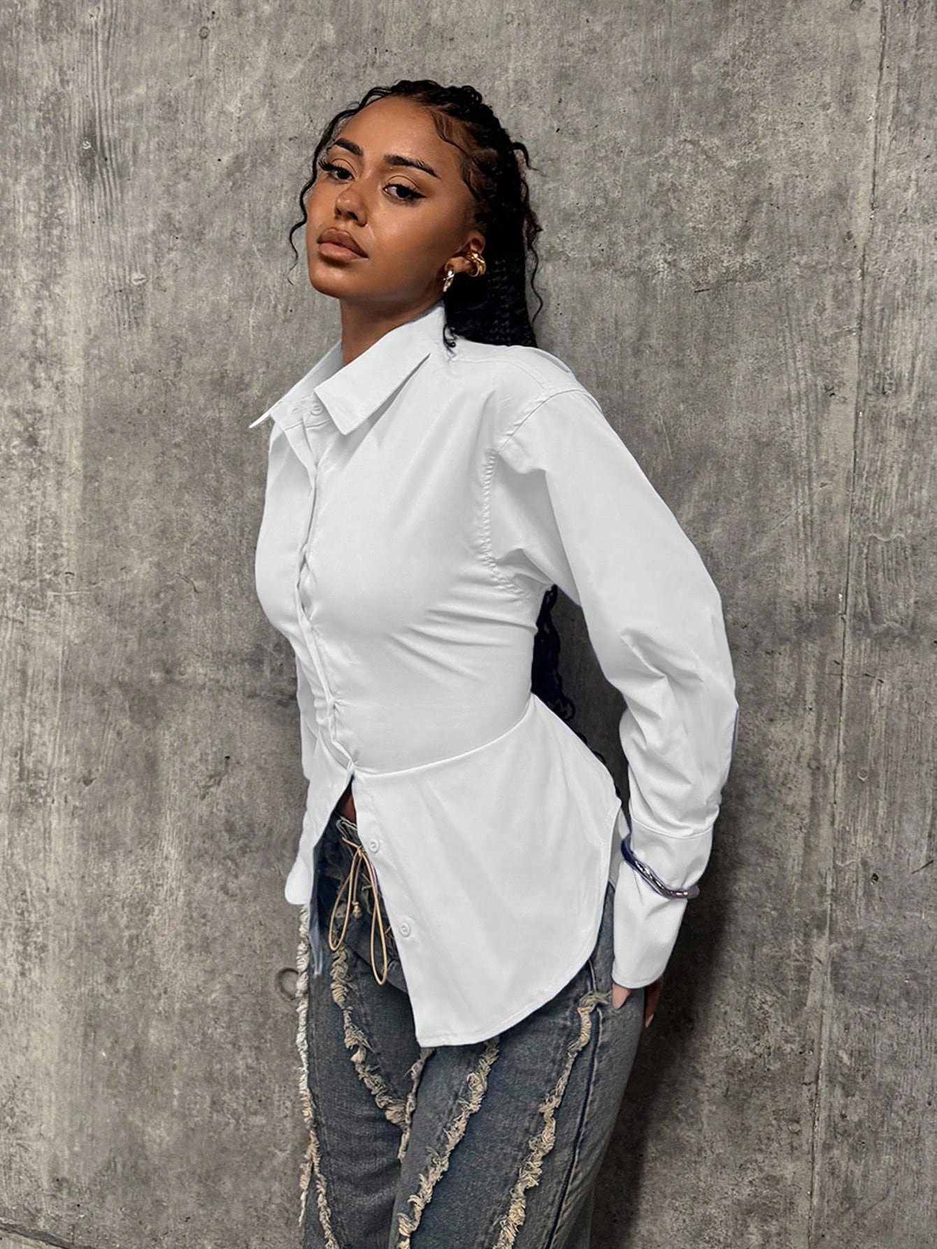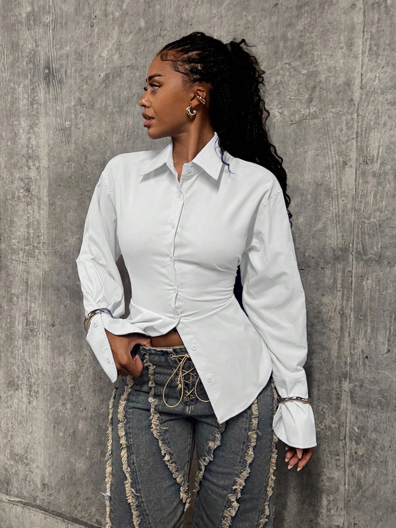 StreetHx Women's Blue Cinched Waist Y2K Baddie Streetwear 2000s Style Casual Commuter Back To School Long Sleeve Shirt Blouse