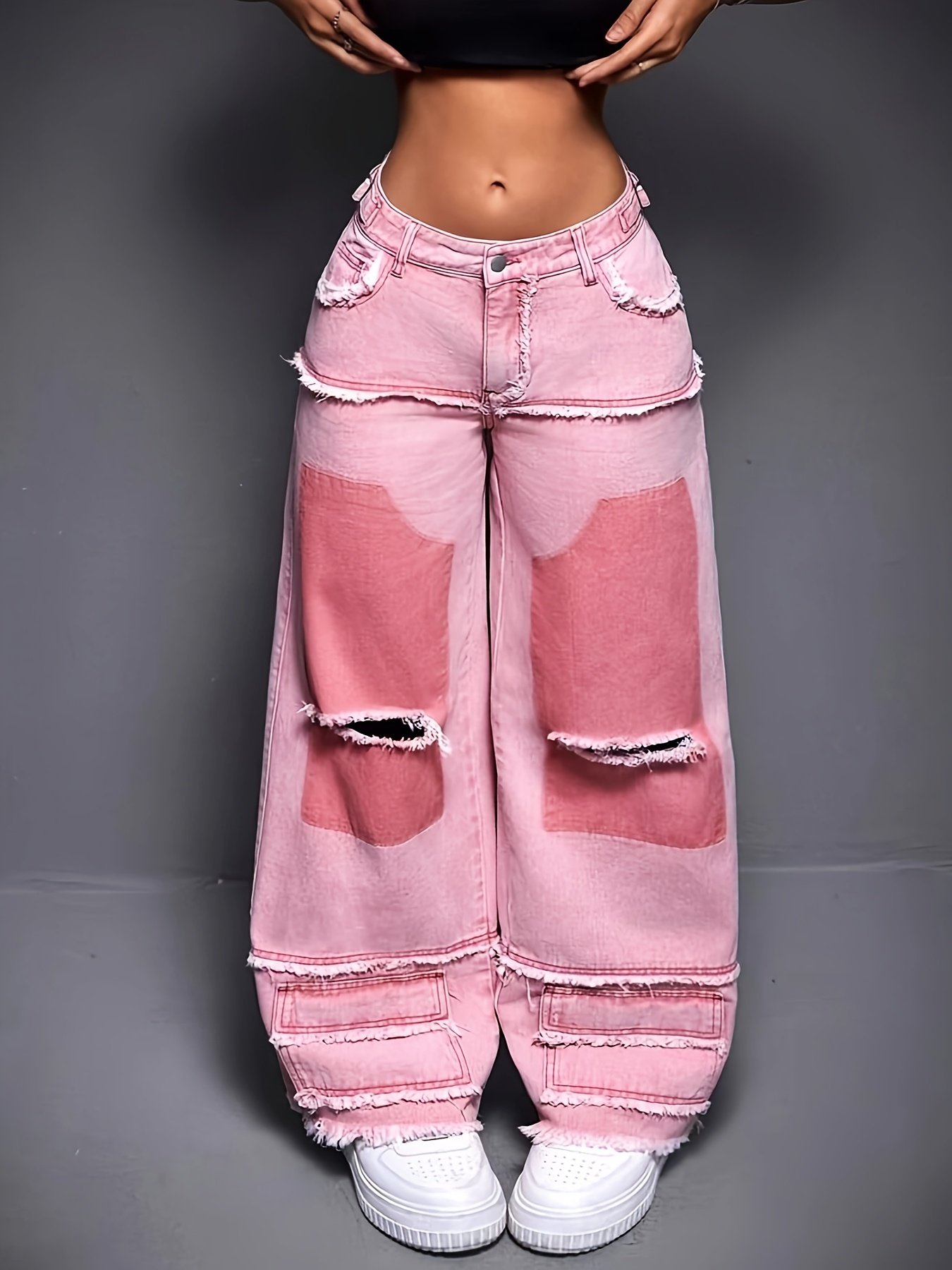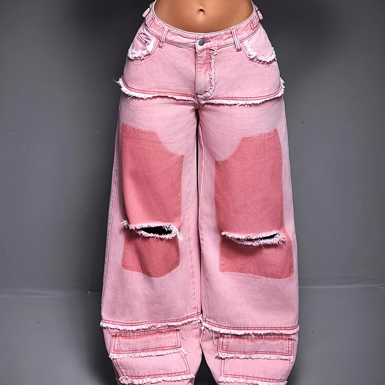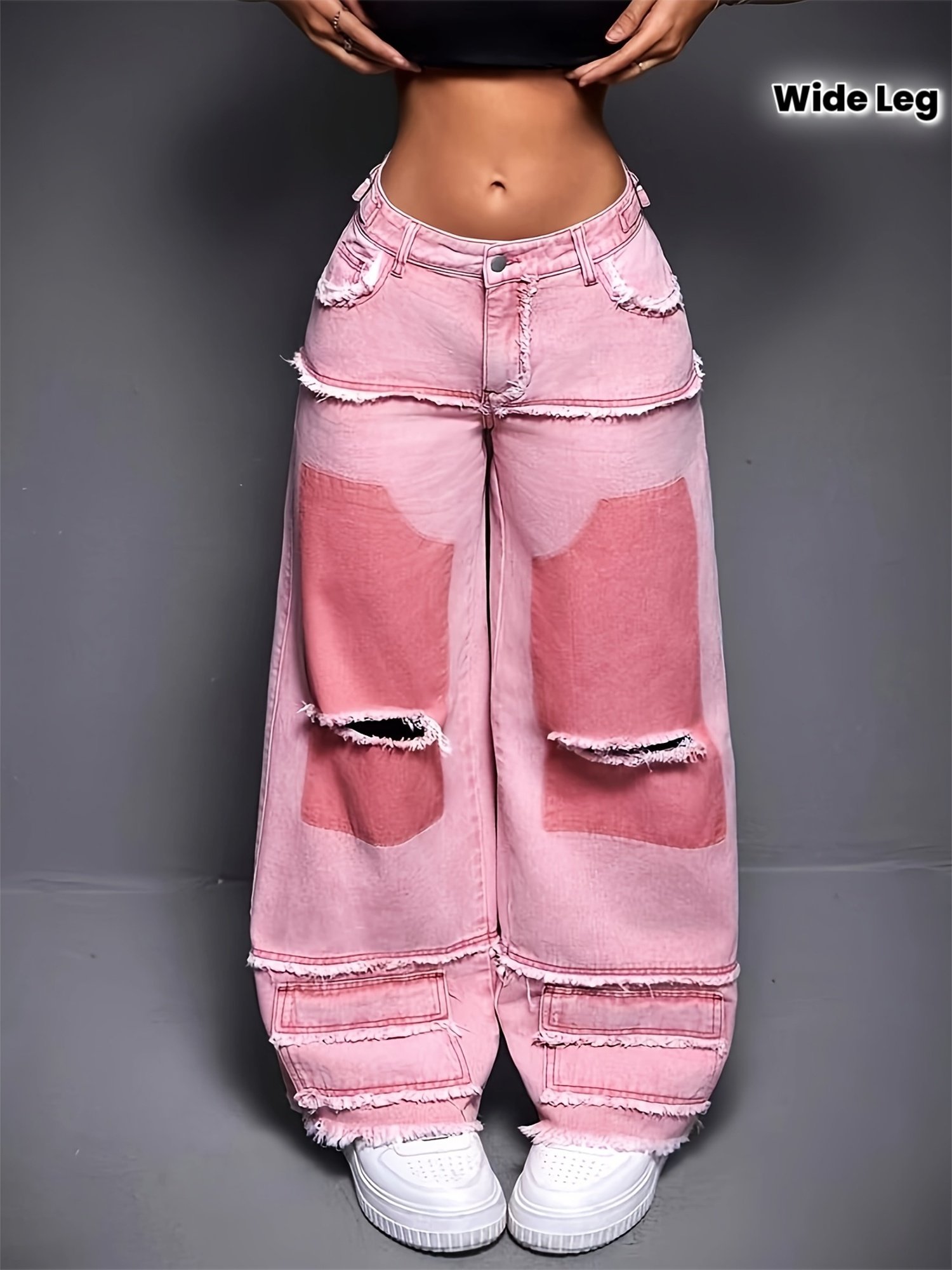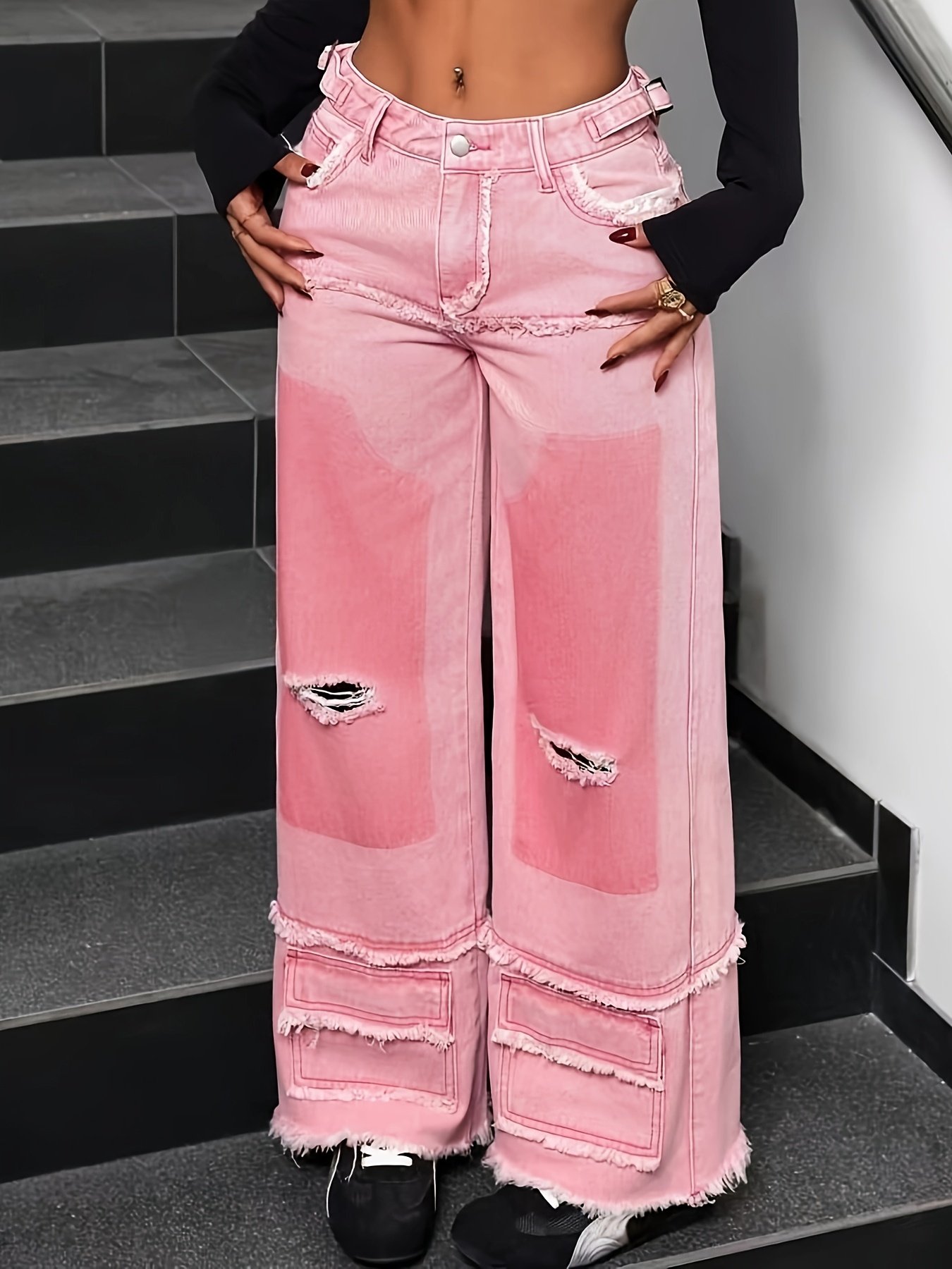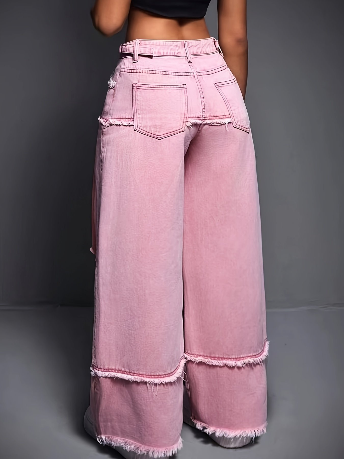 Women's High-Waisted Wide-Leg Jeans with Frayed Hem & Adjustable Mid-Rise – Premium Washed Pink Denim, Casual Streetwear Style, Machine Washable for All-Season Comfort, Ladies Jeans, Casual Attire, Trendy Denim, Durable Fabric, Stylish Bottoms, Denim Love