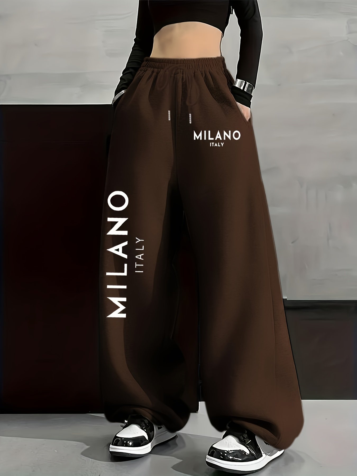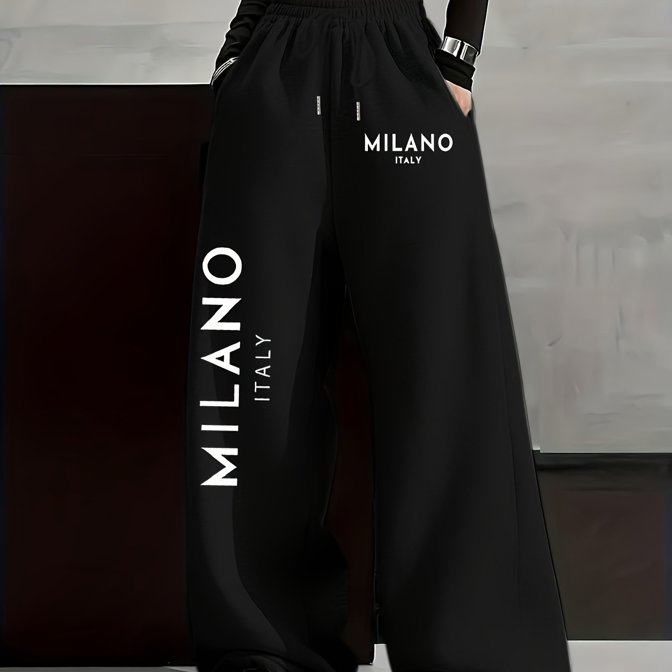 MILANO ITALY Left Large Right Small Print, Autumn Winter Fashion Casual Women's -Lined Long Pants, Solid Color Drawstring s Pants, Casual Loose Fit Sweatpants, Women's Fashion