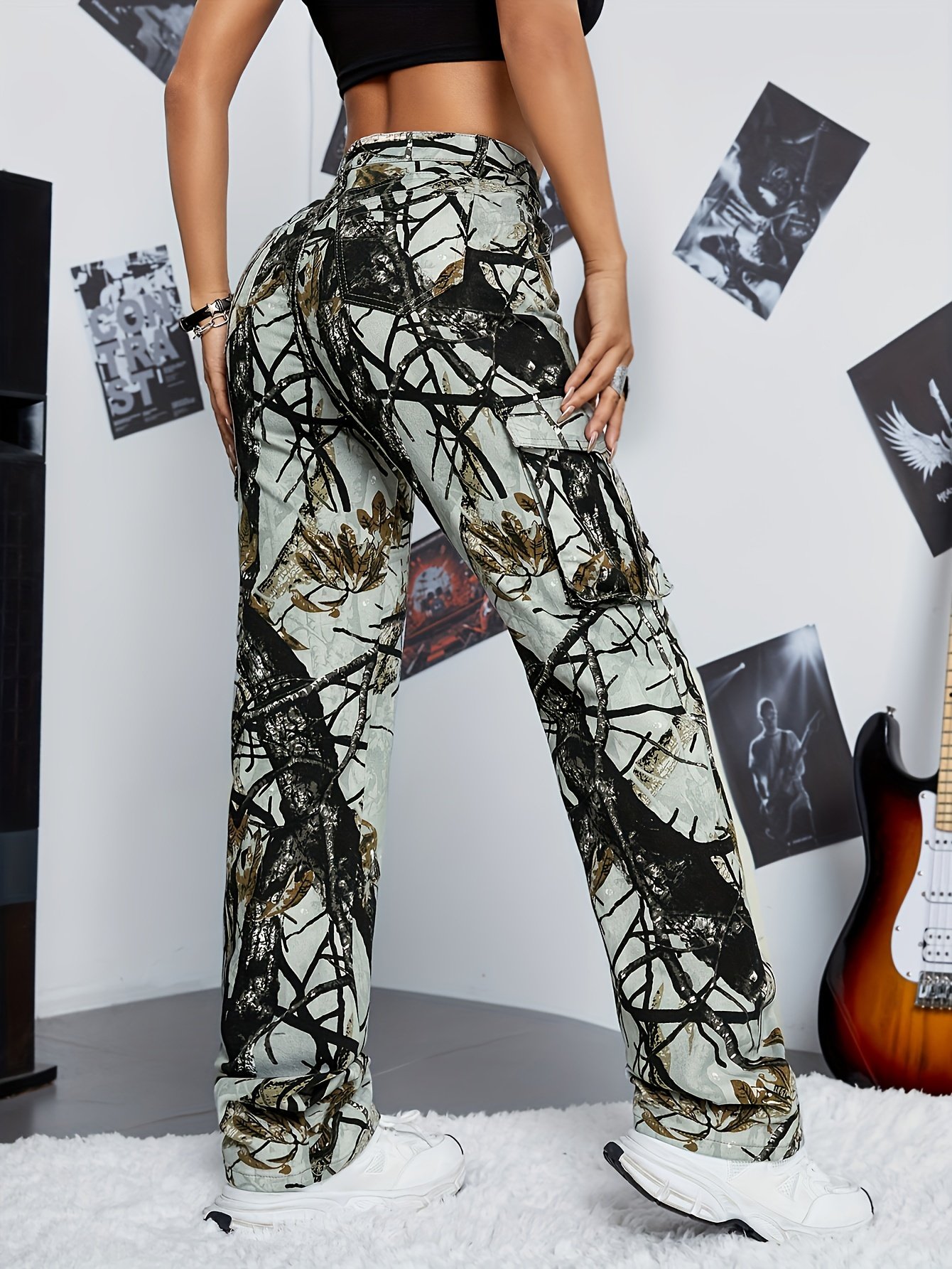 Women'S Stretchy Plaid Camouflage Cargo Straight-Leg Jeans